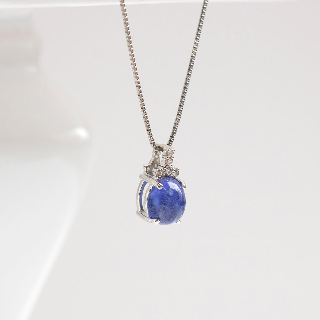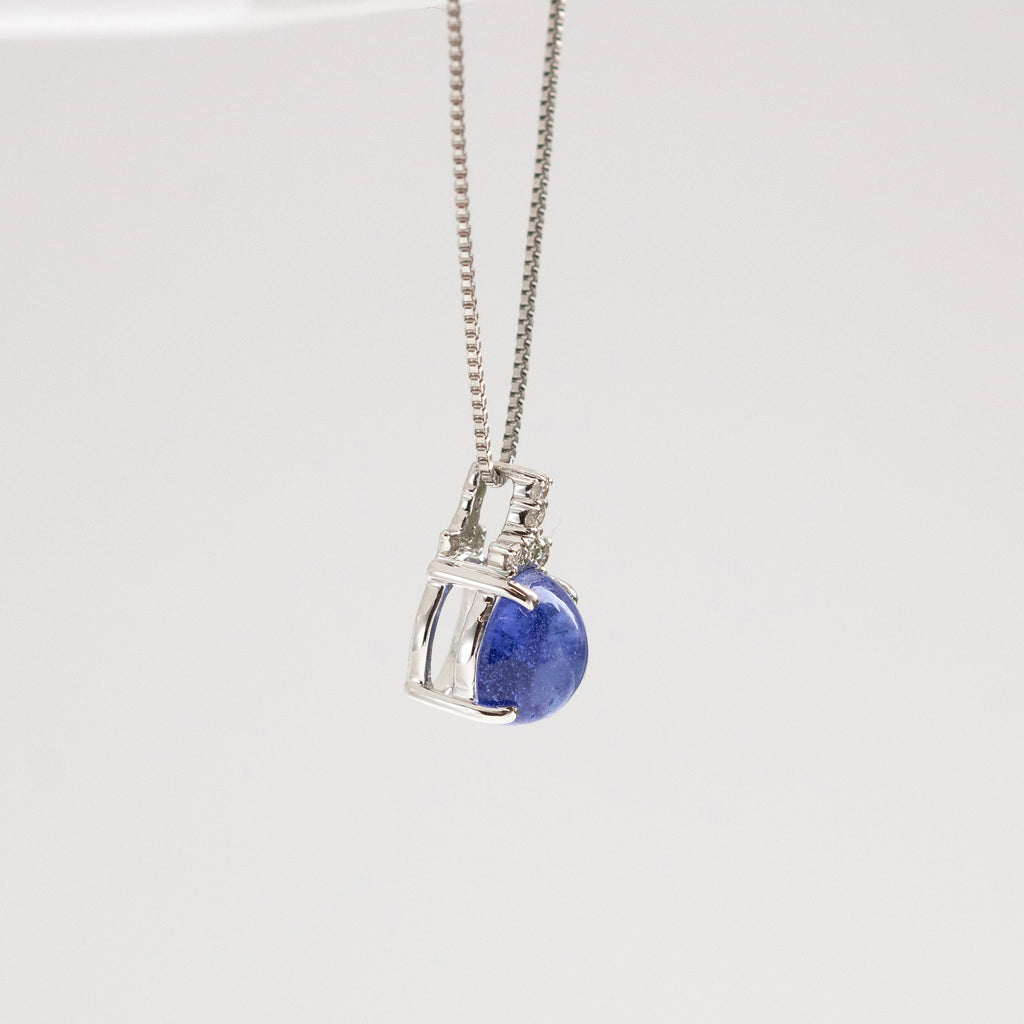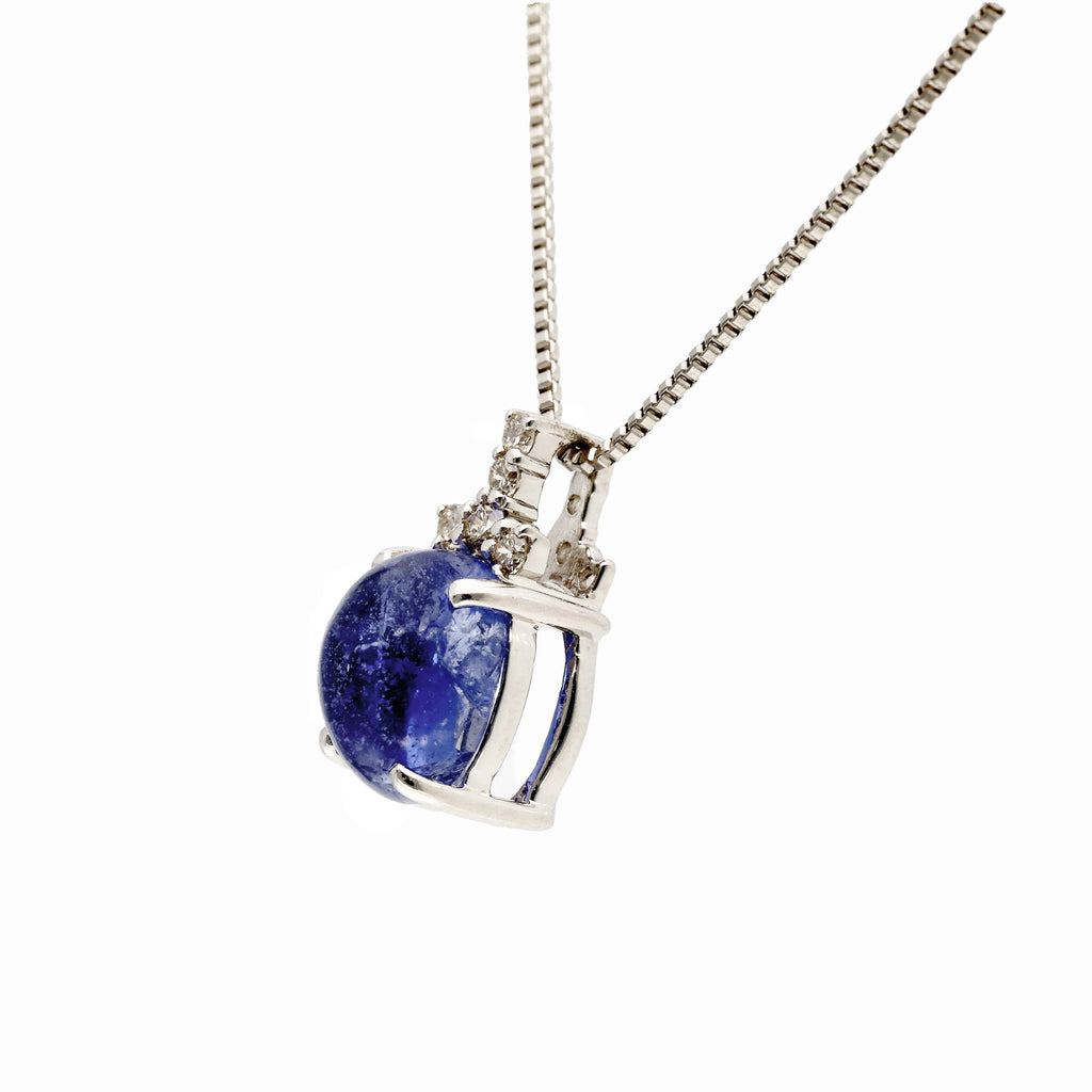 ふっくらとしたカボションカットが愛嬌を感じさせる石を、チェーンを通すバチカンにメレダイヤを留めたシンプルなデザインのネックレスに仕立てました。