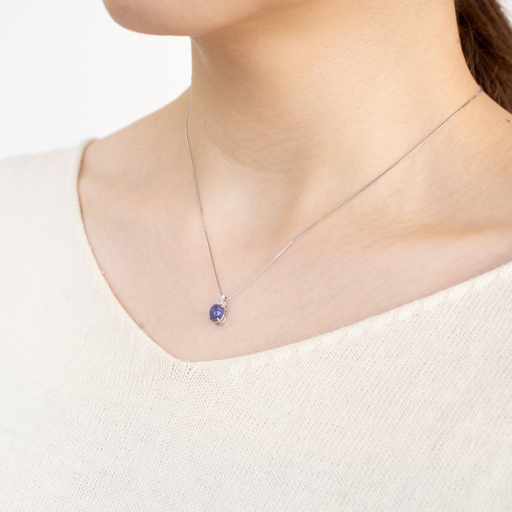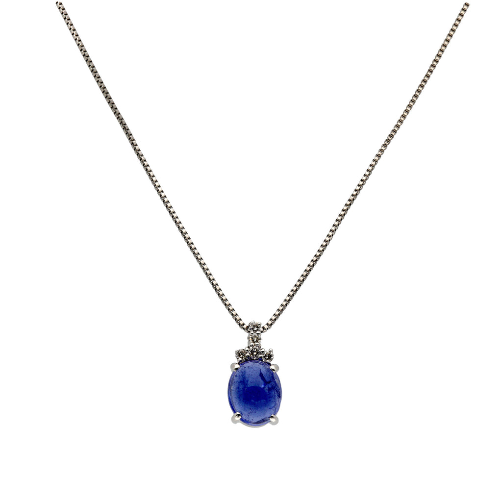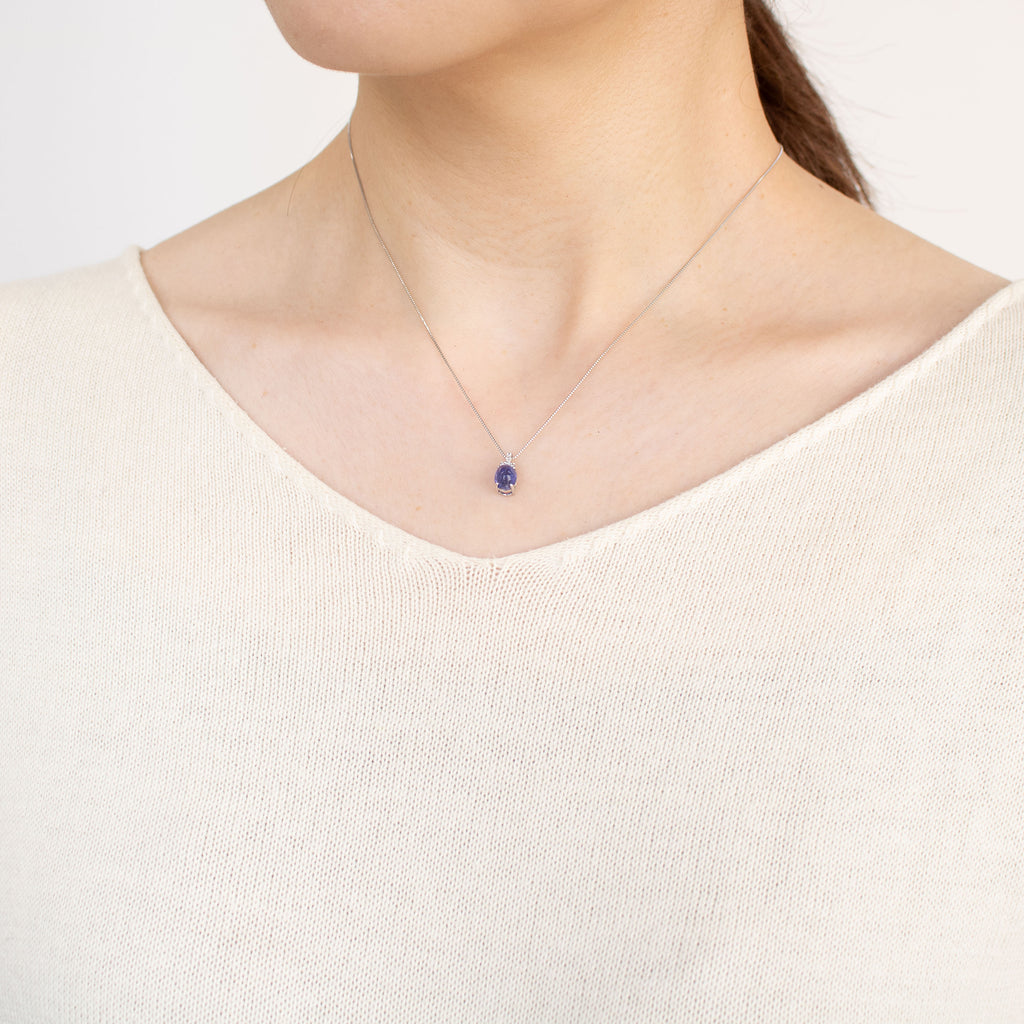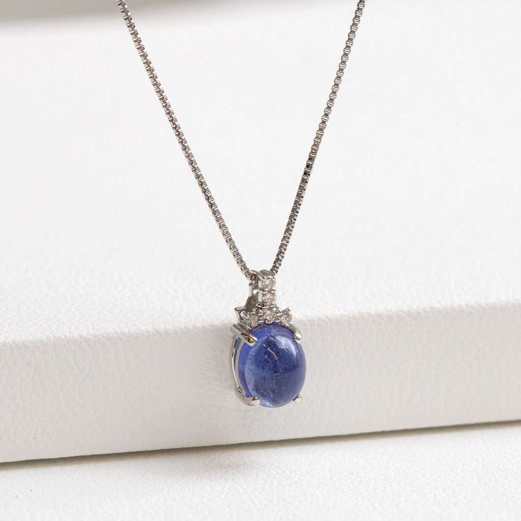 ふっくらとしたカボションカットが愛嬌を感じさせる石を、チェーンを通すバチカンにメレダイヤを留めたシンプルなデザインのネックレスに仕立てました。