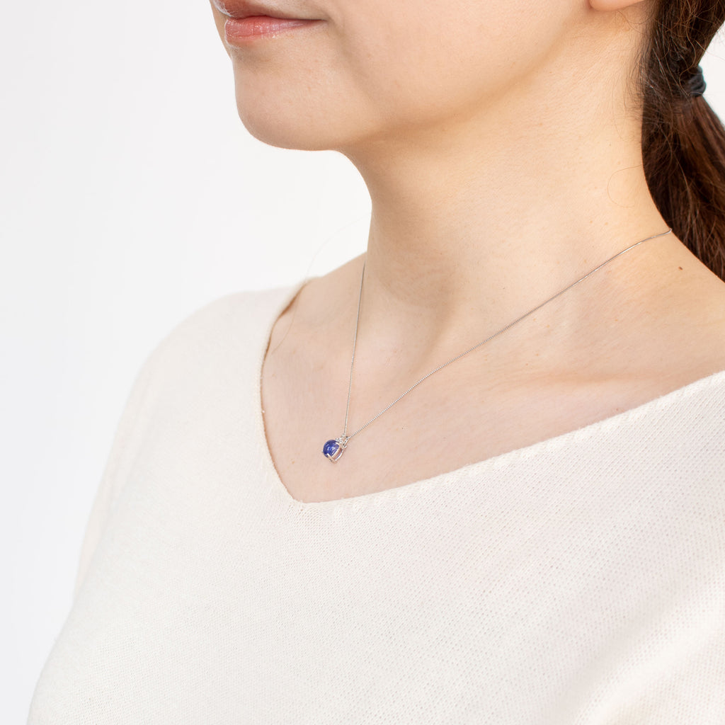 このネックレスに使われているのはラピスラズリの瑠璃色に通じる美しいブルーのソーダライト。さらに珍しい特徴として紫外線を当てると美しいピンク色に発色します。