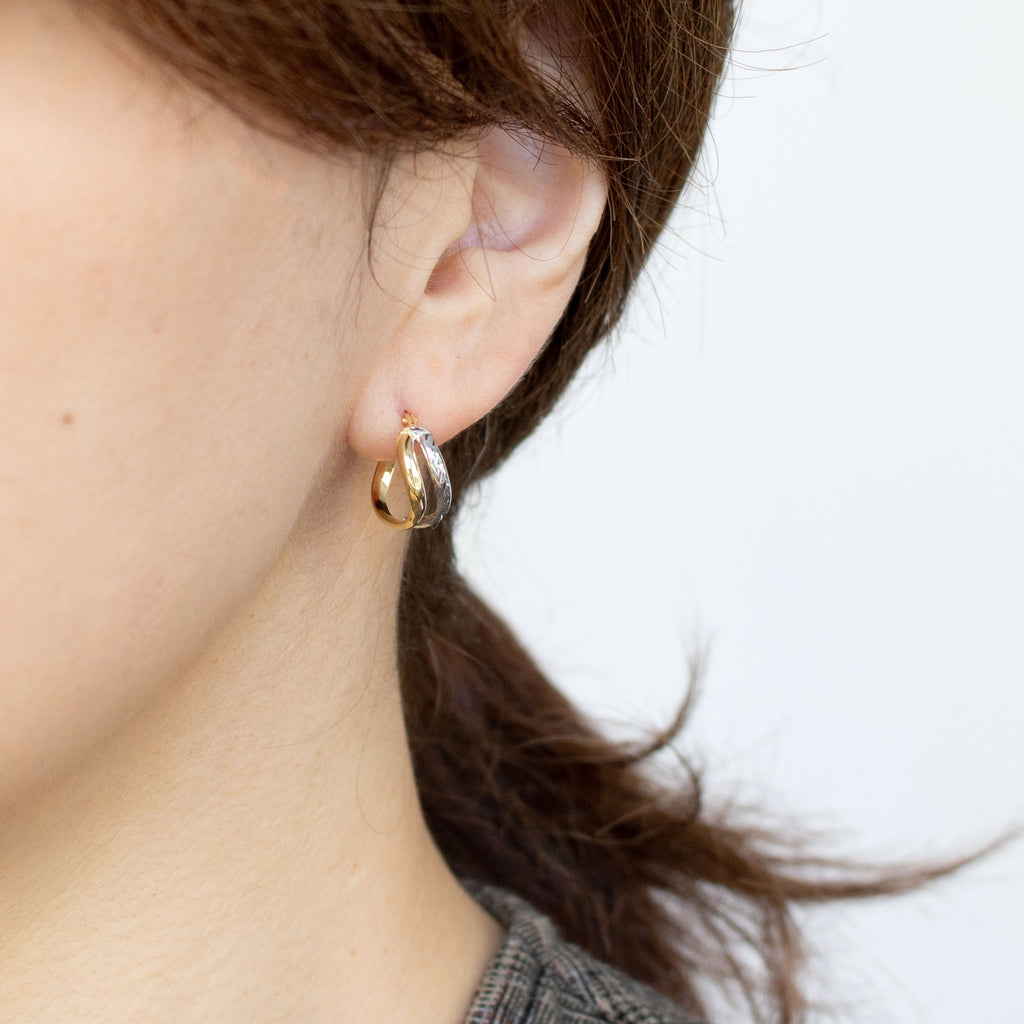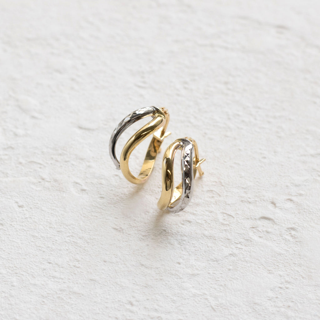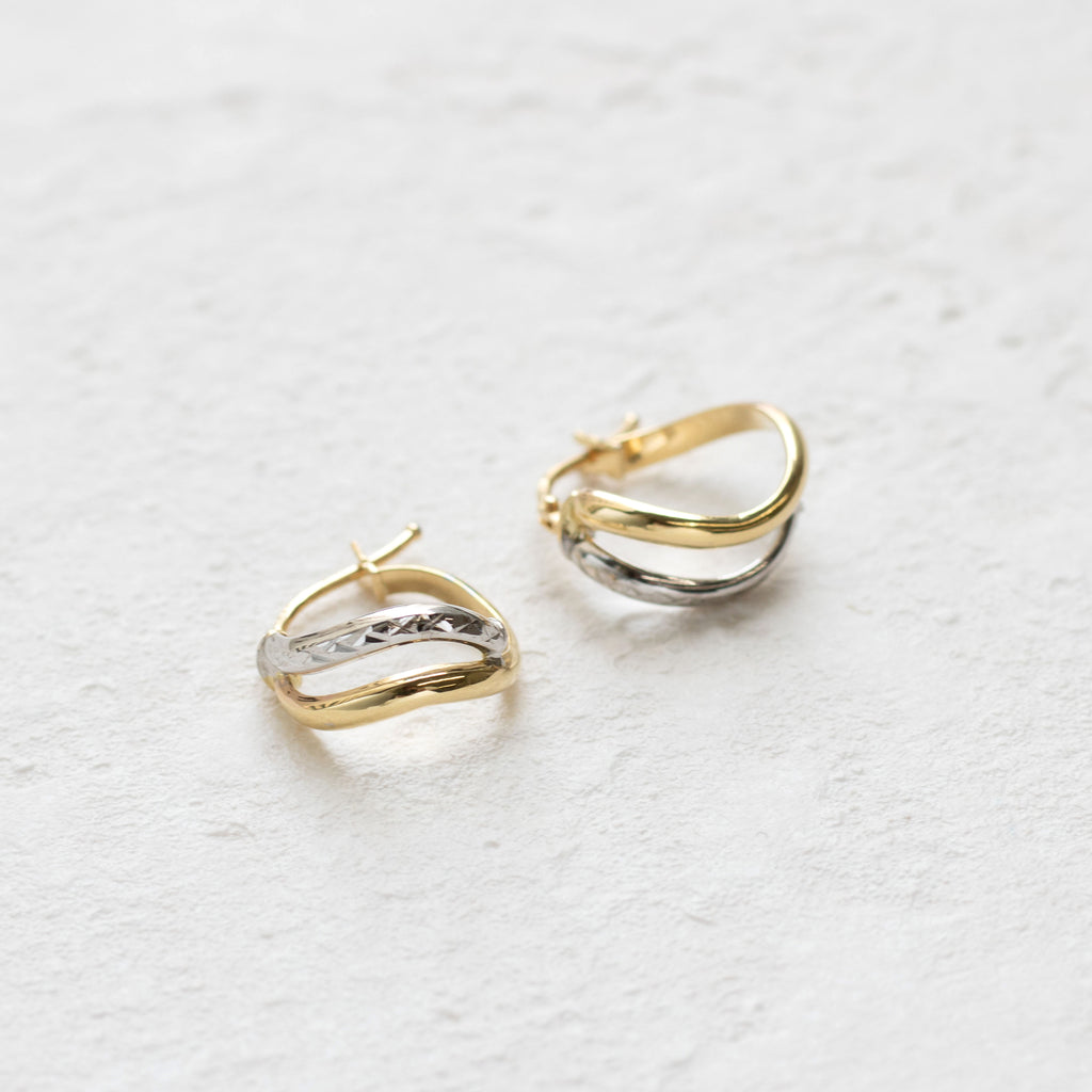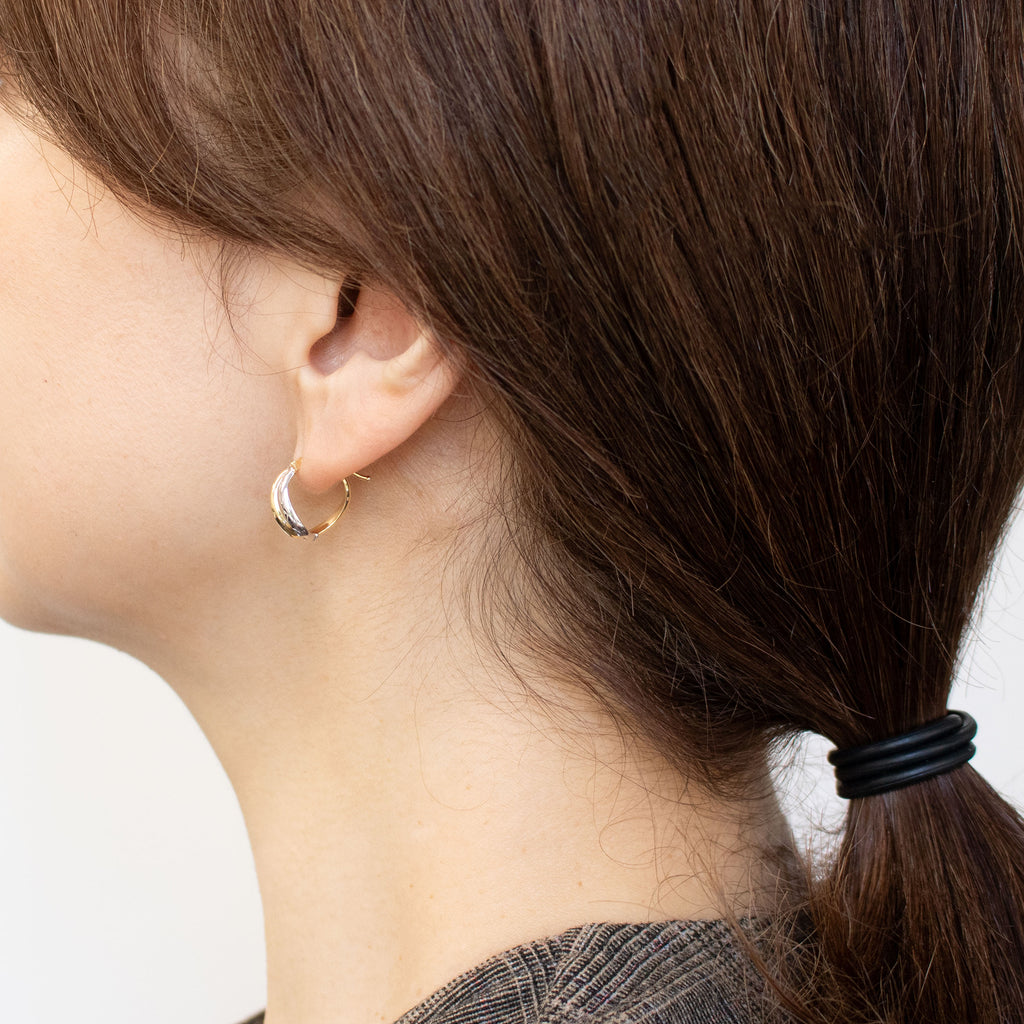 2本のフープはそれぞれイエローゴールド色とホワイトゴールド色ですが、実は2本とも18金イエローゴールド製で、ホワイトゴールド色に見えるところは18金イエローゴールドにロジウムメッキを施しています。