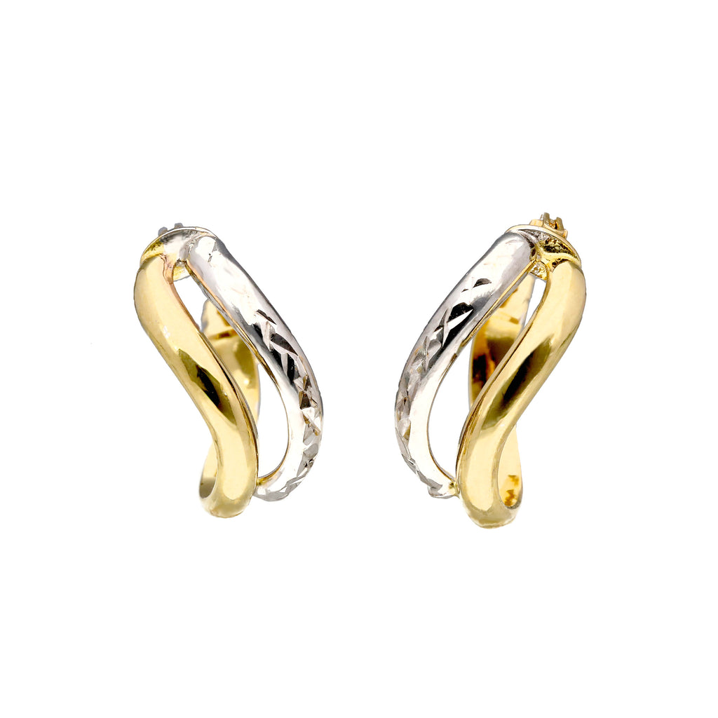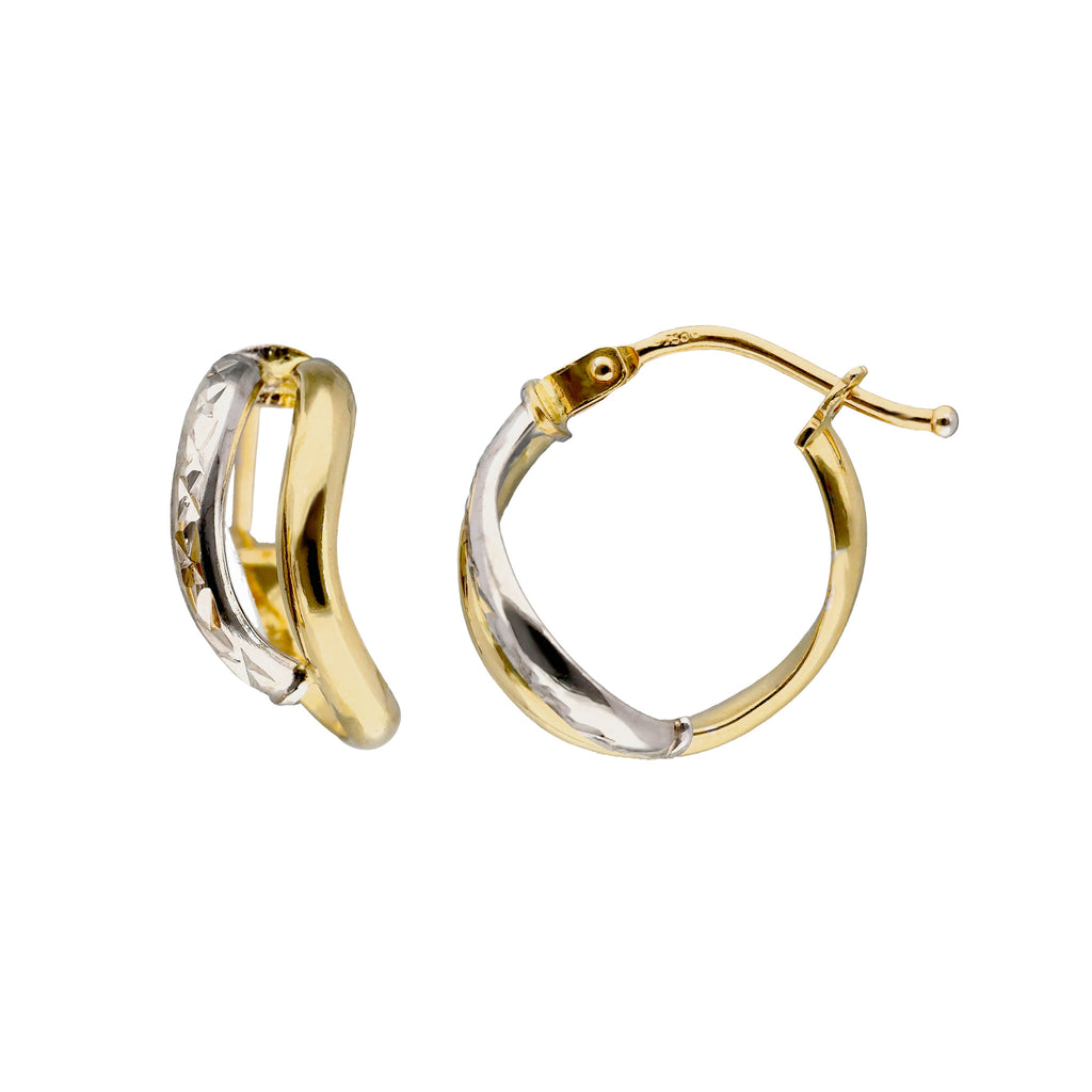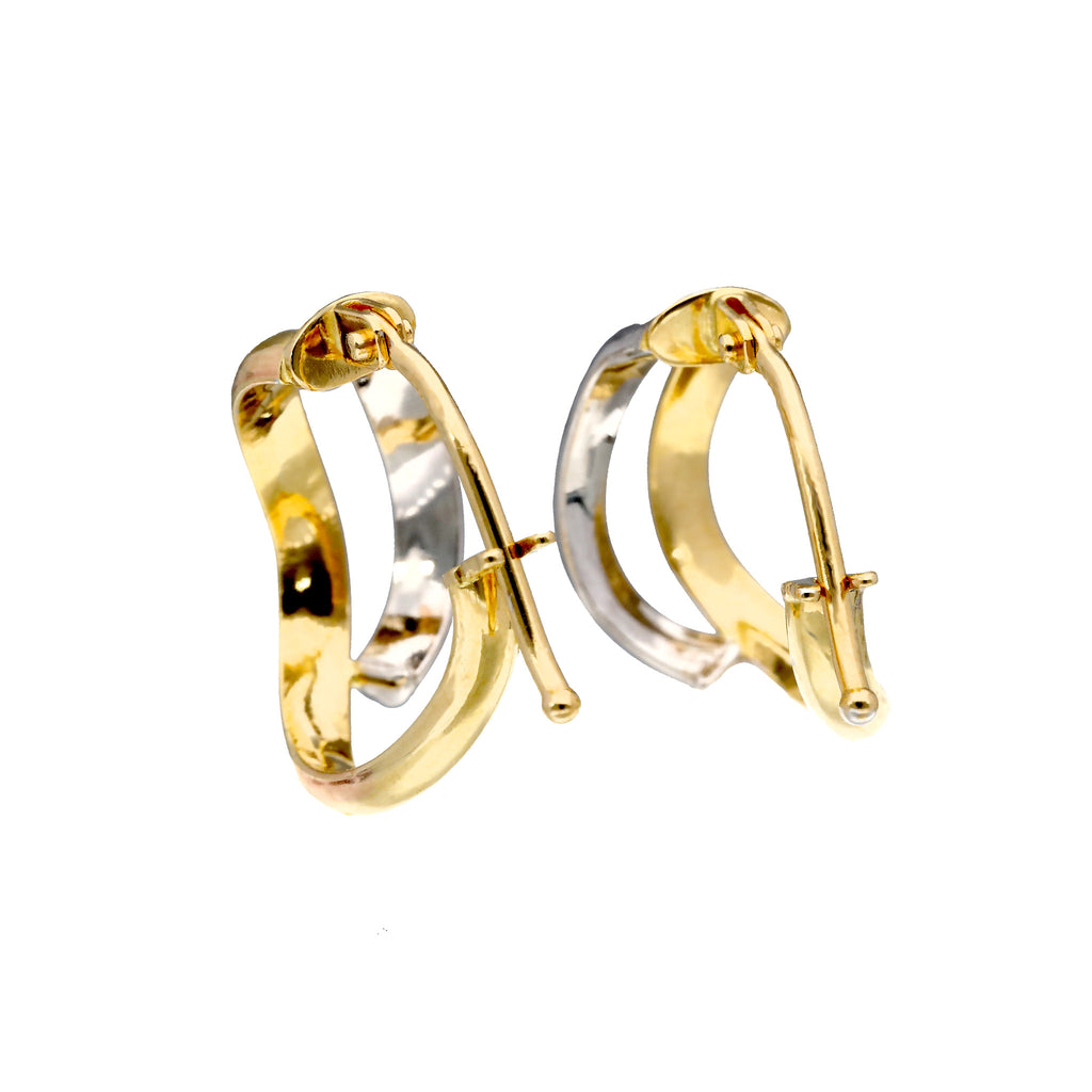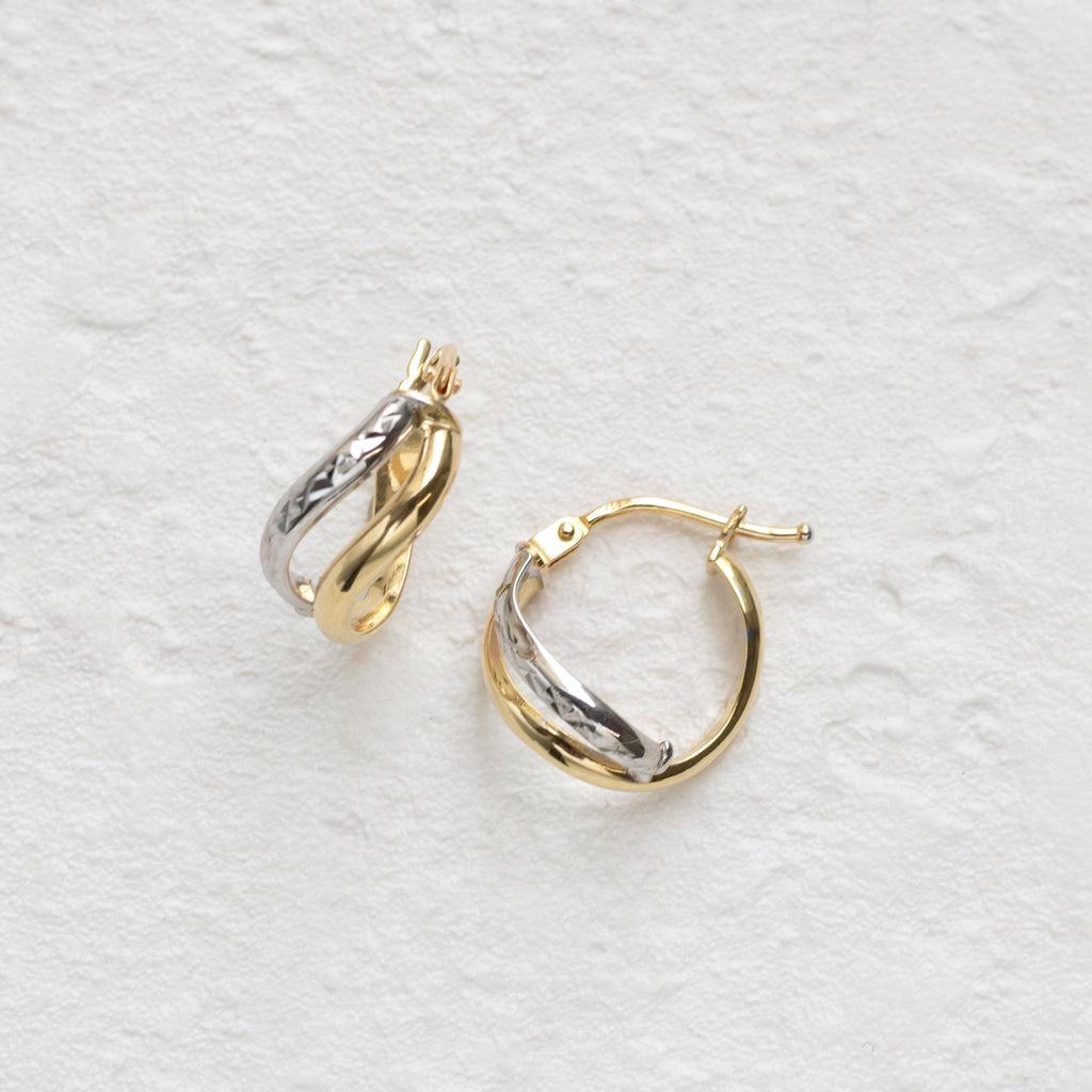 2本のフープはそれぞれイエローゴールド色とホワイトゴールド色ですが、実は2本とも18金イエローゴールド製で、ホワイトゴールド色に見えるところは18金イエローゴールドにロジウムメッキを施しています。