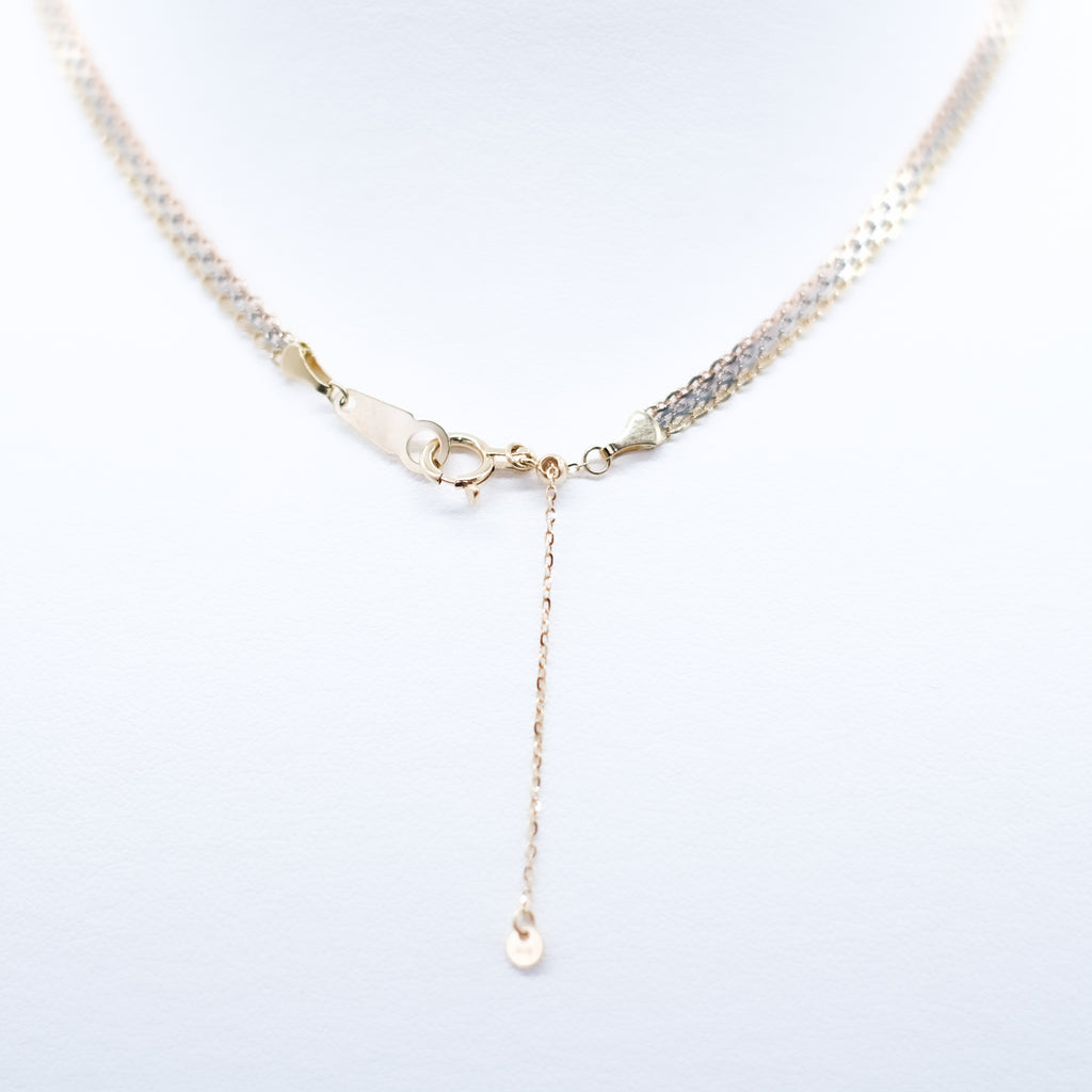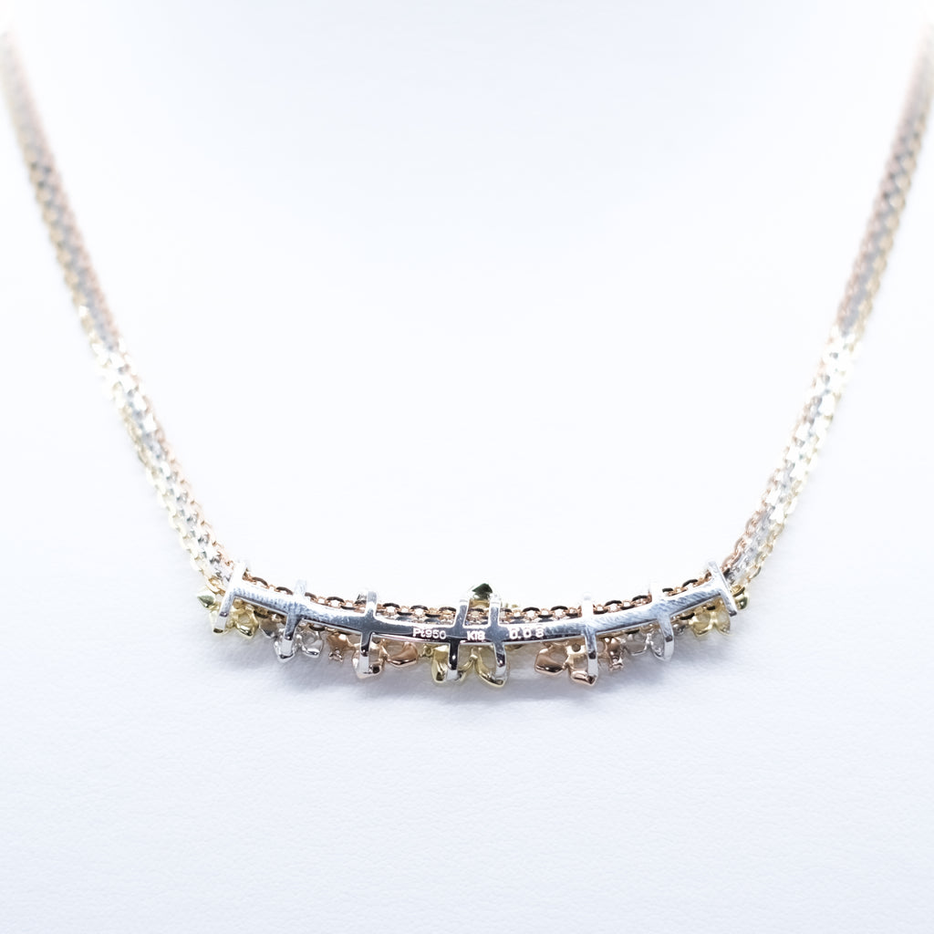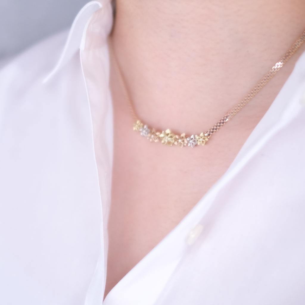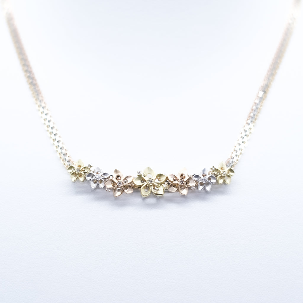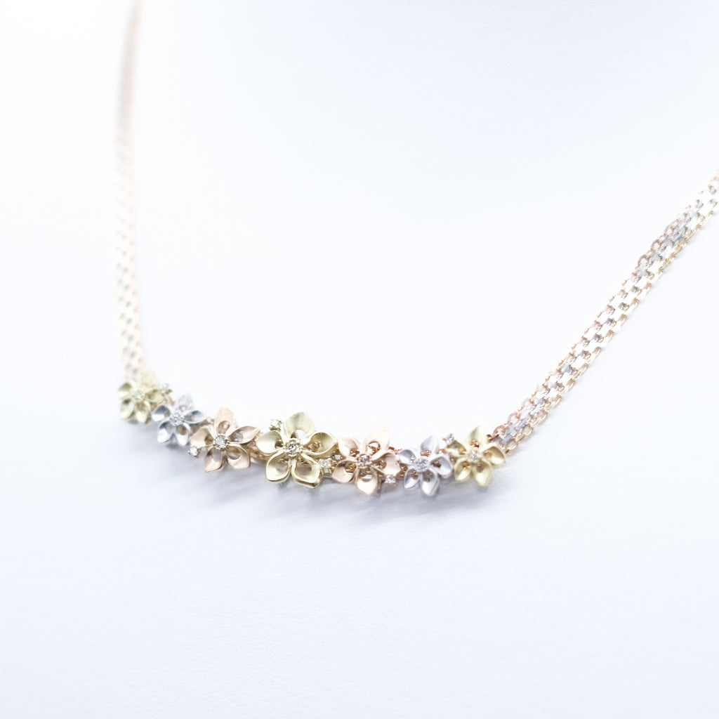 立体感のあるフラワーモチーフにはキラキラと輝くメレダイヤを散りばめました。3色のフラワーモチーフがとっても華やかで、まるで胸元に本物の花が咲き誇るような華やかでカラフルなネックレスです。