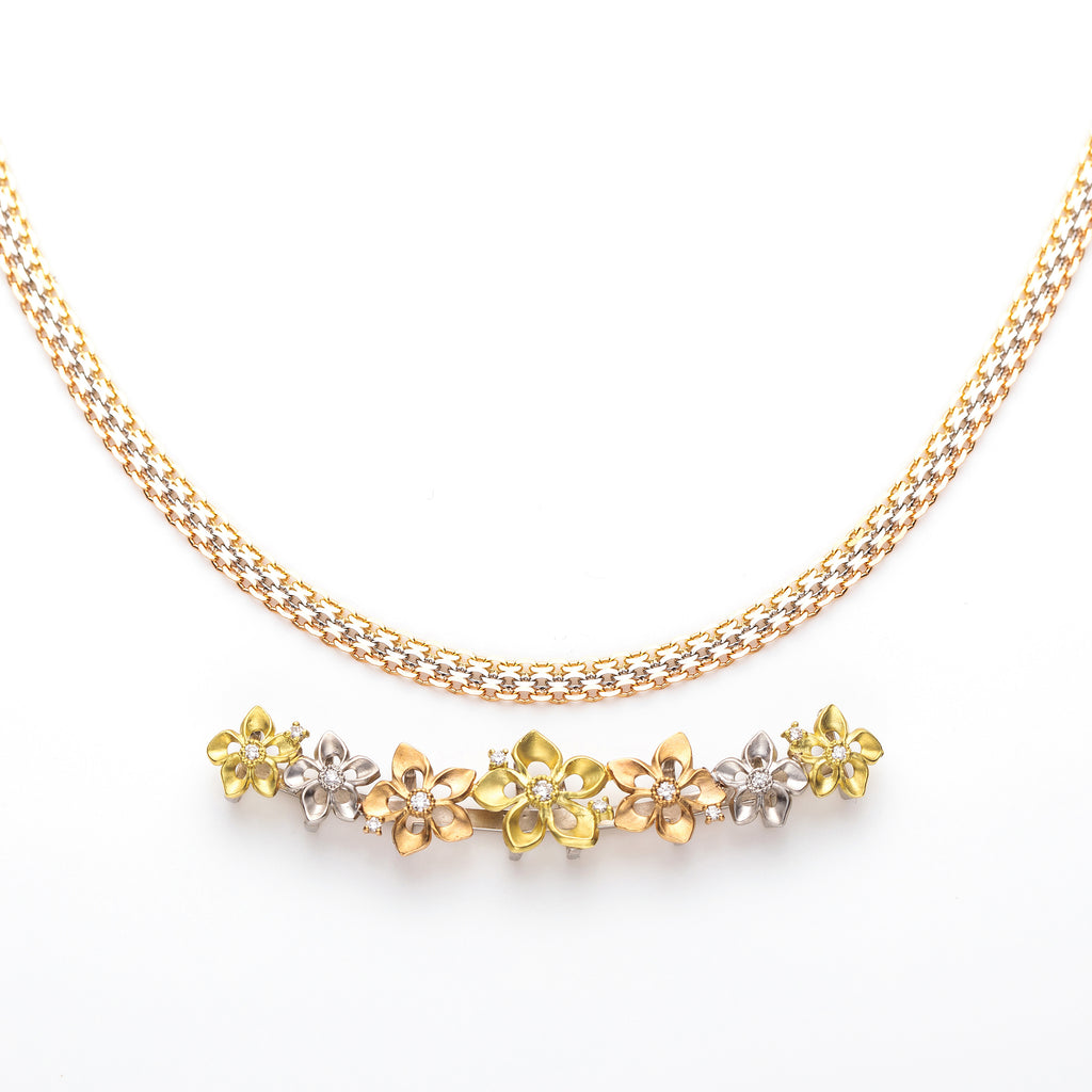 この幅の広いチェーンに負けないボリューム感を持つフラワーモチーフのペンダントトップと組み合わせています。ペンダントトップもチェーンに合わせて18金イエローゴールド、18金ピンクゴールド、プラチナの3色で作られています。