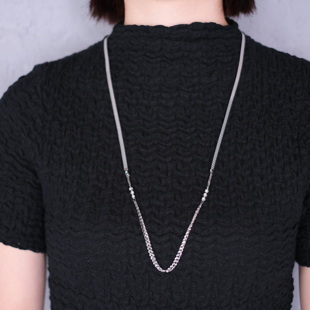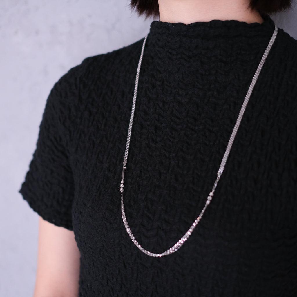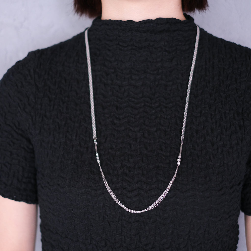 そのままだと全長約78cmのロングネックレスですが、ネックレスの途中にあるマグネットのパーツを留めると内周約57cmのネックレスになり、前の部分にフリンジ状のデザインが生まれます。