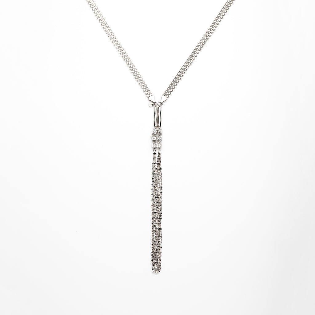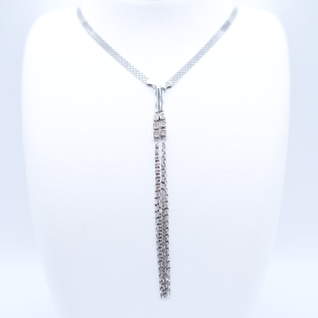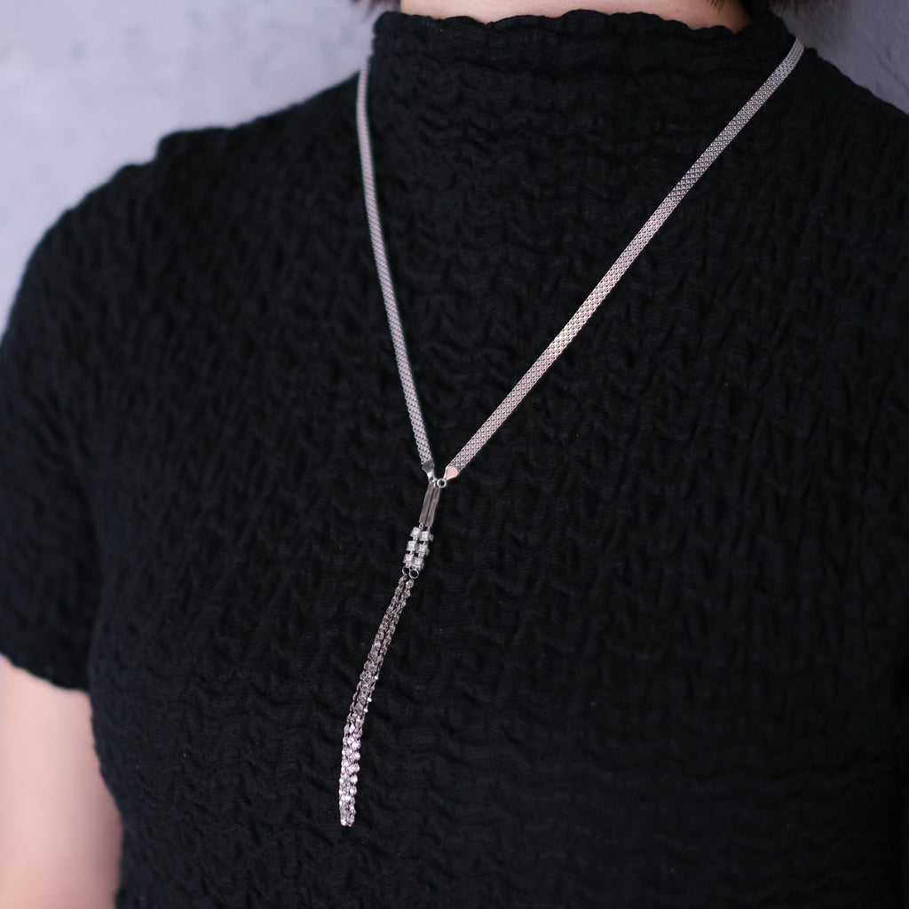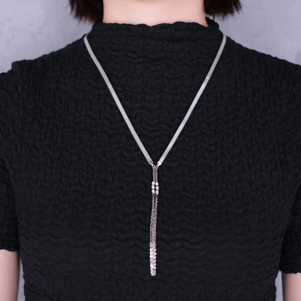 そのままだと全長約78cmのロングネックレスですが、ネックレスの途中にあるマグネットのパーツを留めると内周約57cmのネックレスになり、前の部分にフリンジ状のデザインが生まれます。