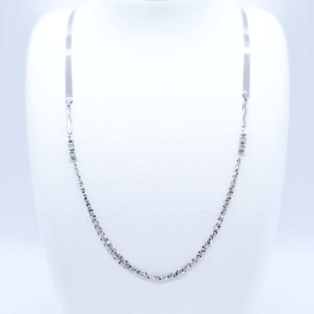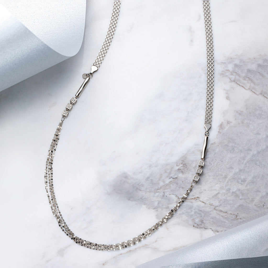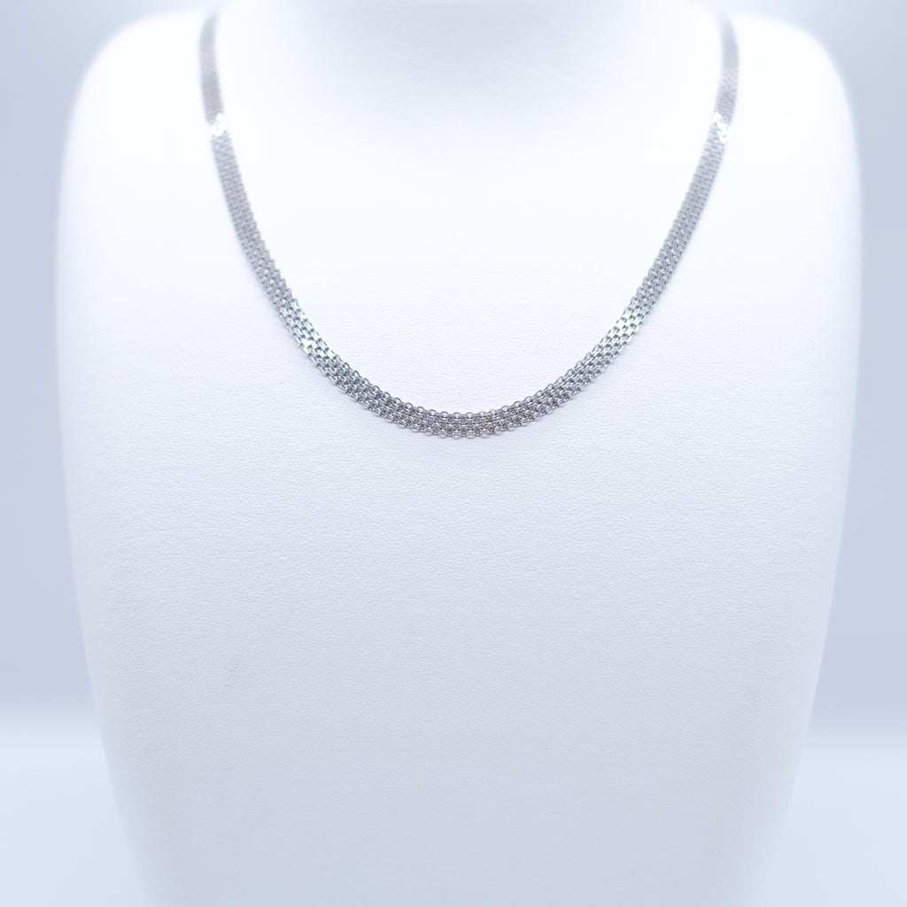 ネックレスの後ろの部分は平たくて太いチェーンを使用。ネックレスの前の部分はキラキラとした輝きが人気のペタルチェーンを4連にしてあり、揺れて輝く様子がとても華やかです。