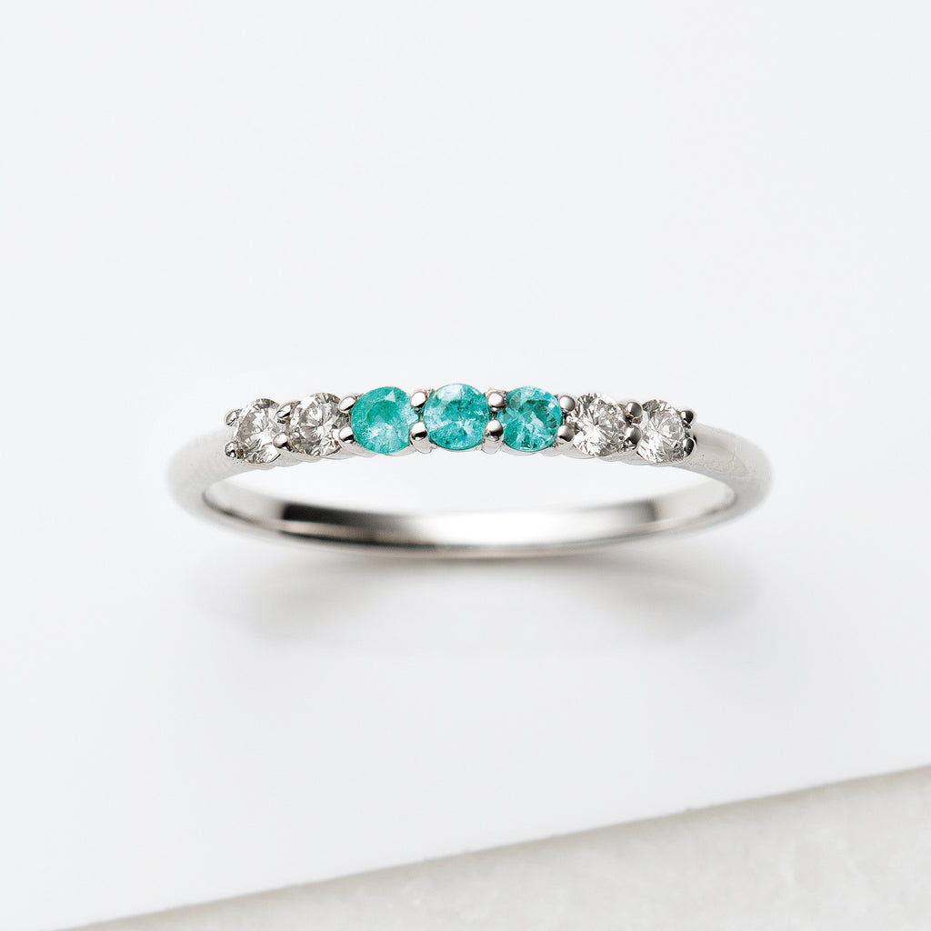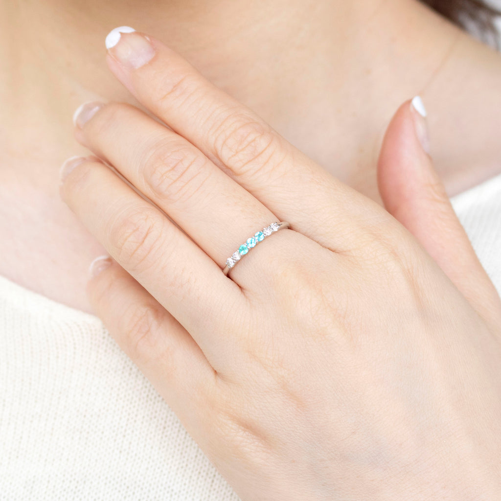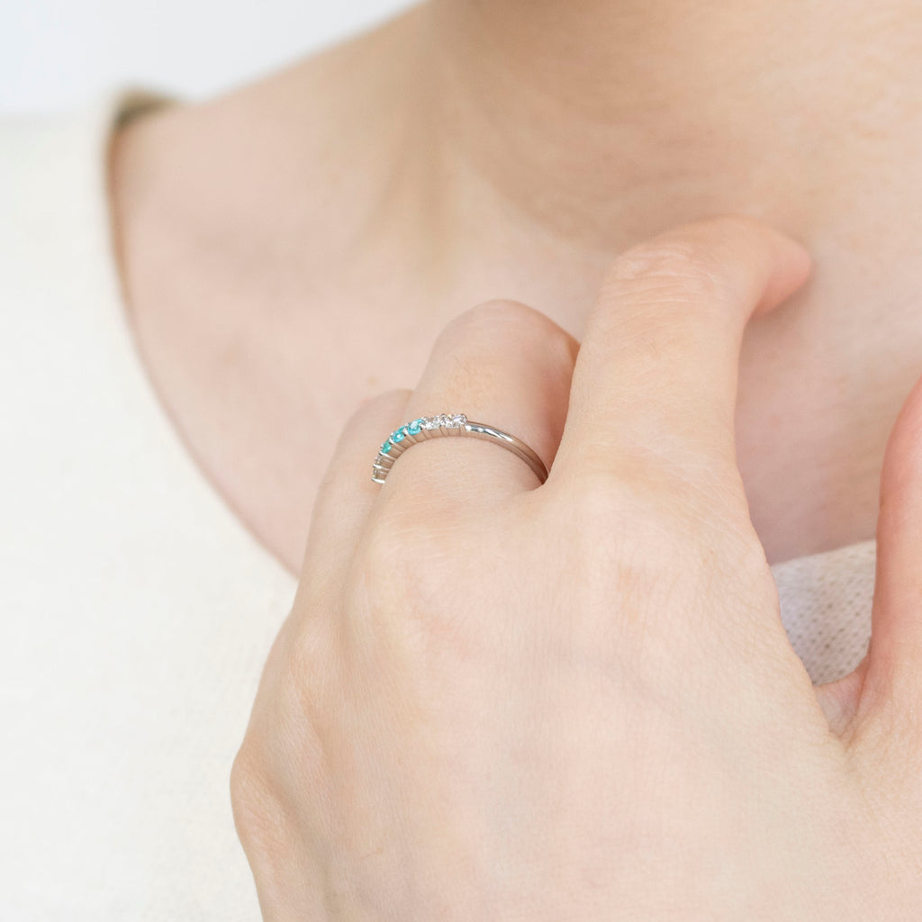 小粒でも鮮やかな色が目を引くパライバトルマリンを3石中央に並べて、その左右にメレダイヤを2石ずつセットしたハーフエタニティリングです。一石一石は小さくても、3石並べて留めることによって存在感をアップさせました。