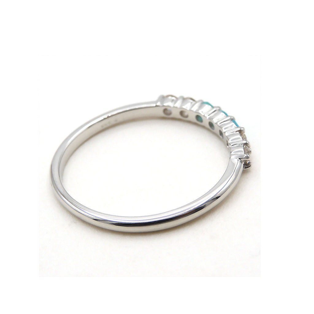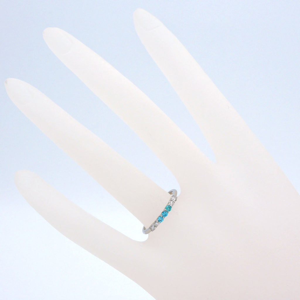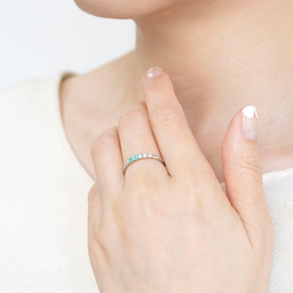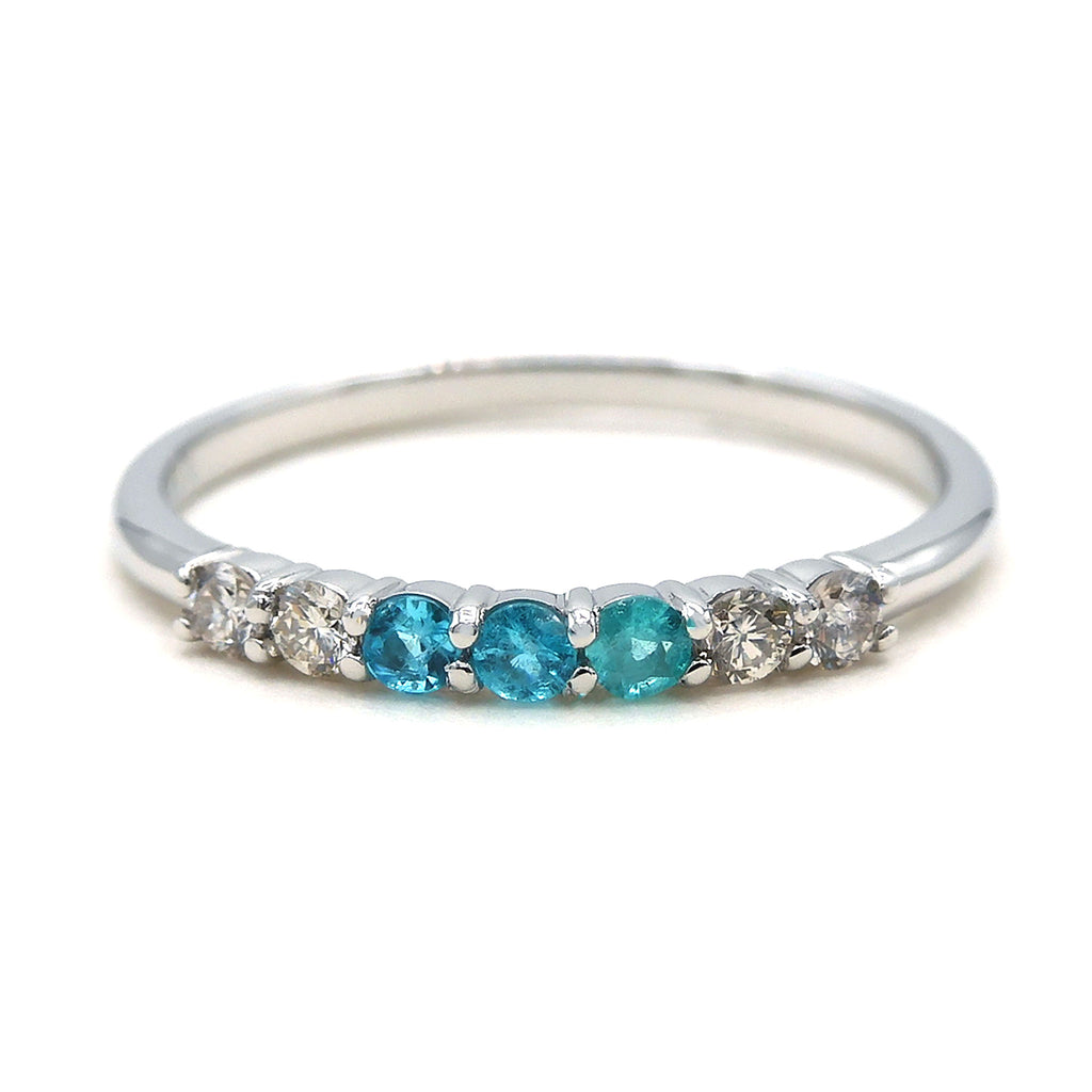 小粒でも鮮やかな色が目を引くパライバトルマリンを3石中央に並べて、その左右にメレダイヤを2石ずつセットしたハーフエタニティリングです。一石一石は小さくても、3石並べて留めることによって存在感をアップさせました。