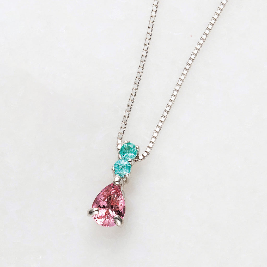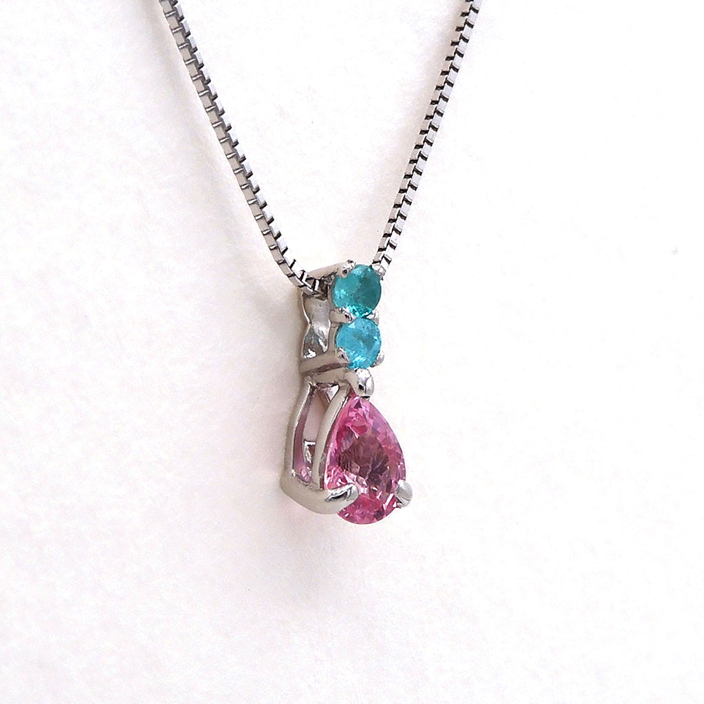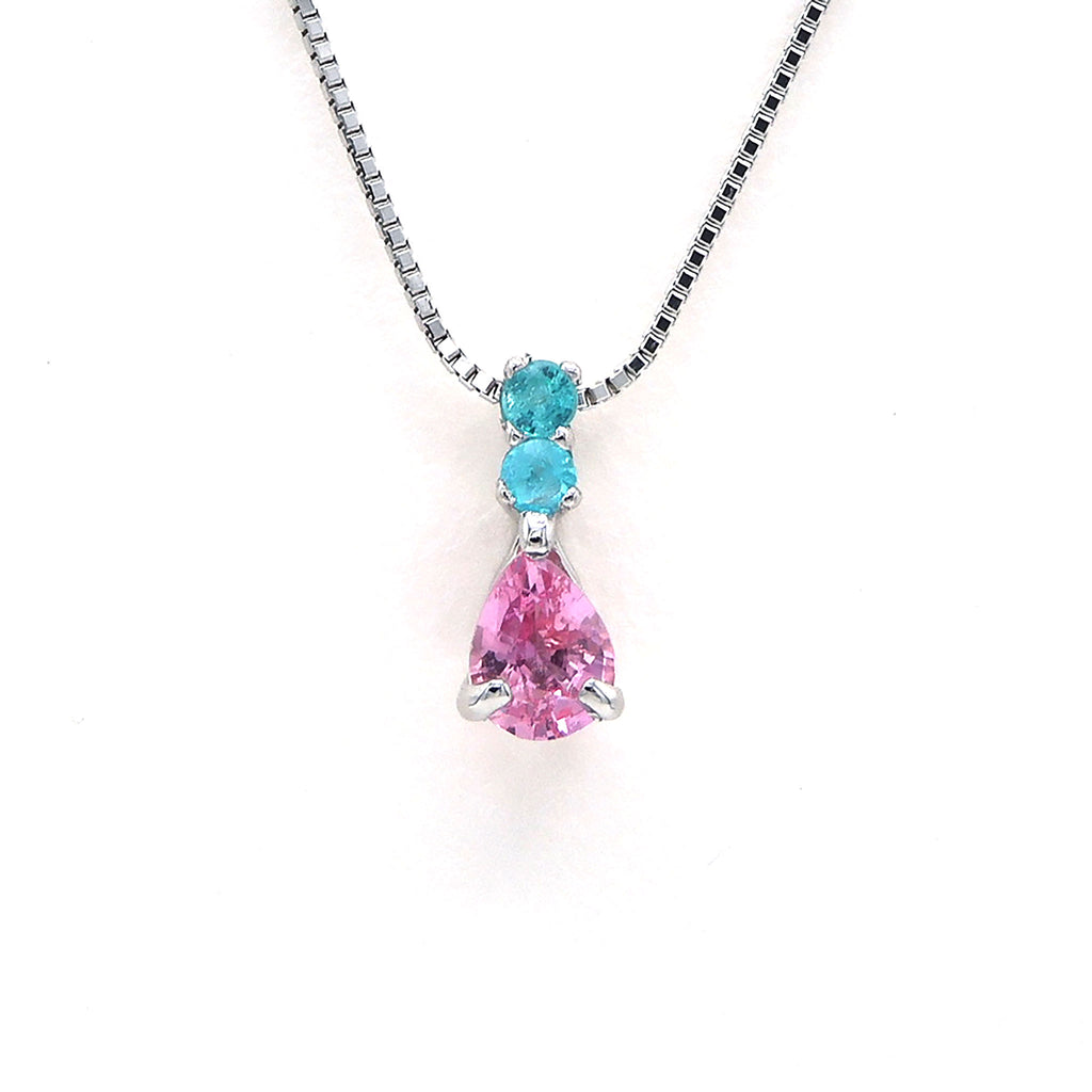 可愛らしい雫形のパパラチアサファイアをプラチナ製の枠にセット、その上に小粒のパライバトルマリンを2石縦に留めたデザインです。両方共が目を引く鮮やかな色ですが、不思議とケンカをせずにお互いの美しさを引き立たせています。