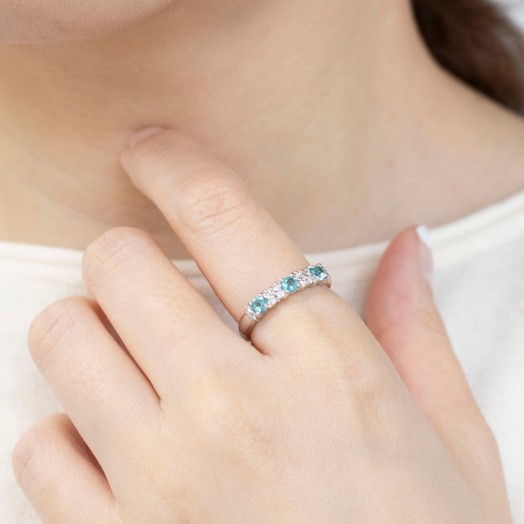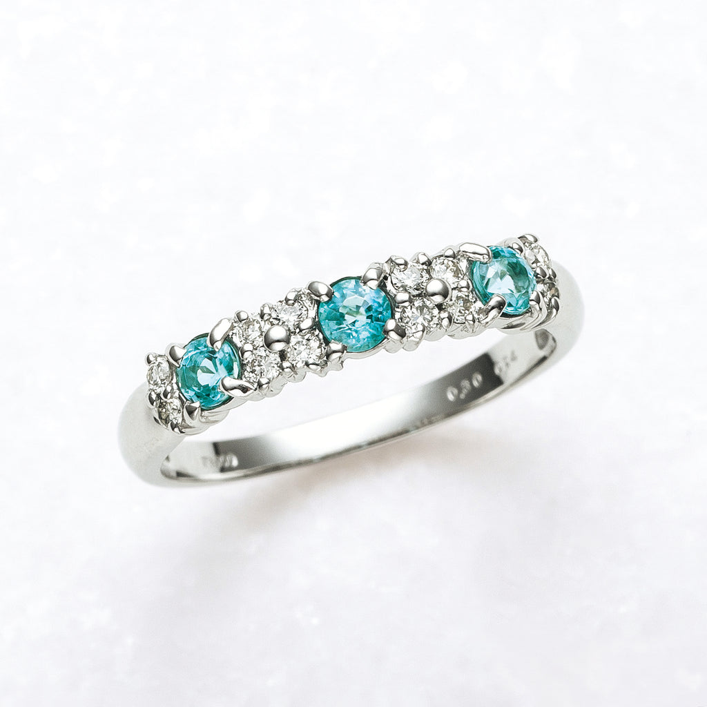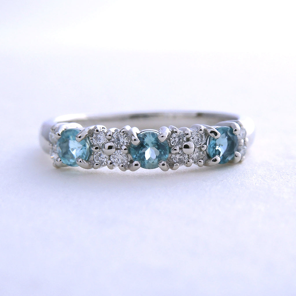 ティールブルー(鴨の羽色)と呼ばれる、ブルーとグリーンが絶妙に混ざり合った落ち着いた色合いが魅力的なグランディディエライトを厳選してリングに仕立てました。