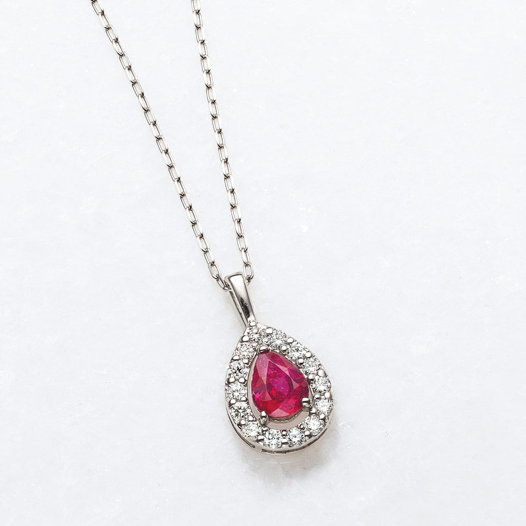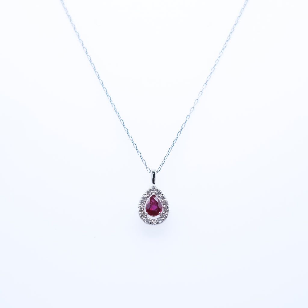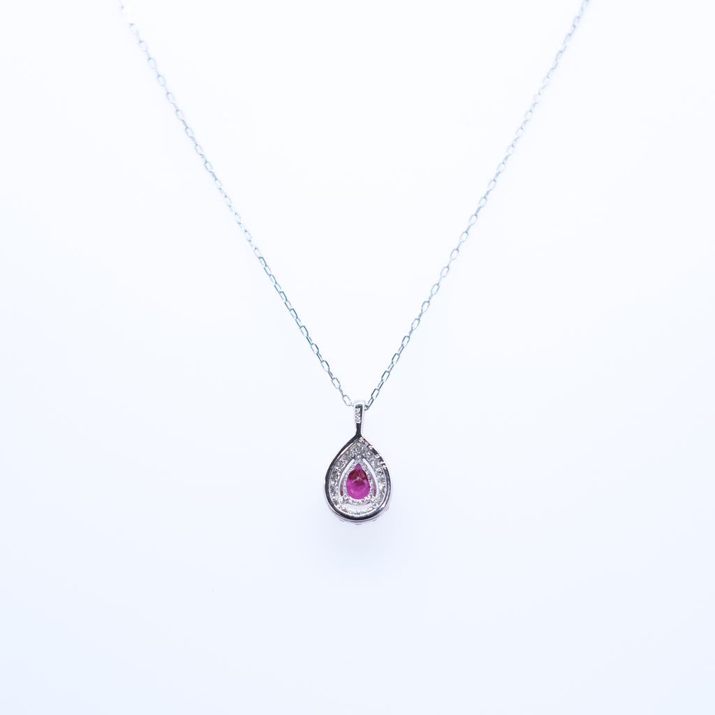 瑞々しい輝きを放つペアシェイプのルビーを輝きのよいメレダイヤでぐるりと取り巻きました。ルビーとメレダイヤの間にはわずかに隙間を空けてあり、よりルビーが際立つデザインになっています。