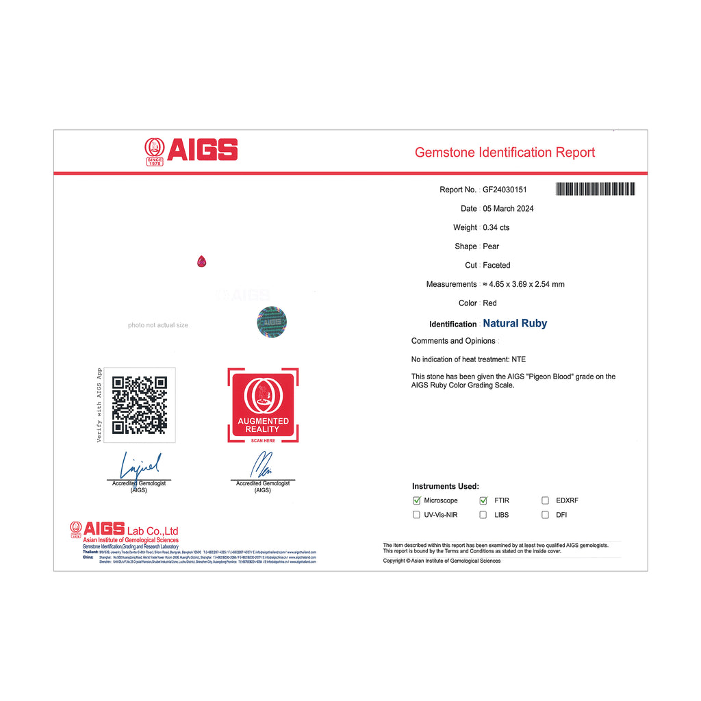 このネックレスには0.3ctのピジョン・ブラッドのルビーが使われており、ルビーの取引が盛んなタイで最も歴史のあるAIGS(Asian Institute of Gemological Sciences)のピジョン・ブラッドの基準を満たしている旨が記載された鑑別書が付いたものを厳選しています。