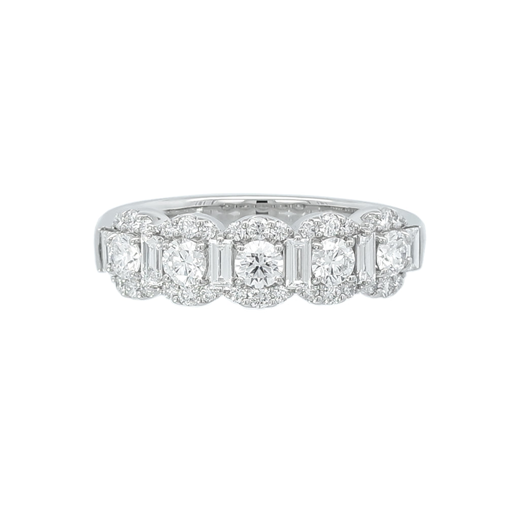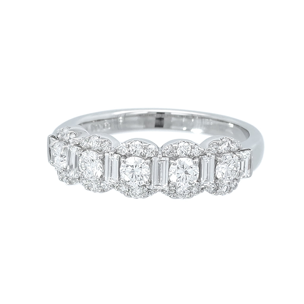 ラウンドカットのメレダイヤとバゲットカットのダイヤを交互に横一列にセットして、ラウンドカットのメレダイヤの上下には小さなメレダイヤを丸く縁取るようにセットしました。