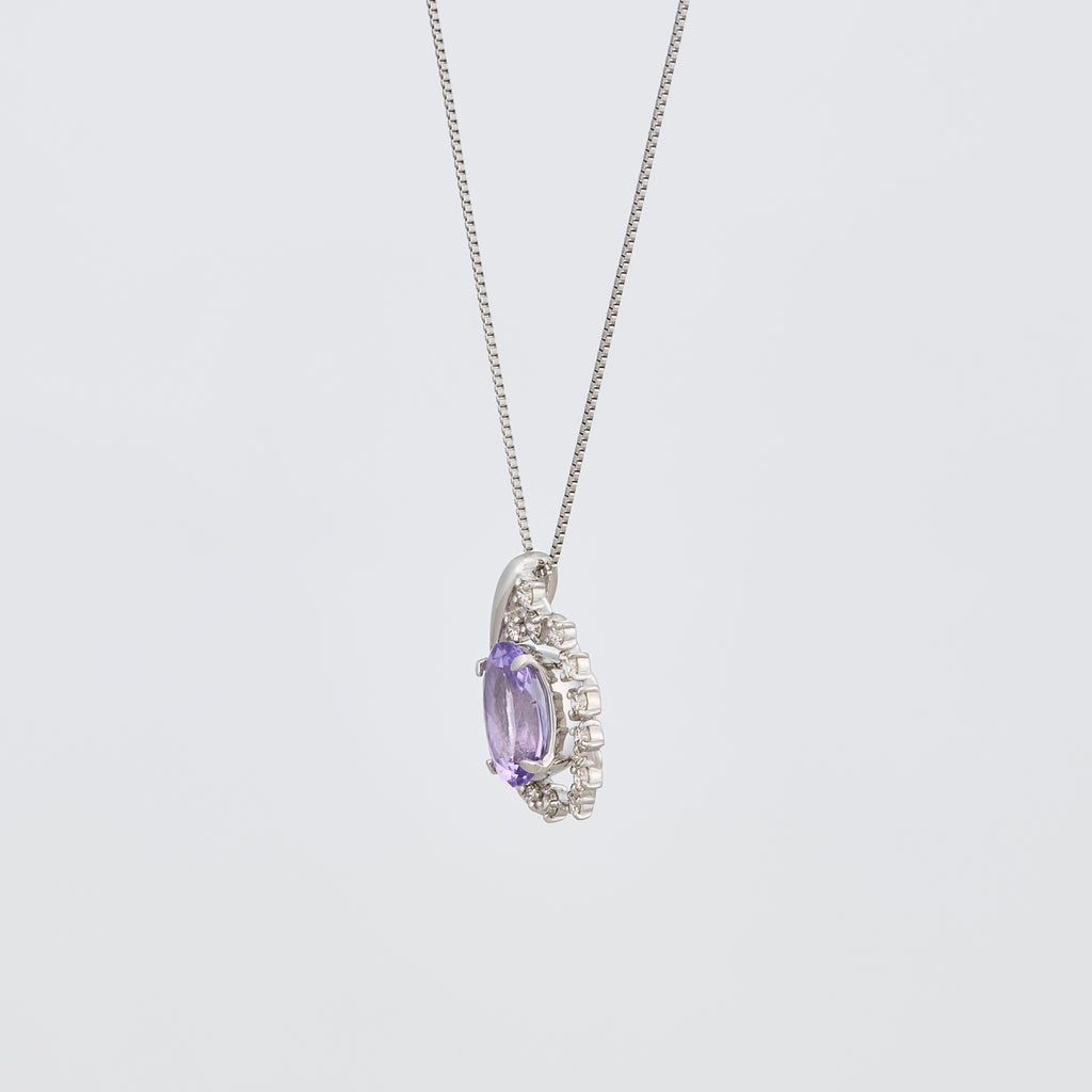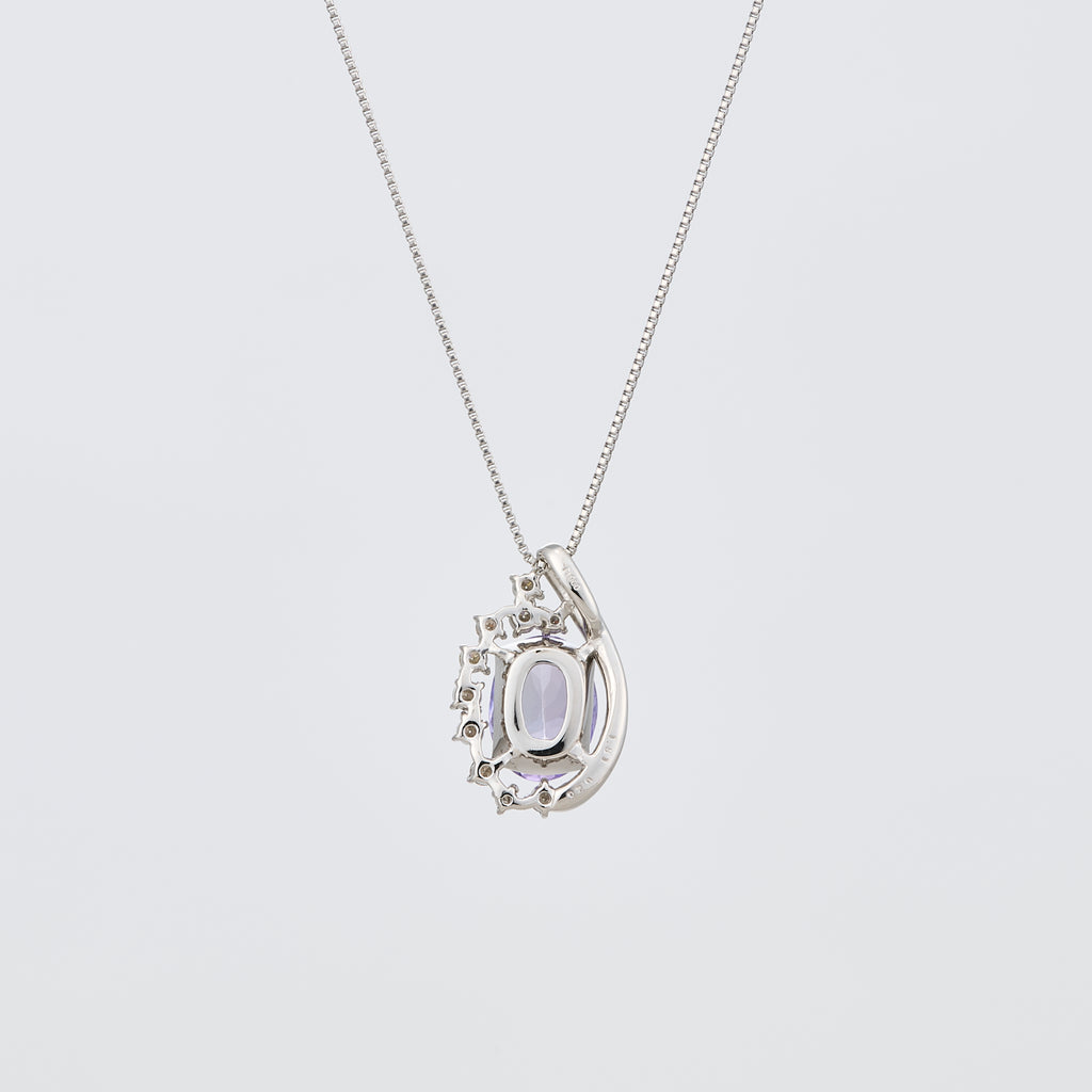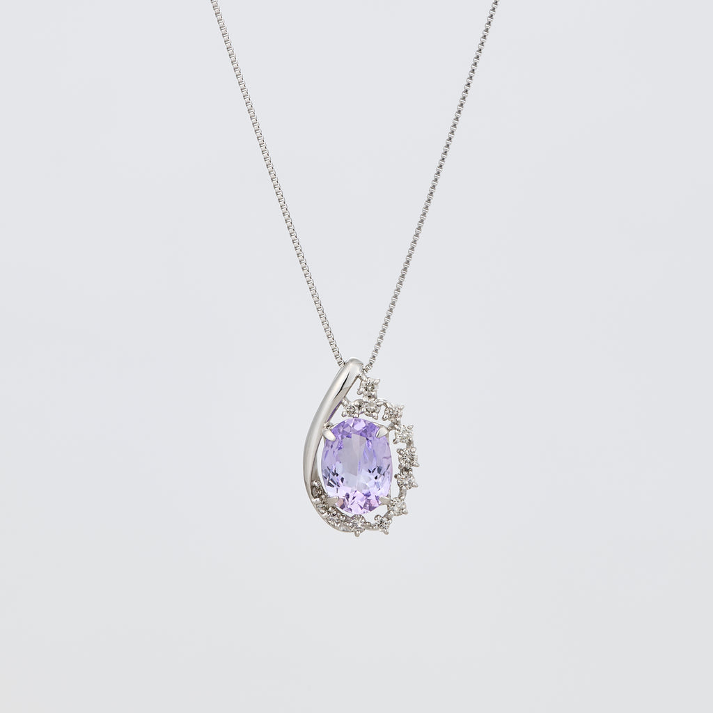 紫色の宝石の代表格であるアメシストの紫色とは違った可憐な印象の紫色が特徴。同じ鉱物なので、タンザナイトと同様のキラキラとした輝きもお楽しみいただけます。