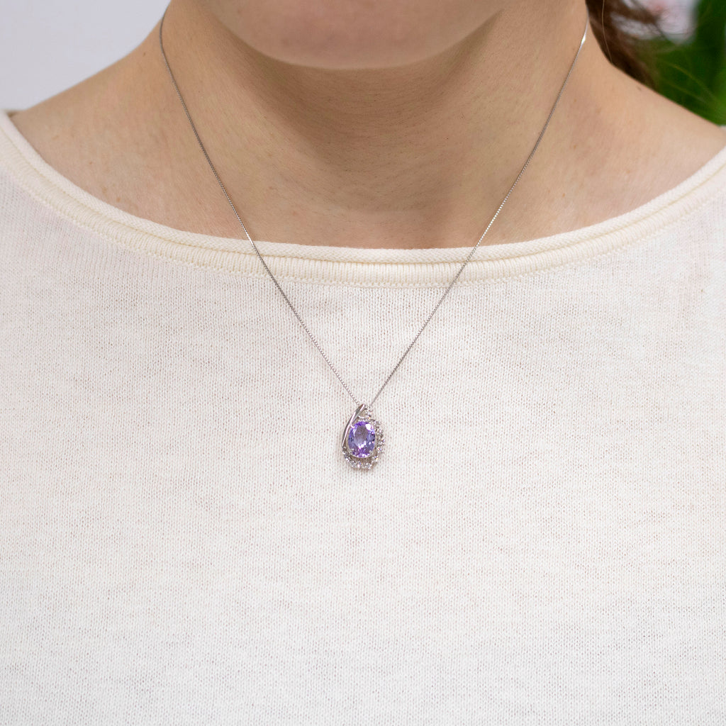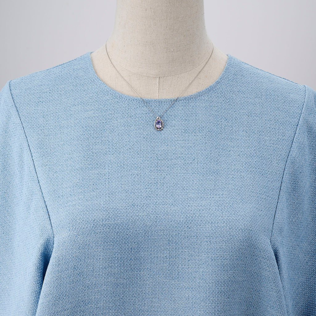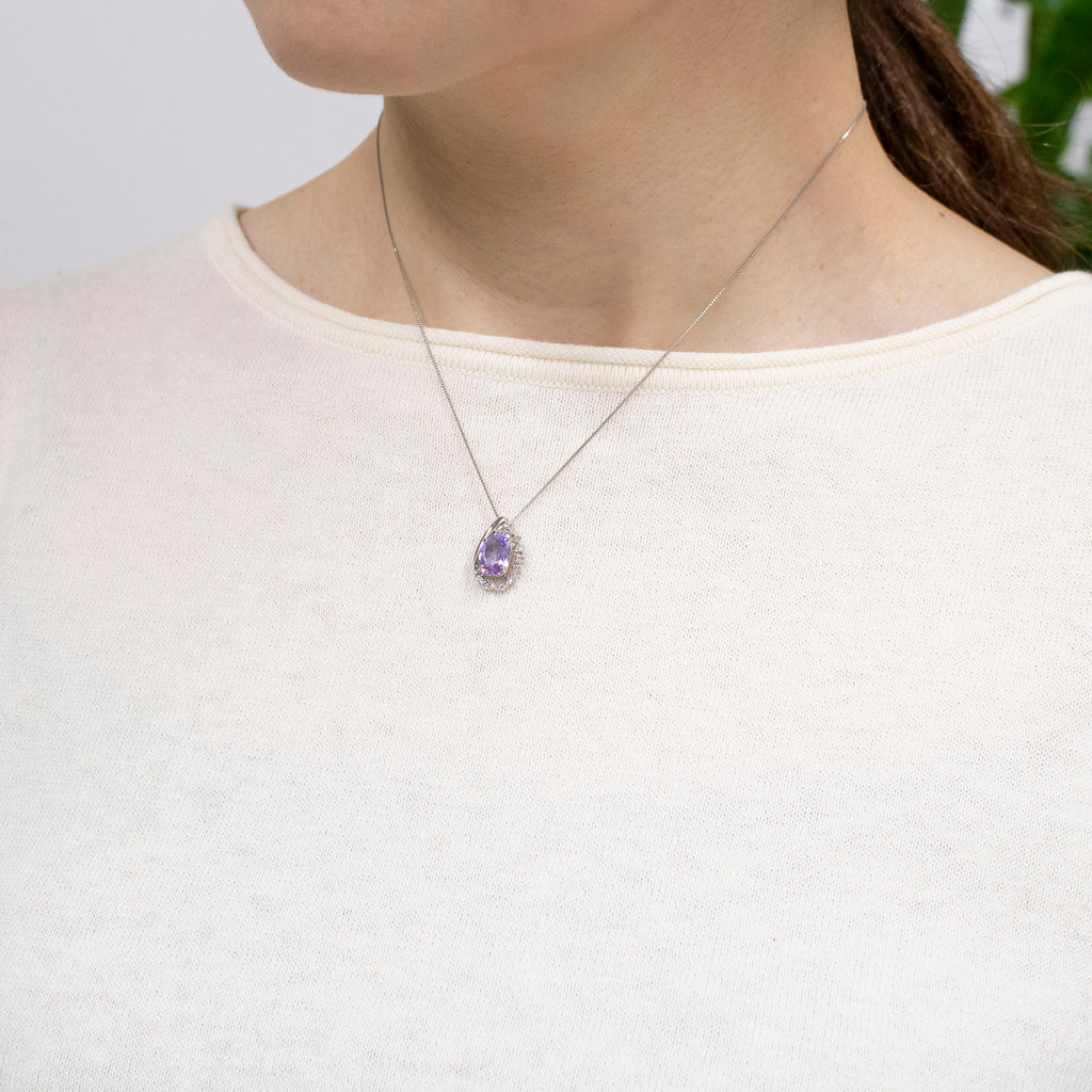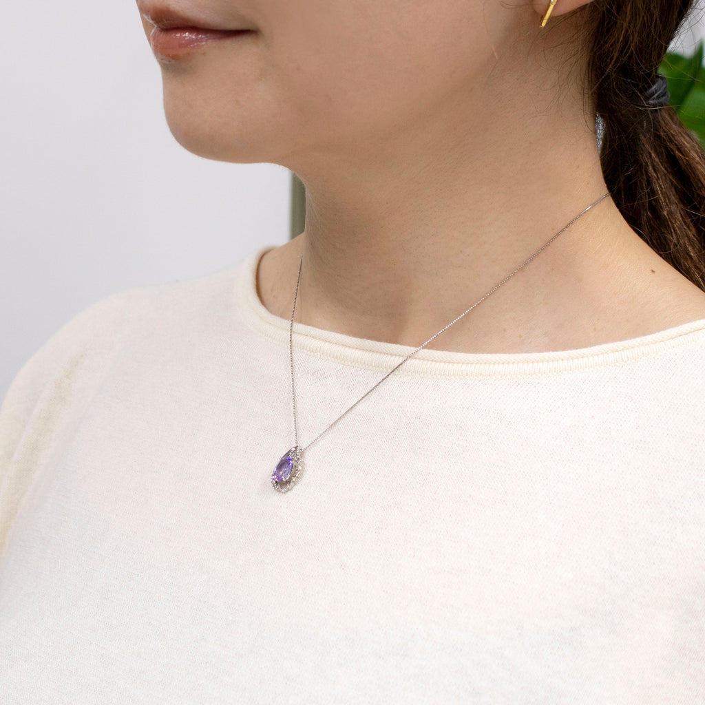紫色の宝石の代表格であるアメシストの紫色とは違った可憐な印象の紫色が特徴。同じ鉱物なので、タンザナイトと同様のキラキラとした輝きもお楽しみいただけます。