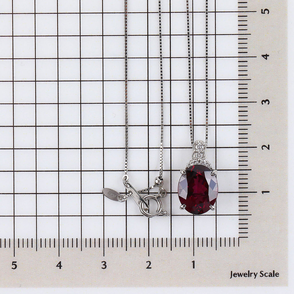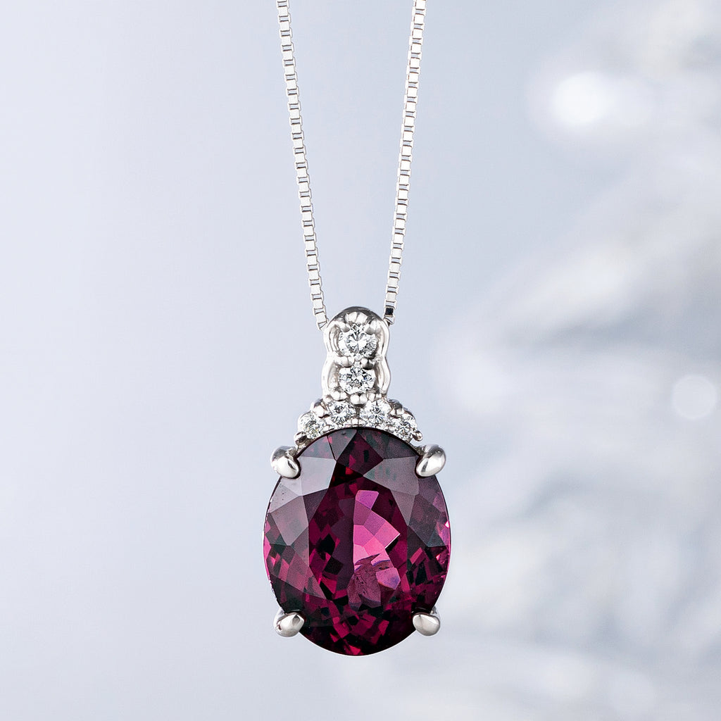 大粒4.21ctのロードライトガーネットを安定感のあるオーバルシェイプに整えて、チェーンを通すバチカン部分にメレダイヤをあしらった枠にセット。幅広いスタイルに合わせていただける華美になりすぎないデザインです。