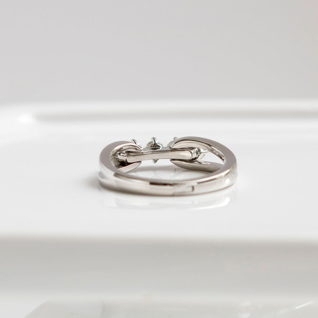 腕の真ん中に空間が空いていて抜け感がありつつも、しっかりとボリューム感も感じられるリングです。
