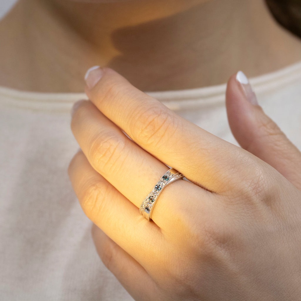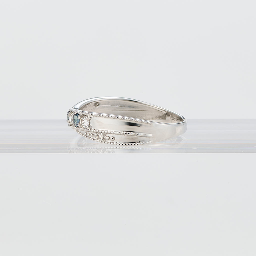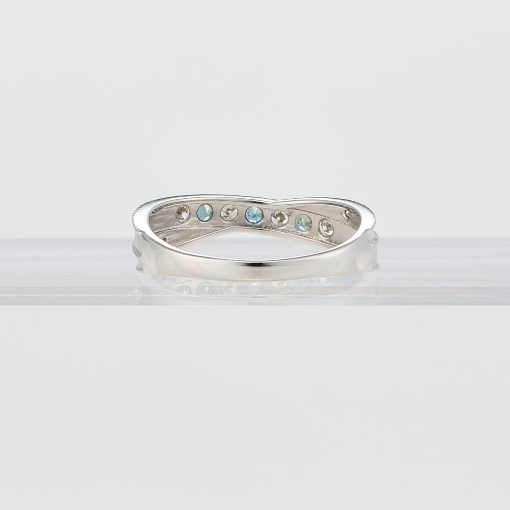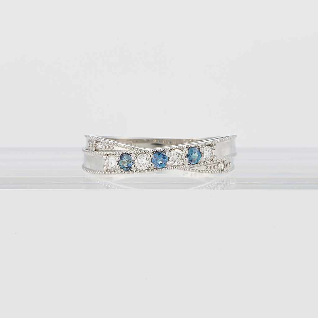 色変わりのよいアレキサンドライトを厳選してキラキラとよく輝くメレダイヤと交互にセット。リングの縁には繊細なミル打ち風のテクスチャーを施してあり、クラシカルな雰囲気に仕上げました。