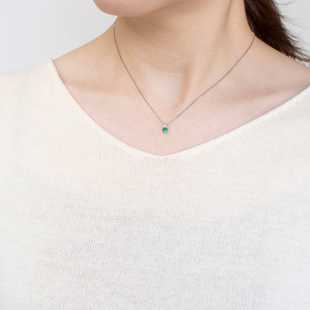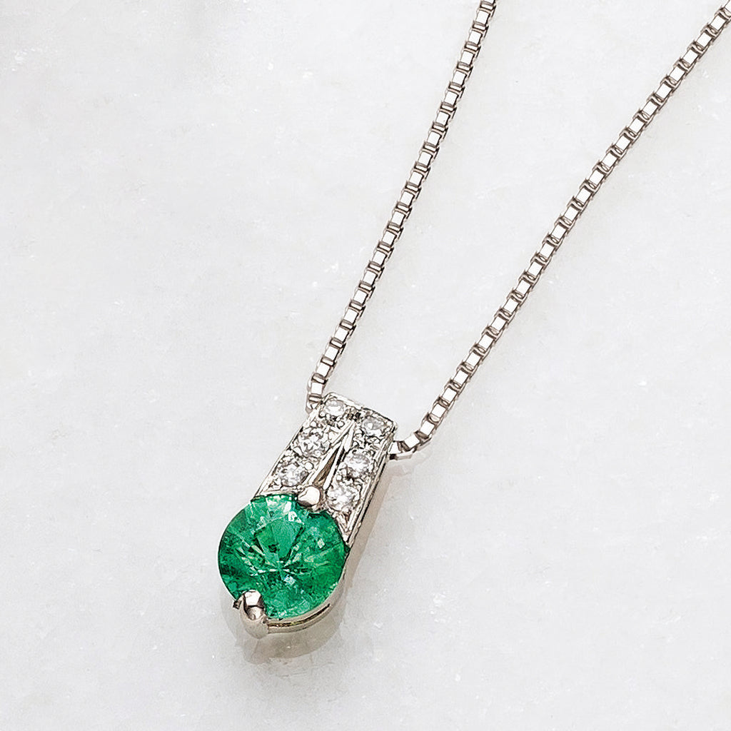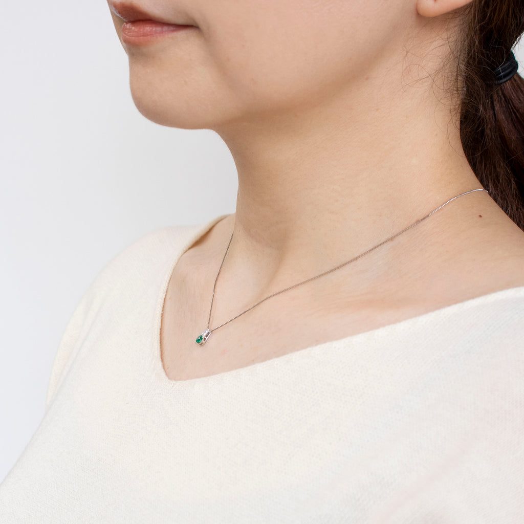 プラチナにエメラルドのグリーンが映える、シンプルでありながらも目を引くネックレスです。