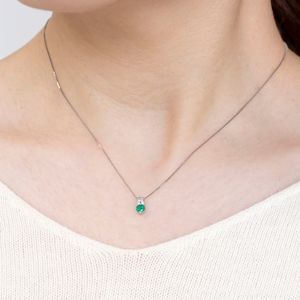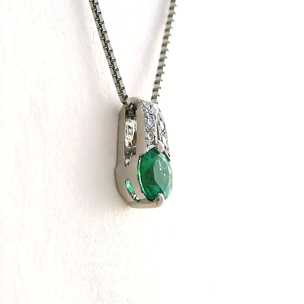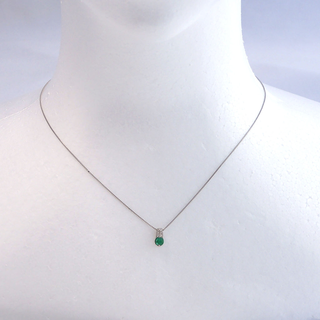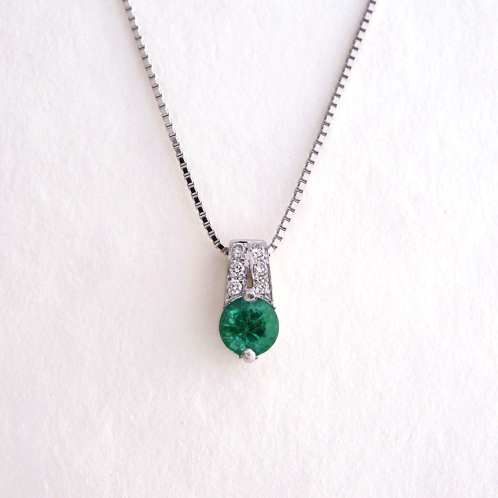 プラチナにエメラルドのグリーンが映える、シンプルでありながらも目を引くネックレスです。