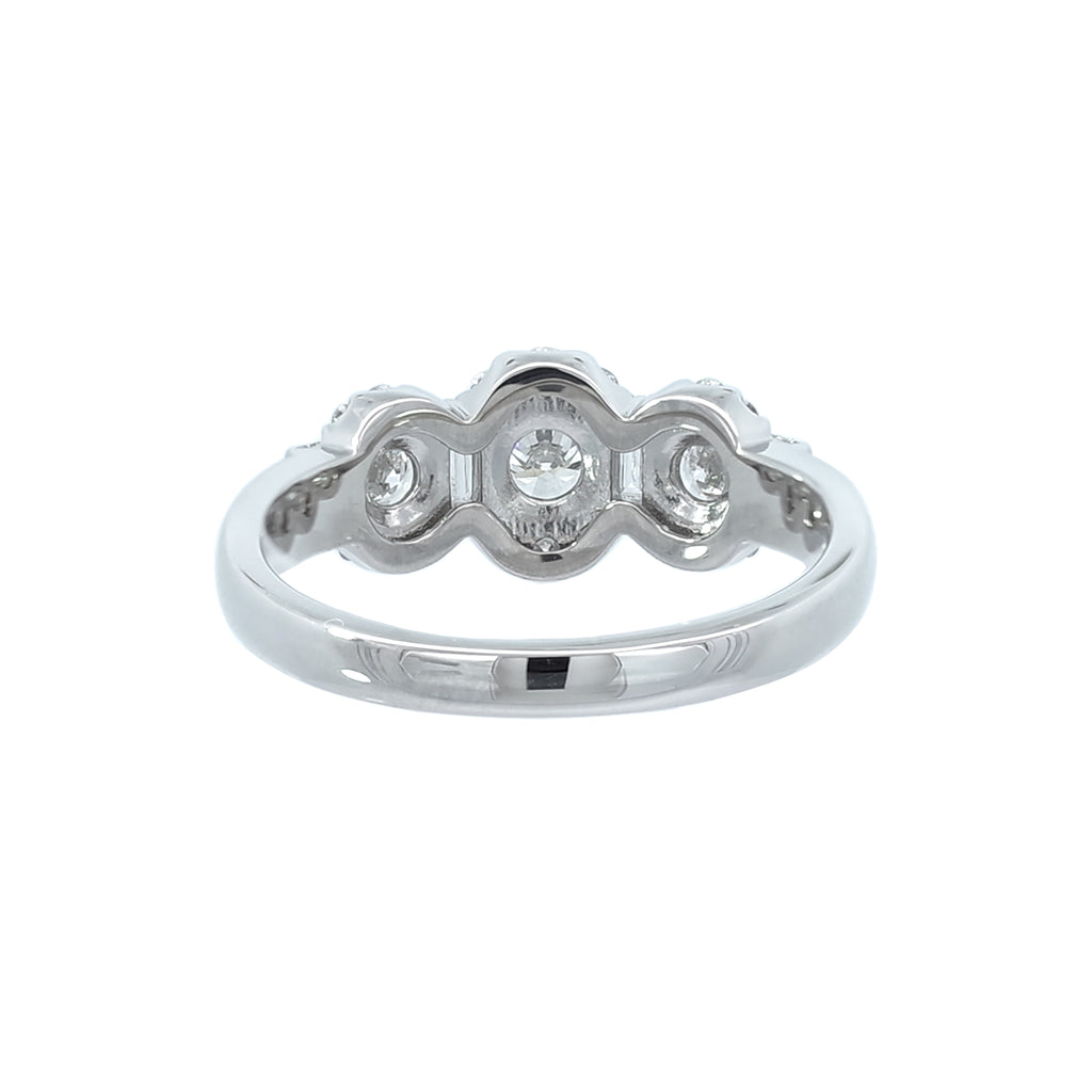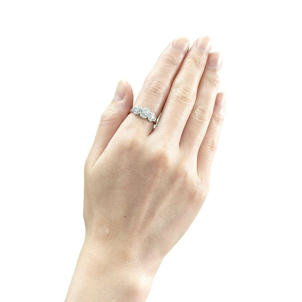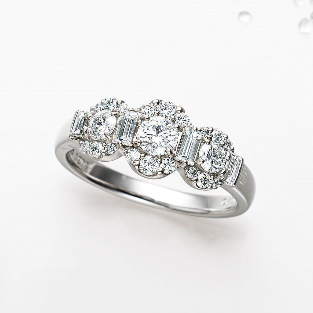 3石のダイヤの上下、リングの縁に当たる部分にダイヤの丸いアウトラインに合わせてメレダイヤを曲線状にセット。まるでフリルのようにリング全体を輝きで飾っています。