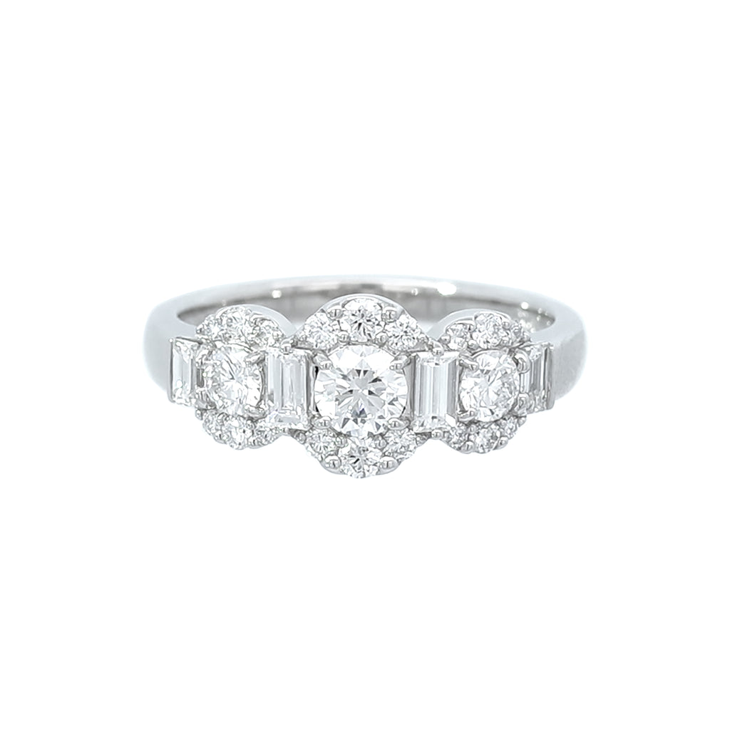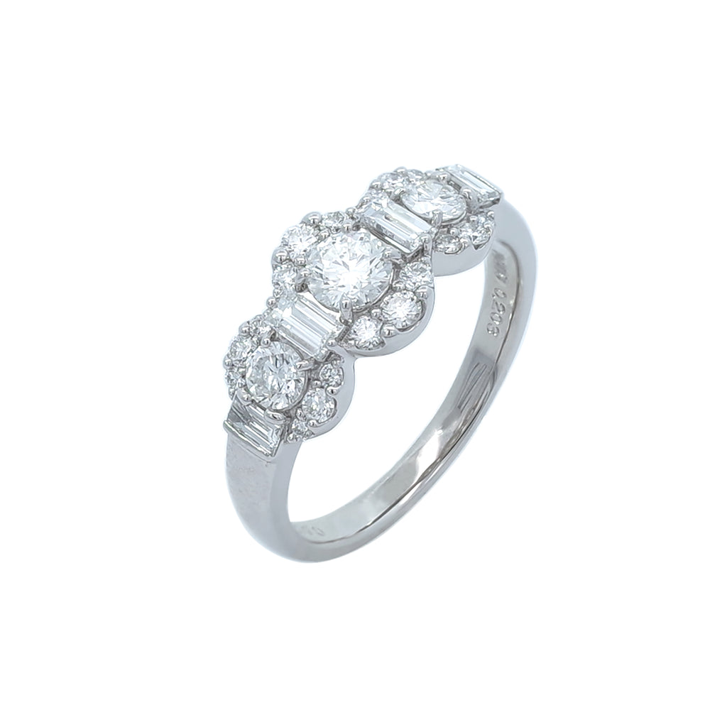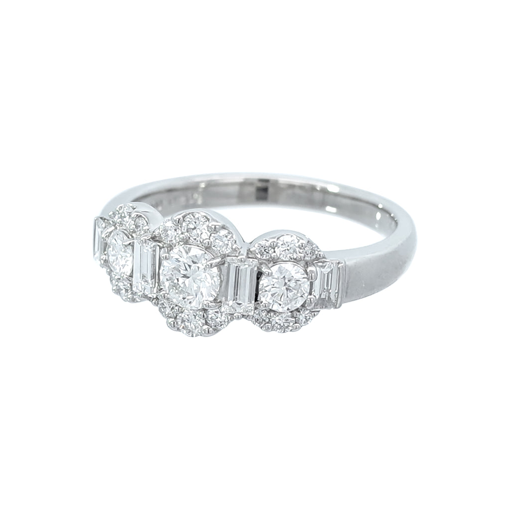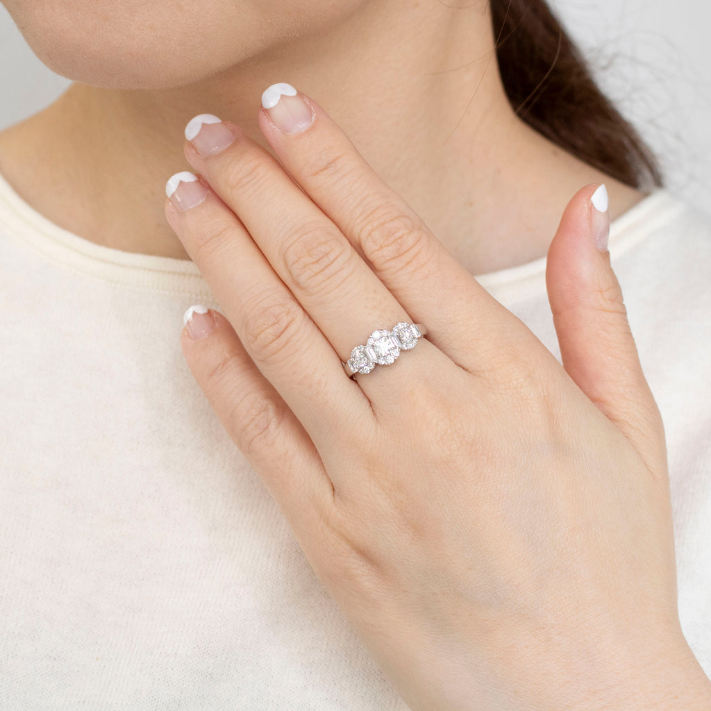 3石のダイヤの上下、リングの縁に当たる部分にダイヤの丸いアウトラインに合わせてメレダイヤを曲線状にセット。まるでフリルのようにリング全体を輝きで飾っています。