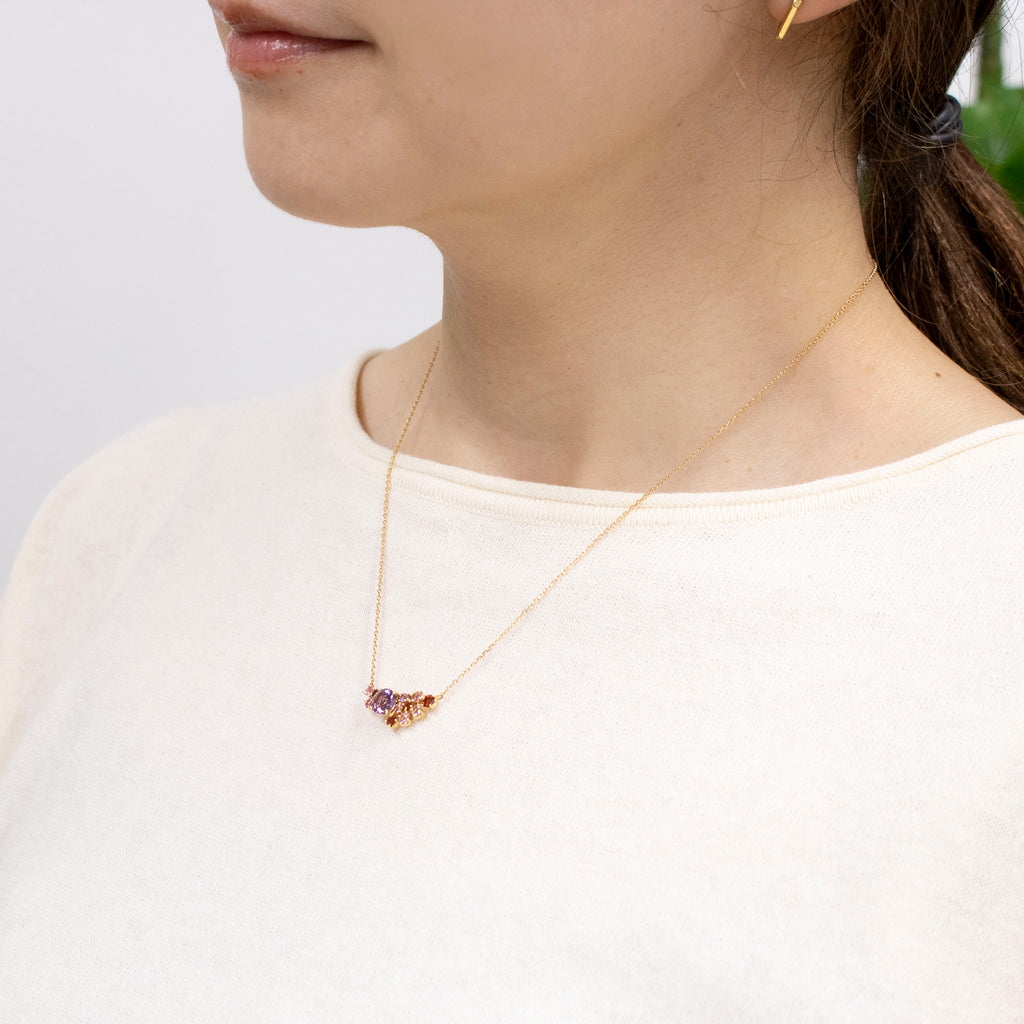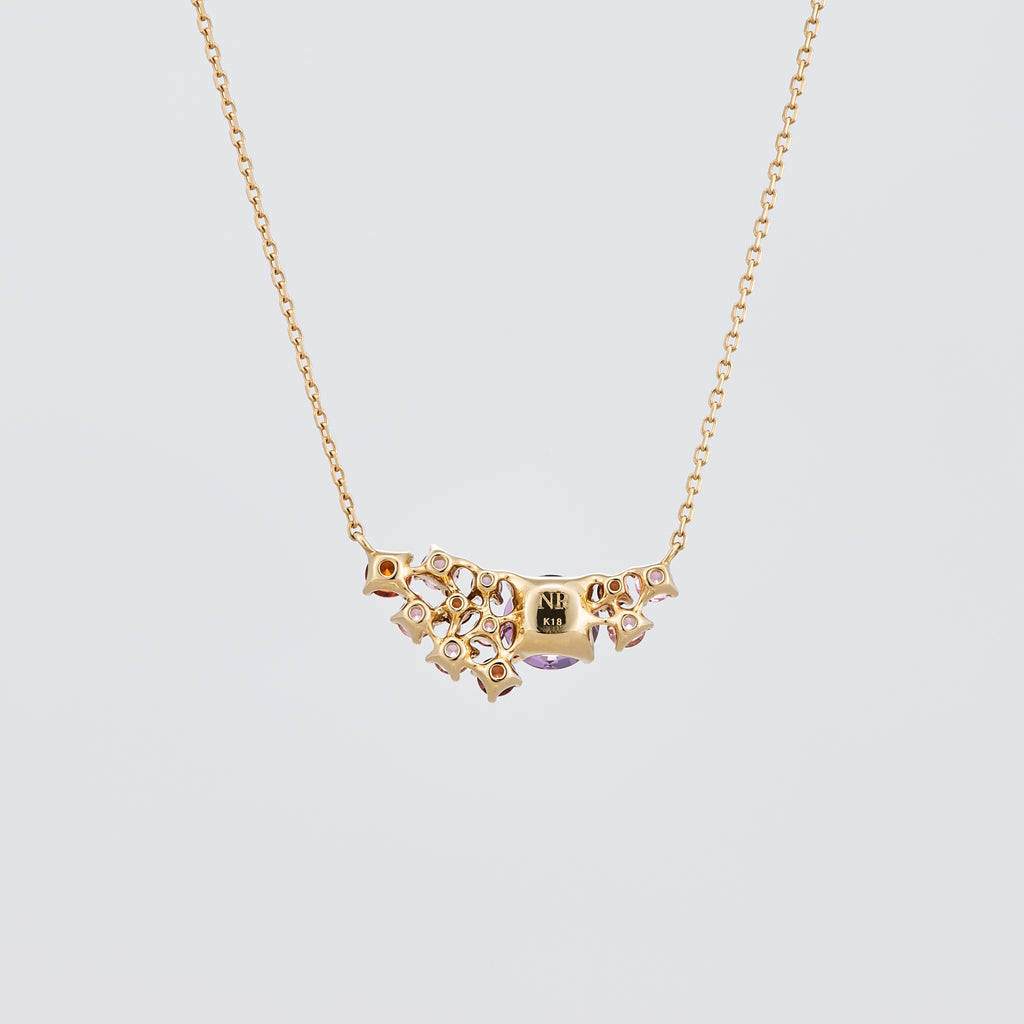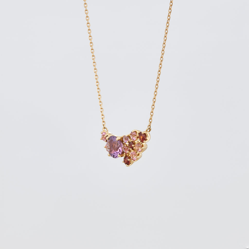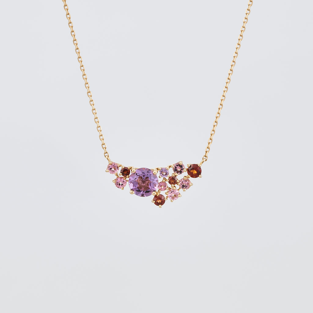 明るく華やかな印象の18金イエローゴールドに、紫色のアメシスト、赤色のガーネット、ピンク色のピンクトルマリンを、大小様々にボリューミーに配置。ひときわ大きく力強い輝きを放つアメシストがデザインのポイントです。