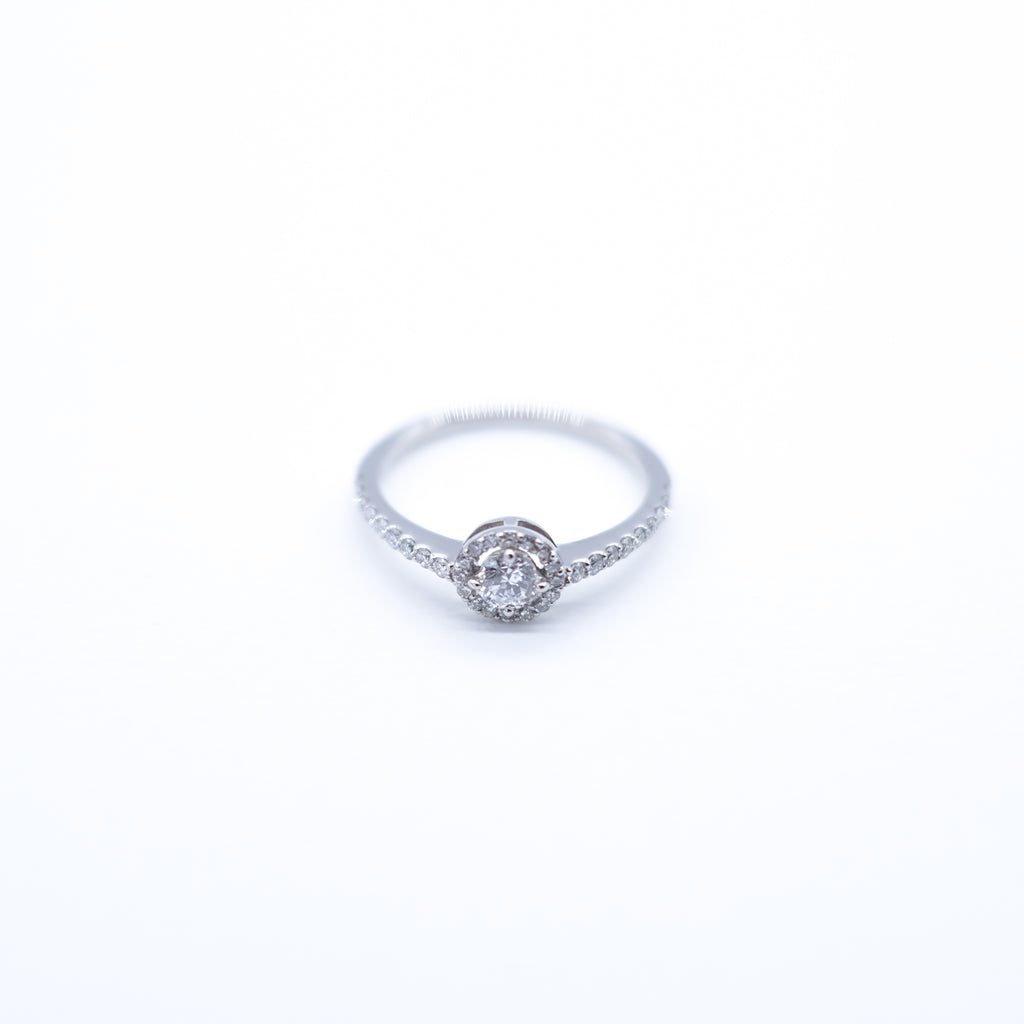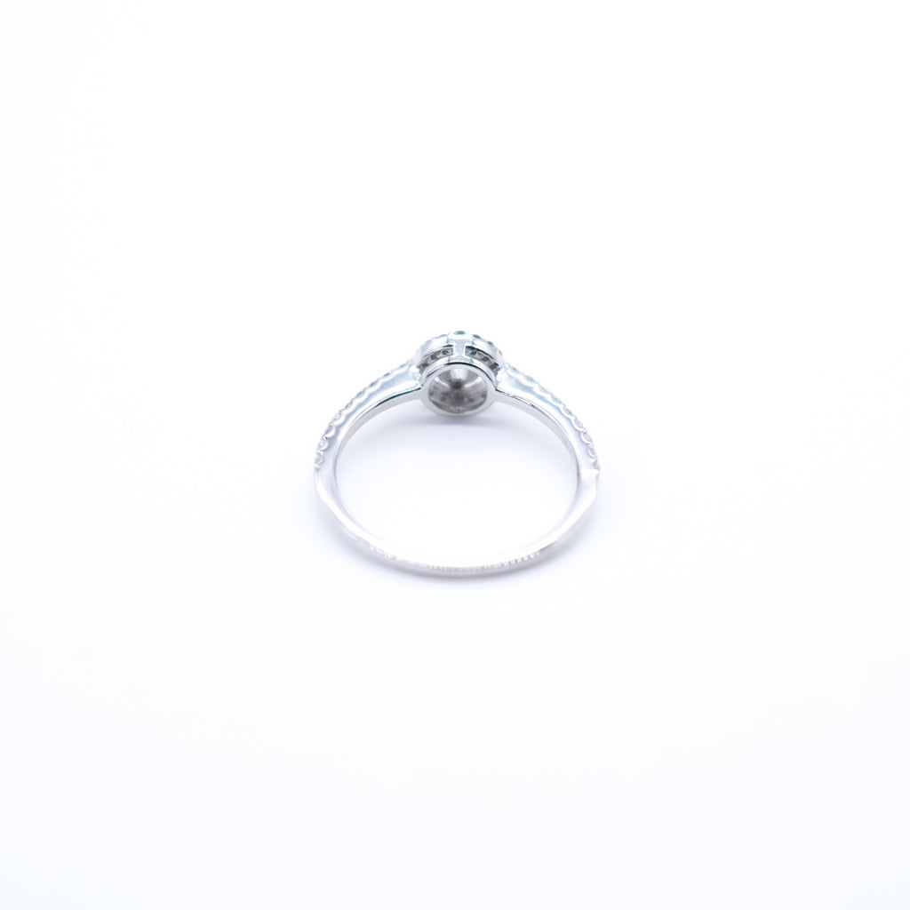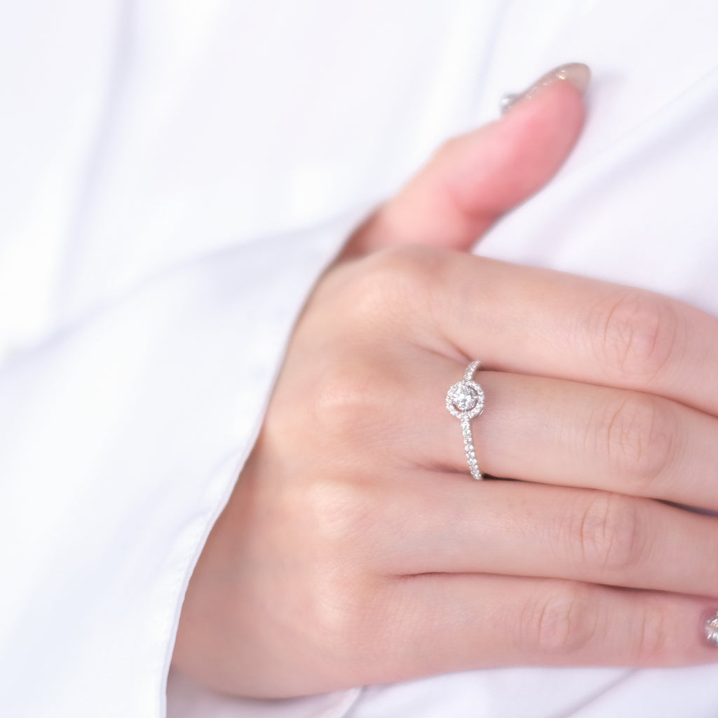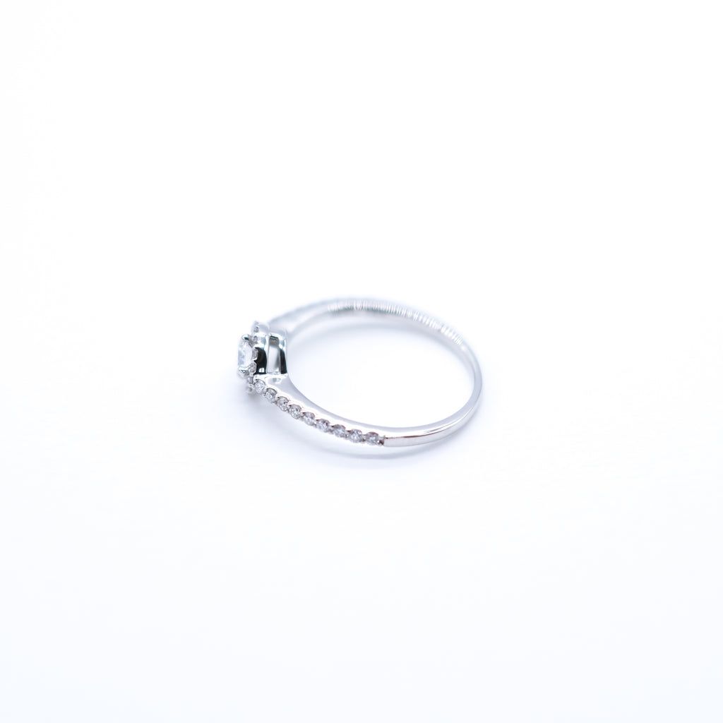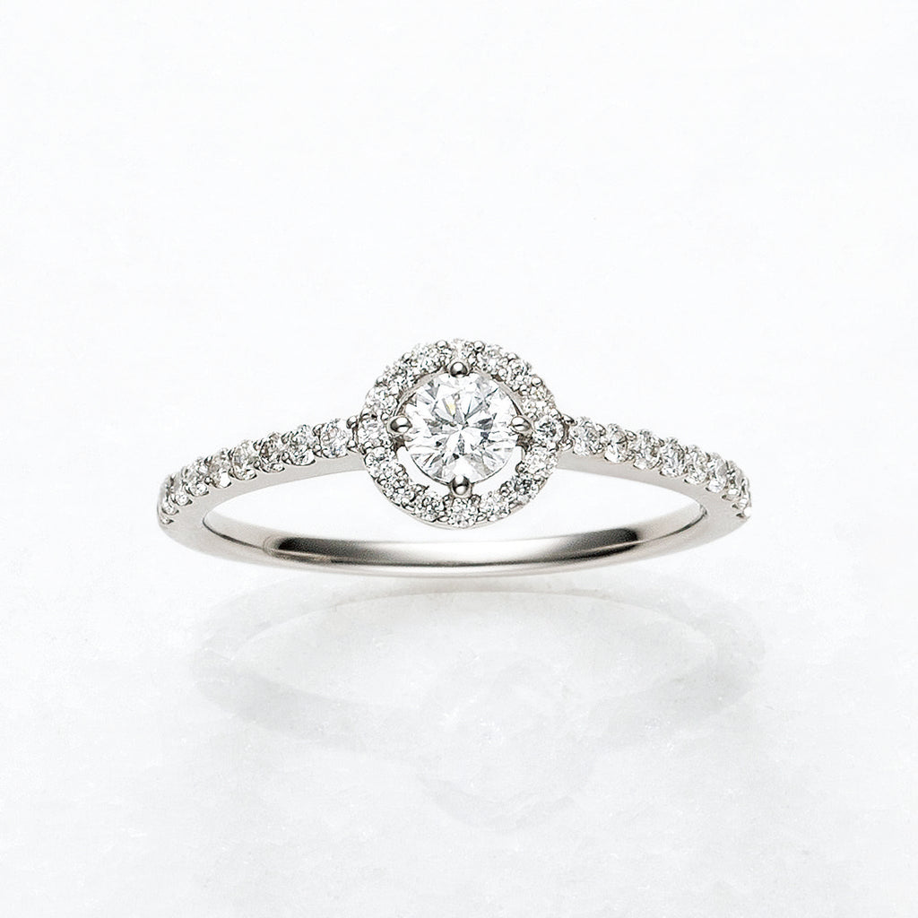 0.2ctのDカラー、フローレス、3エクセレントカットのダイヤを、センターストーンに見劣りしないよう選りすぐった良質なメレダイヤで取り巻いたデザインです。