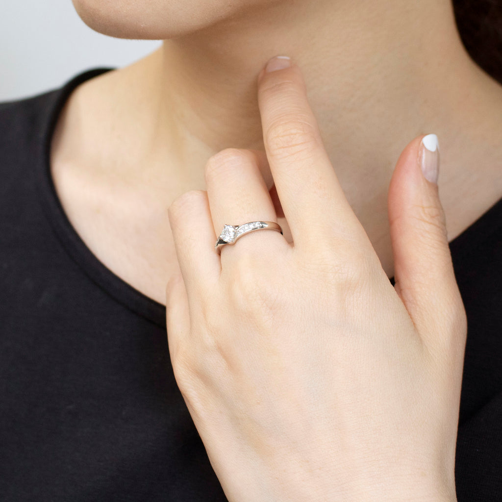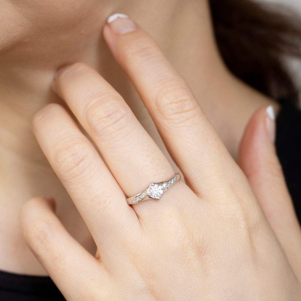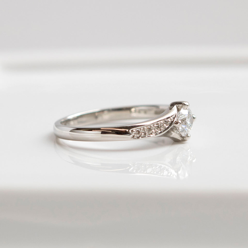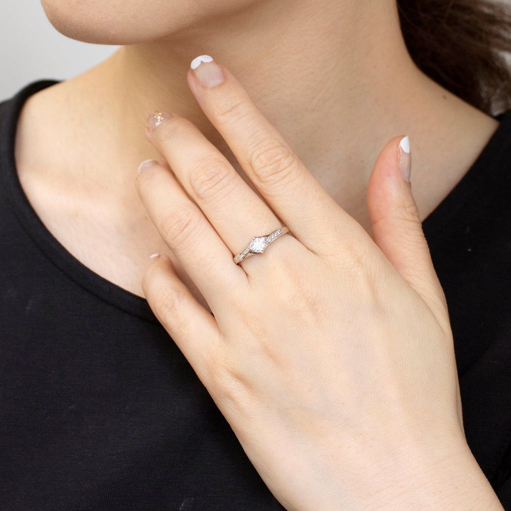 4本の爪でセットしたダイヤを、ひねりを加えたようなデザインの腕と組み合わせました。