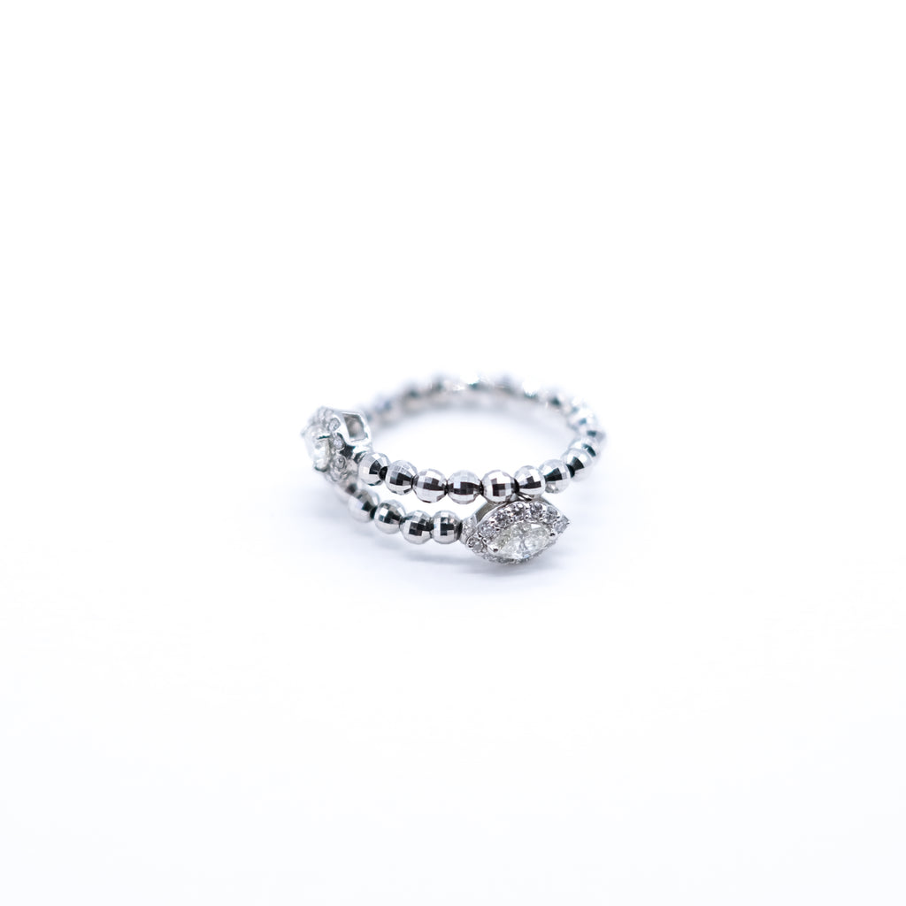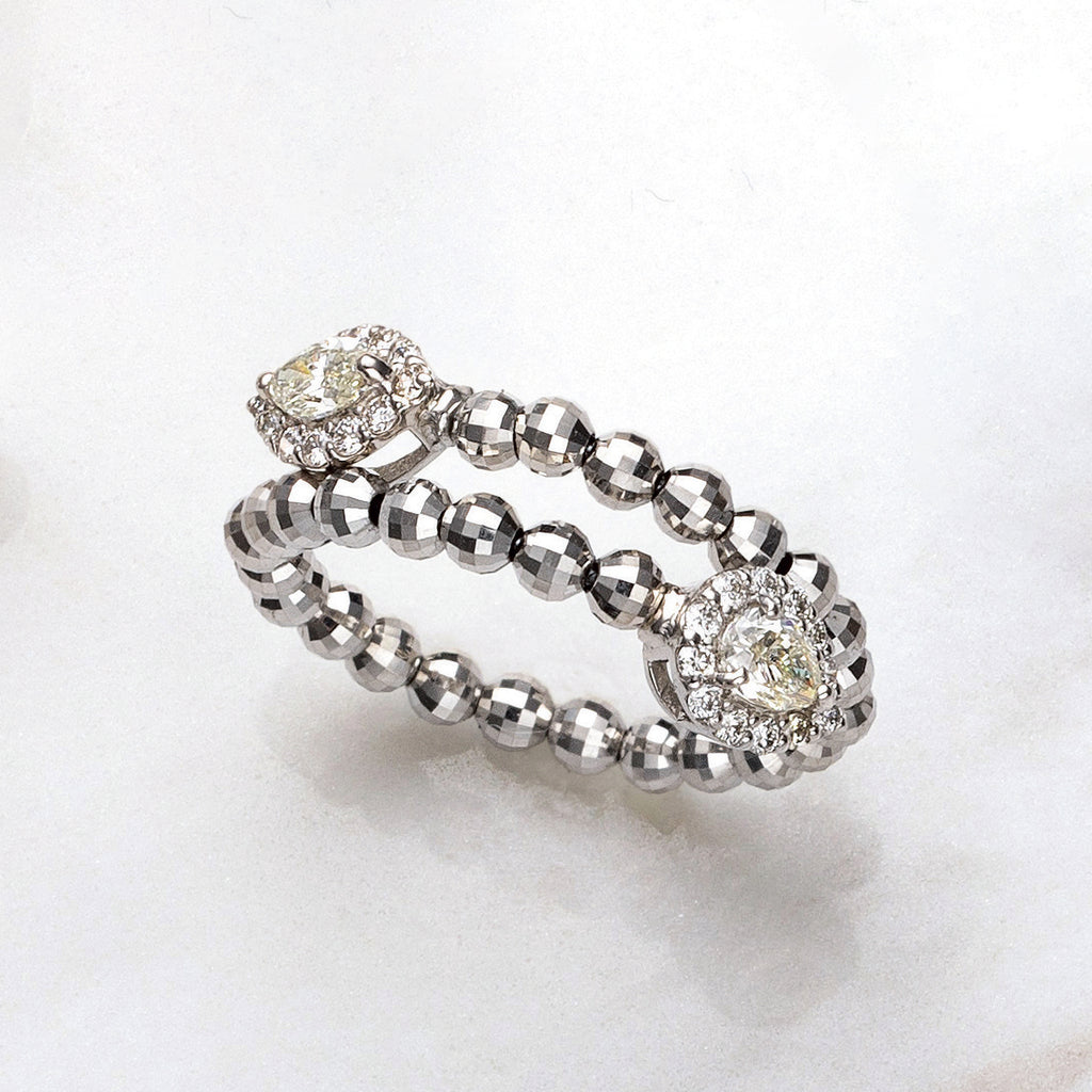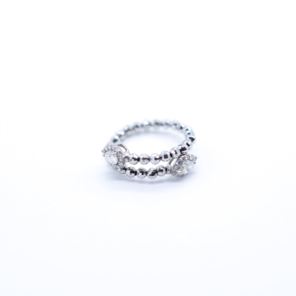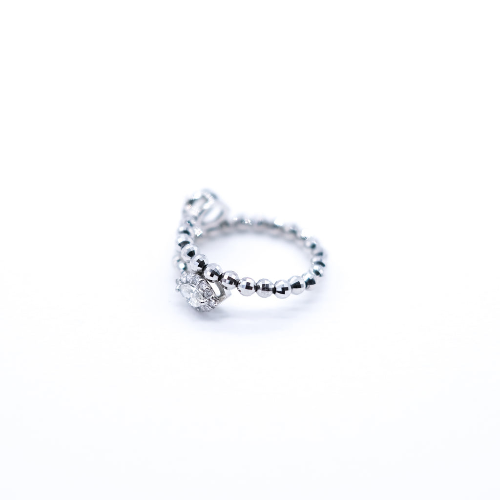 キラッと輝くプラチナ製のカットボールを連ねたリングの両端にダイヤをセットしました。