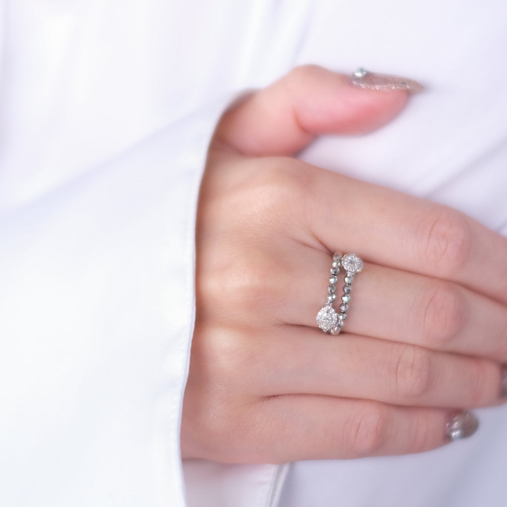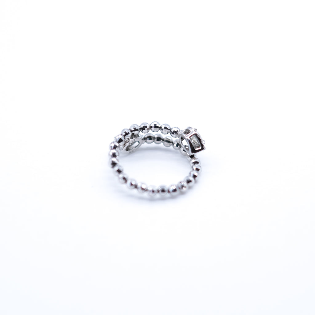 キラッと輝くプラチナ製のカットボールを連ねたリングの両端にダイヤをセットしました。