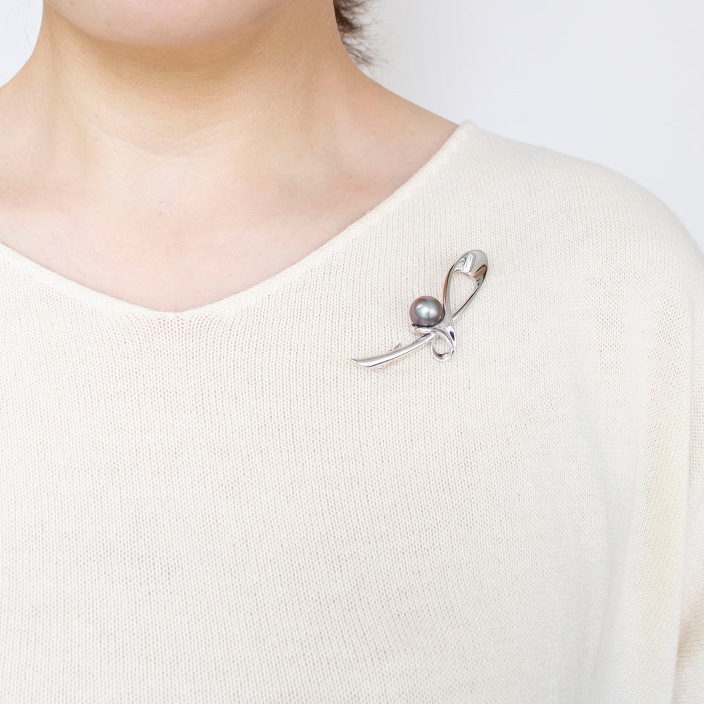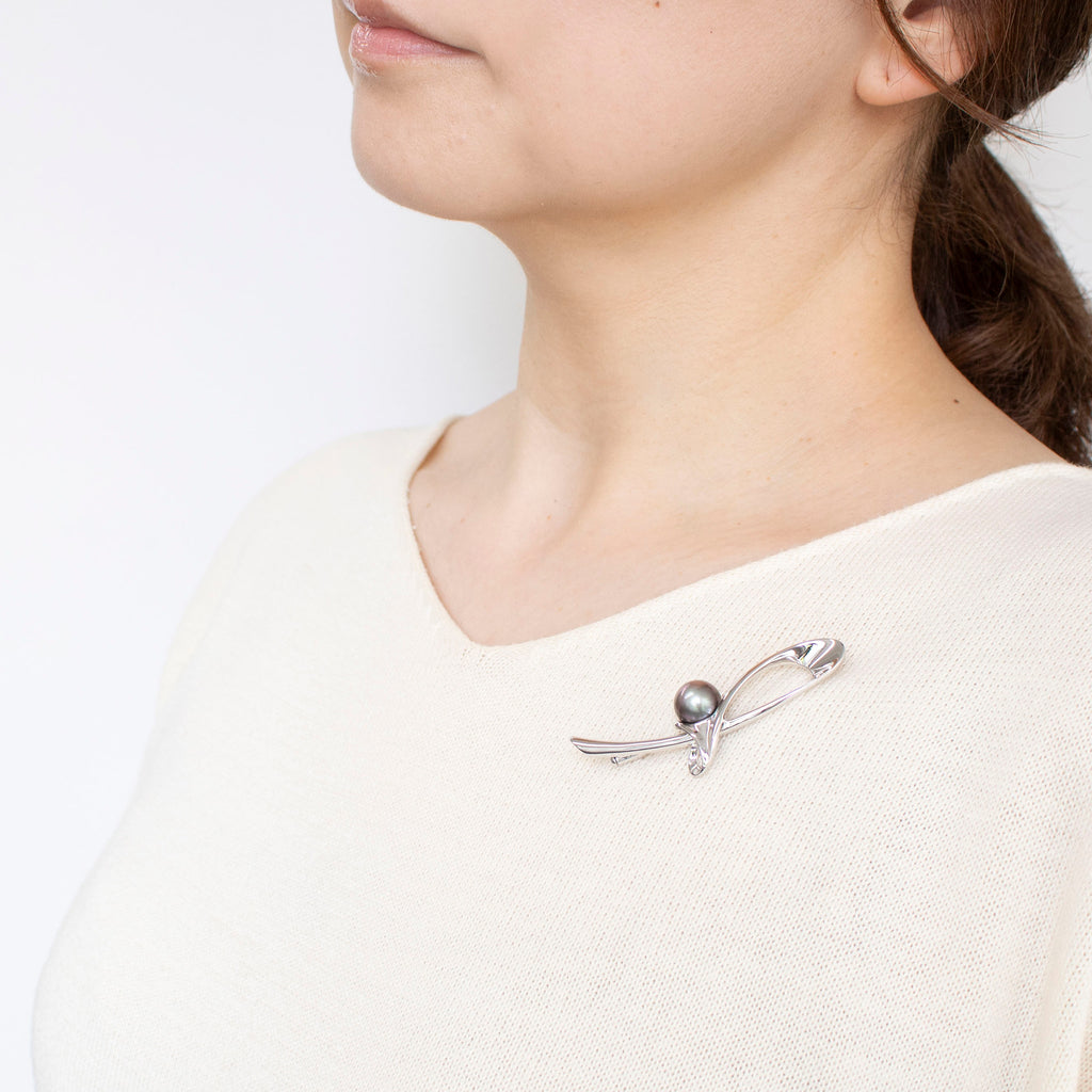 襟元に着けやすい流れるような曲線のデザインなので、普段ブローチを着けない方にもうまく使っていただけそうです。
