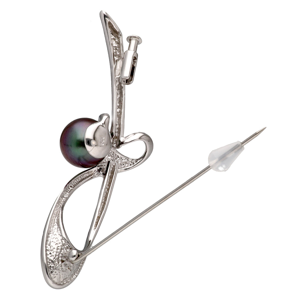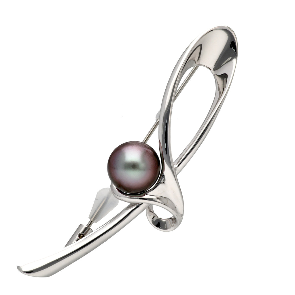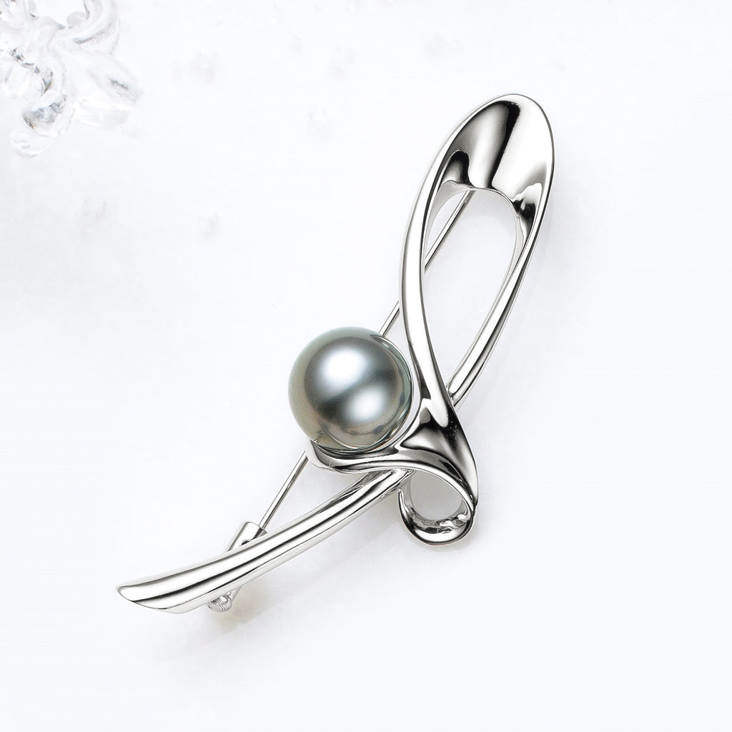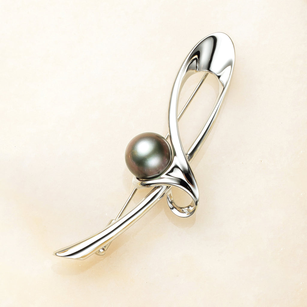 シルバーのダイナミックかつシャープな流れのあるデザインに黒蝶パールをセットしたブローチです。
