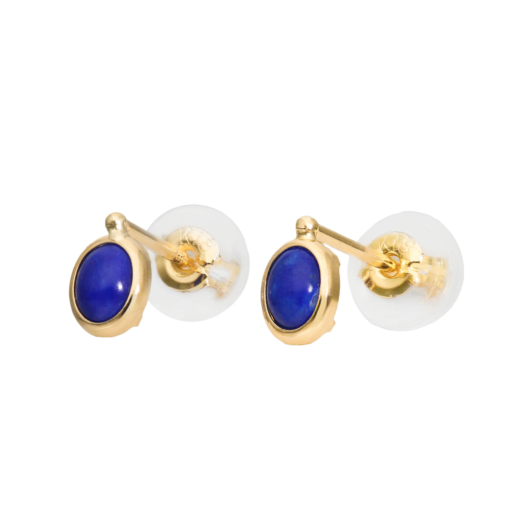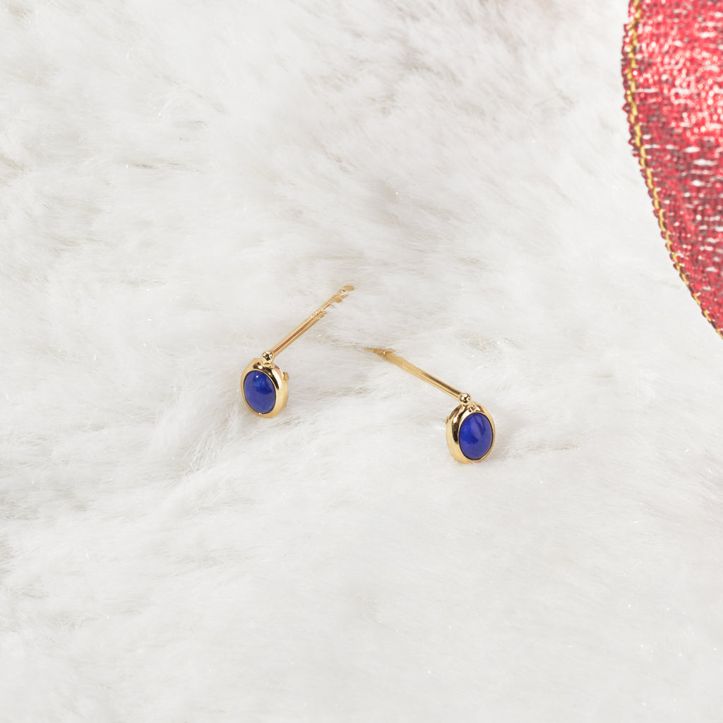 ラピスラズリの深い瑠璃色が最も映える18金イエローゴールドと組み合わせました。オーバルシェイプのラピスラズリを18金イエローゴールドで額縁のようにぐるりと取り巻きました。ピアスのポストが中央ではなく上の端に付いているので、耳に着けた時にピアスホールの位置によってはラピスラズリが耳たぶから少しはみ出るのが特徴です。
