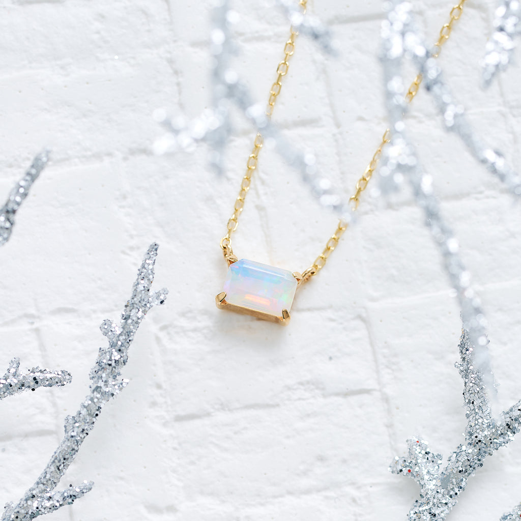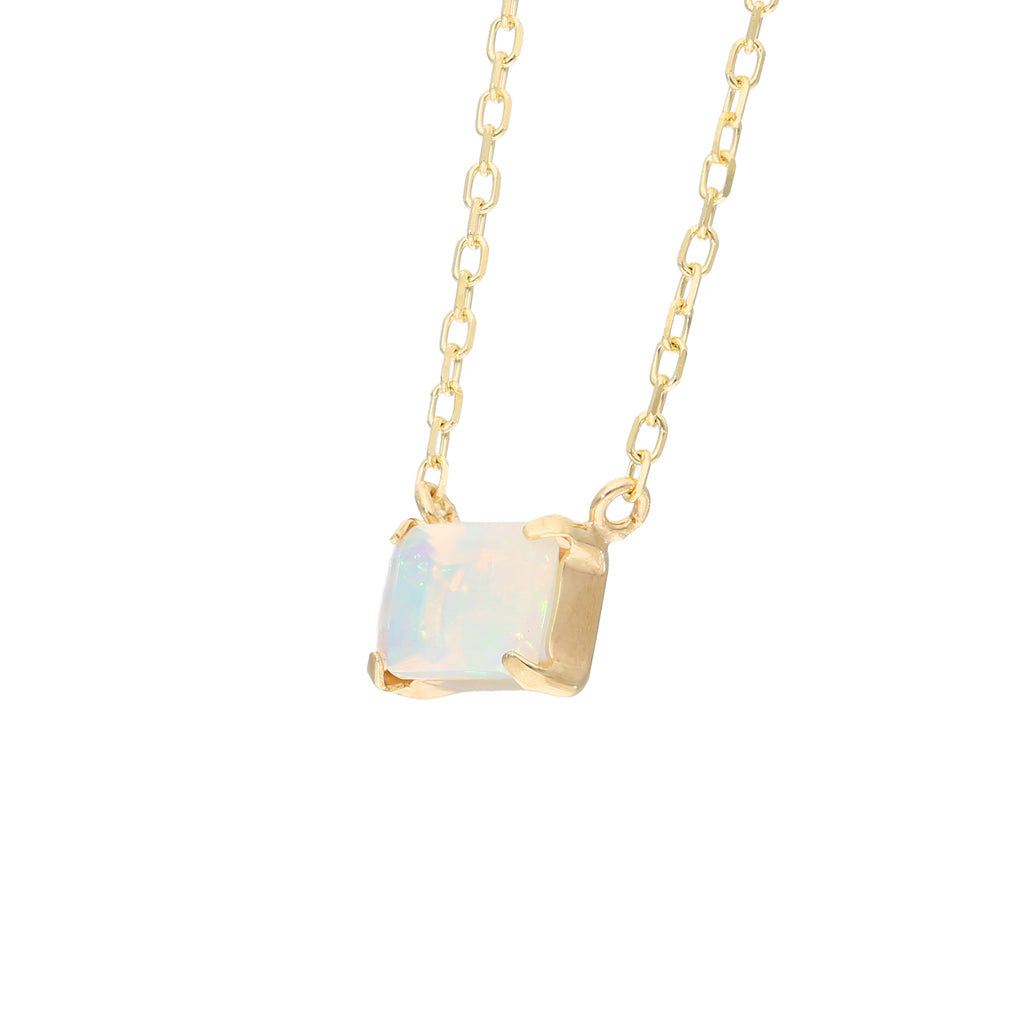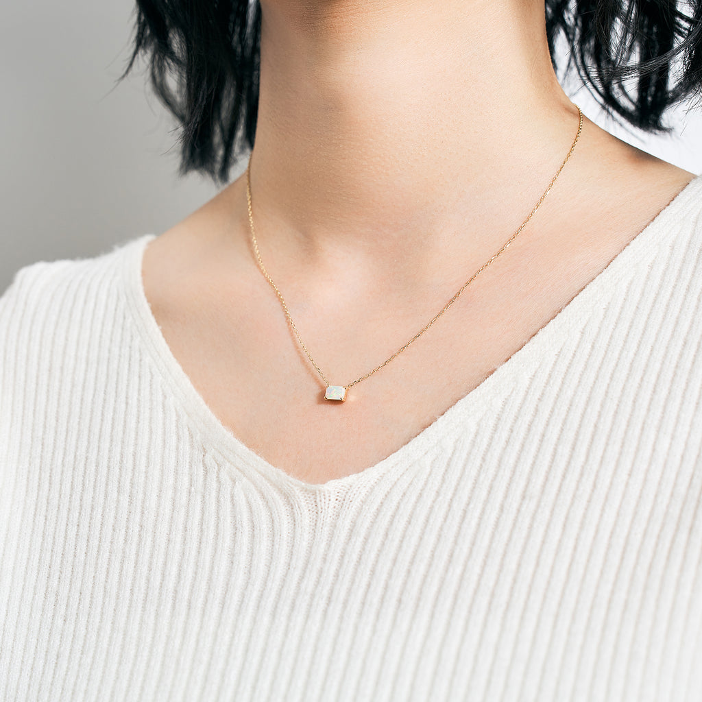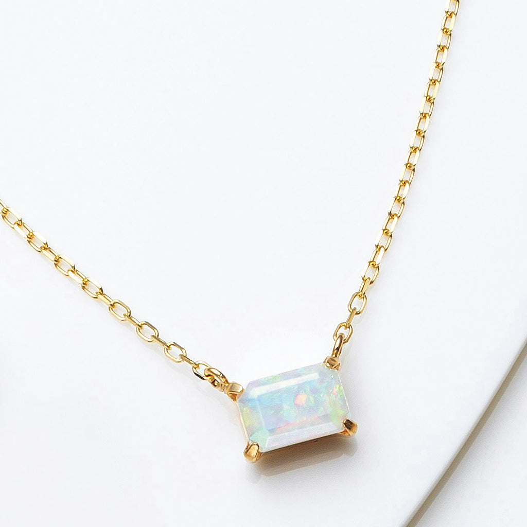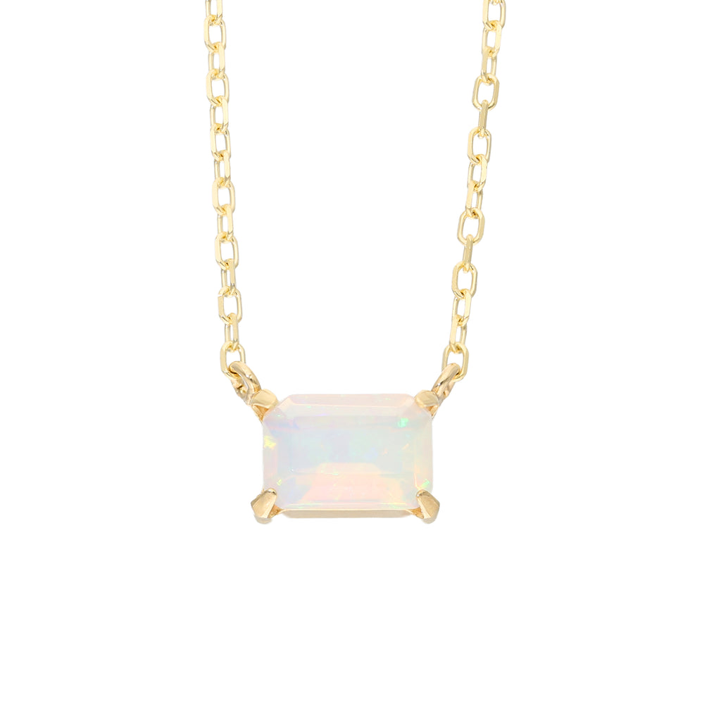 0.5ctのエメラルドカットのオパールを10金イエローゴールド製の枠に横向きにセット。ペンダントトップとチェーンを直接繋げたヌーディーなデザインです。