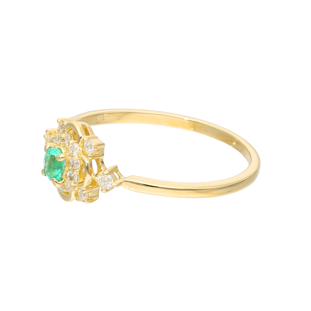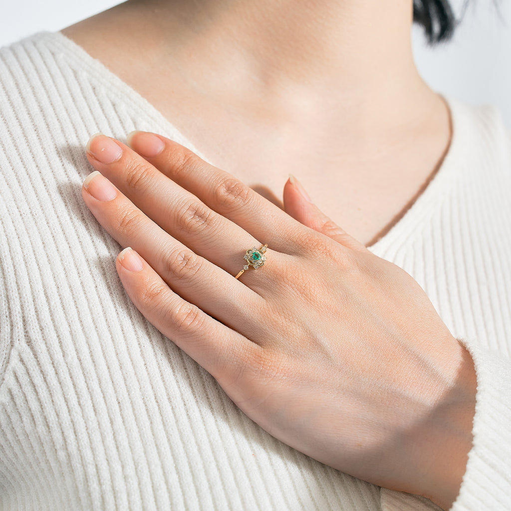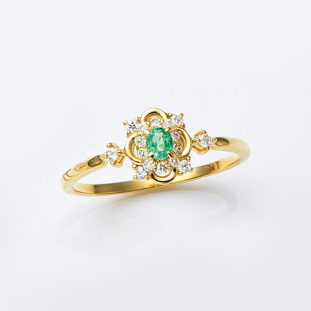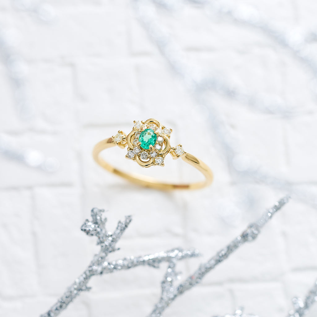 エメラルドの周りをメレダイヤでぐるりと取り巻いて、さらに18金の曲線とメレダイヤで飾った、繊細でクラシカルなデザインです。