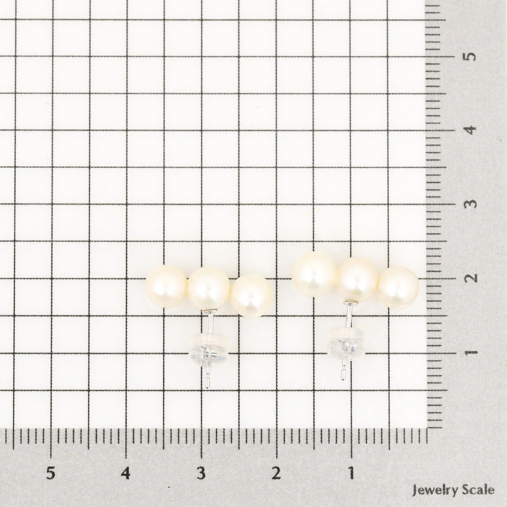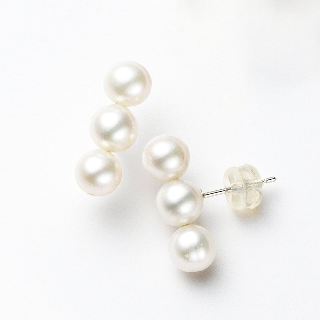 同じサイズの淡水パールを3珠一列に並べて、真ん中の珠にピアスポストを付けたデザインです。