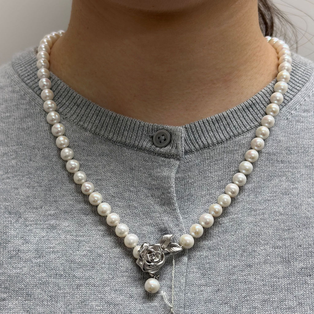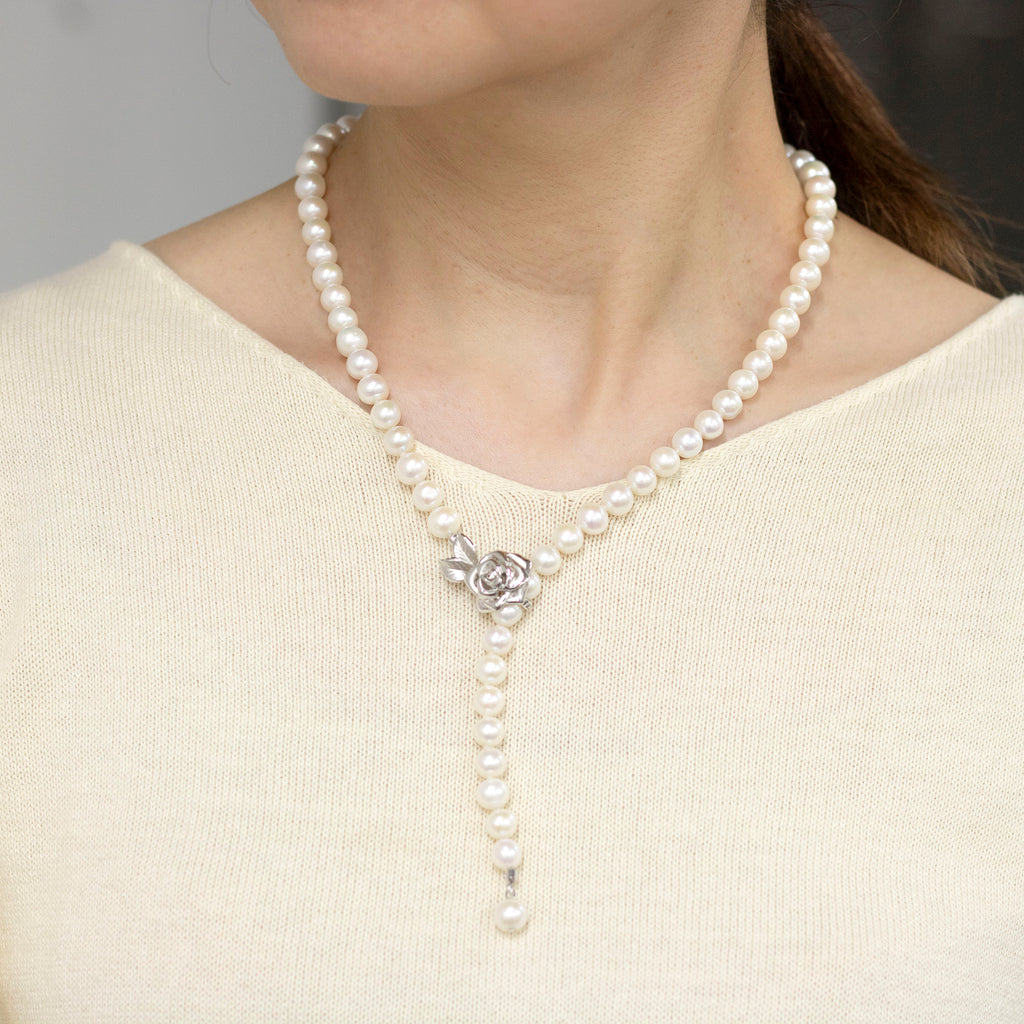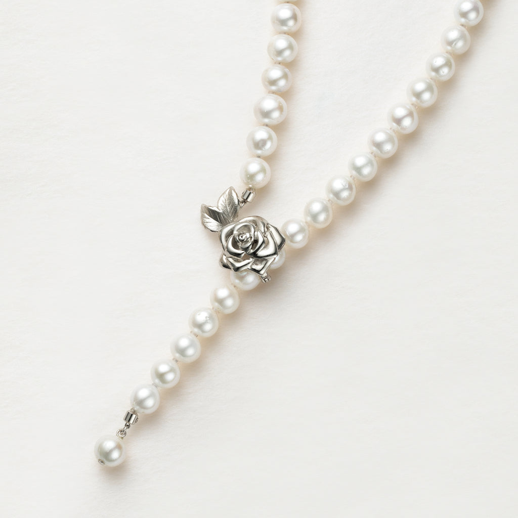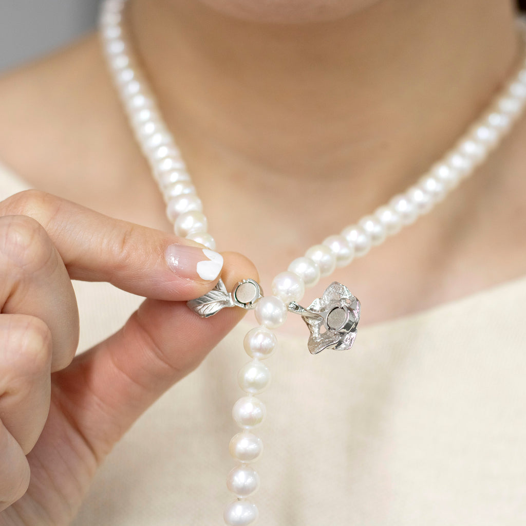 バラのデザインが可愛らしいマグネット式の留め具がついた淡水パールのネックレスです。