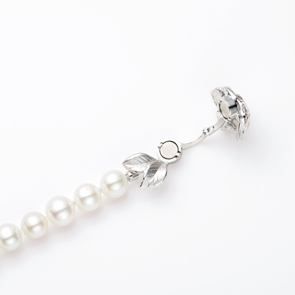 パールとパールの間を挟むように留めるマグネット式の留め具を使用。可愛らしいバラの花がデザインされていて留め具を体の前に持ってきてもおしゃれです。