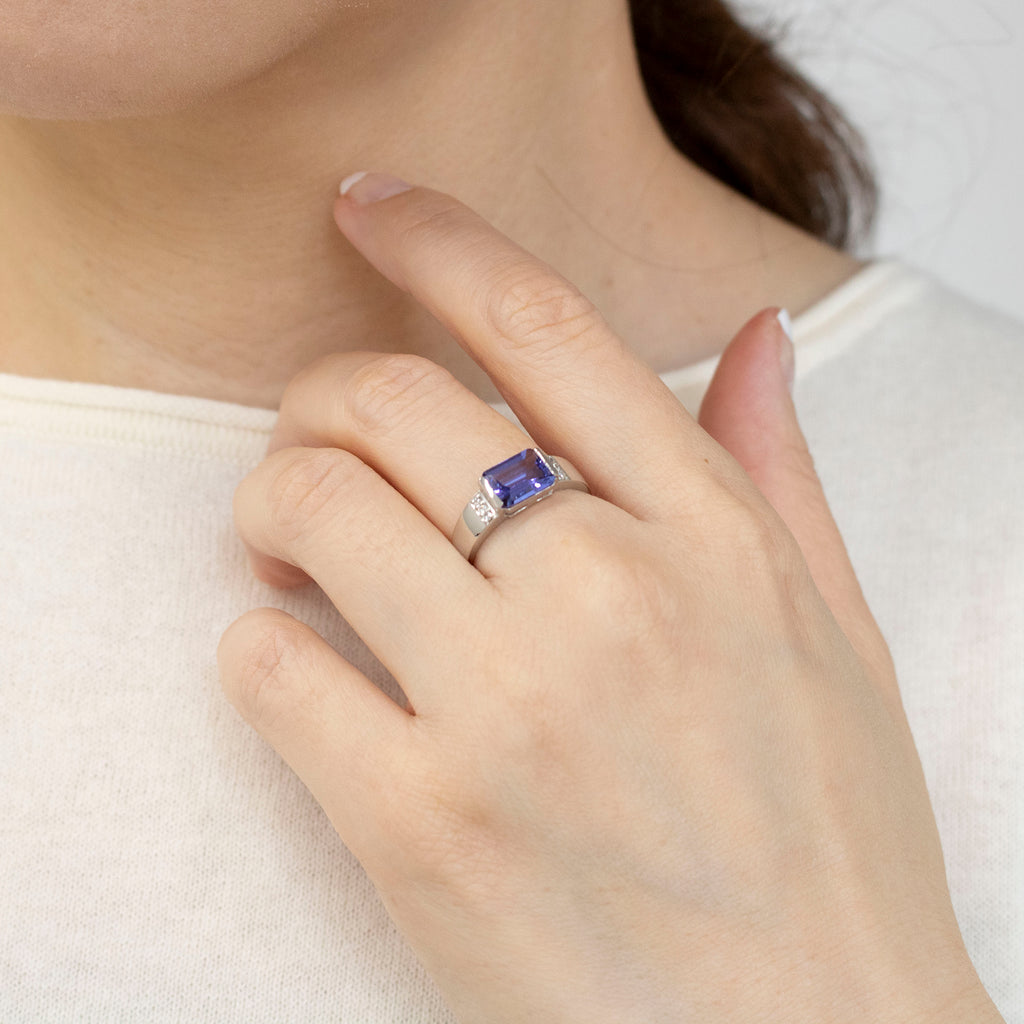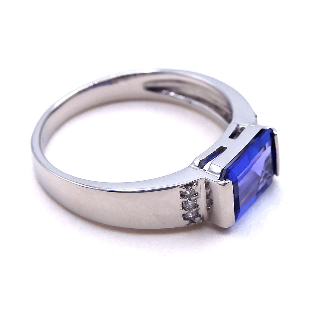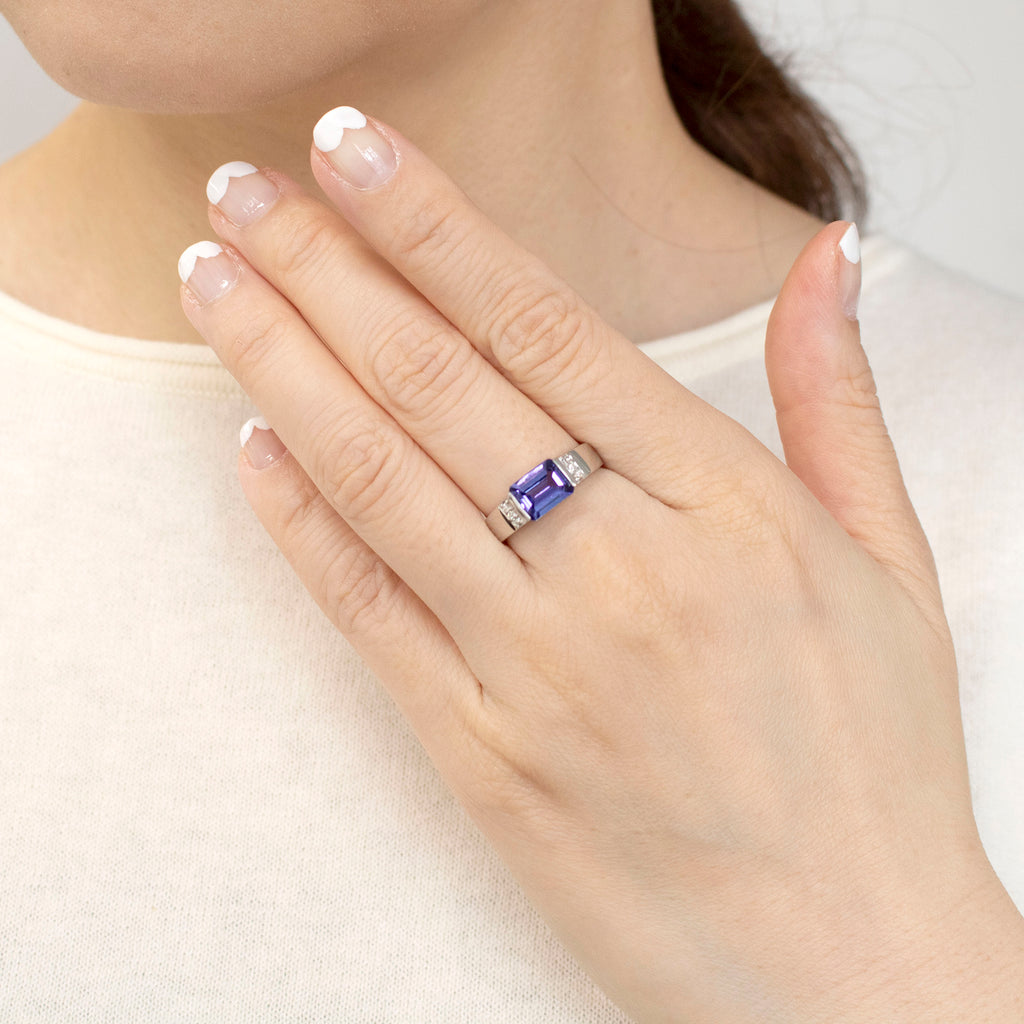 気品漂うエメラルドカットに整えられたタンザナイトを人気デザインのリングにセットしました。タンザナイトの美しい青紫色によく合うプラチナ製のリングです。
