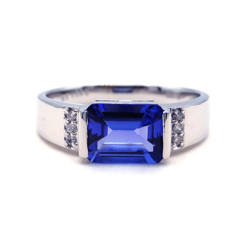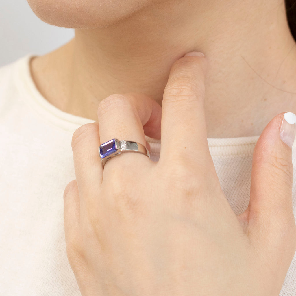 大粒1.2ctのタンザナイトを幅の広いリングで挟み込むようにセット。ひっかかりが少なくスタイリッシュな印象のデザインはユニセックスでお使いいただけそうです。