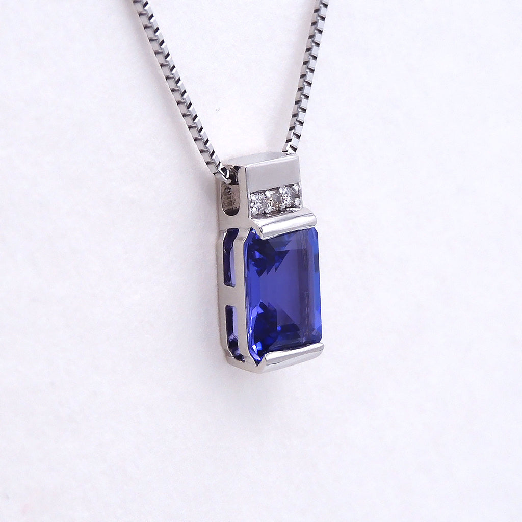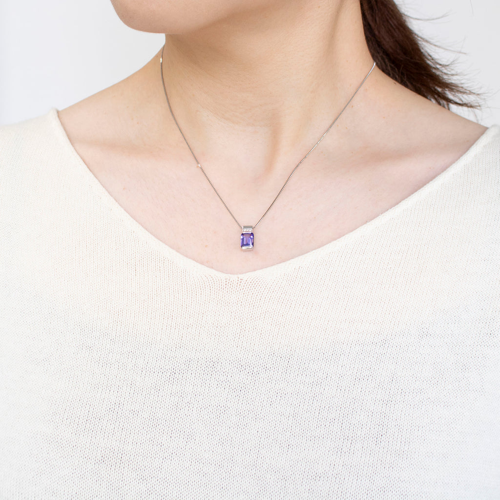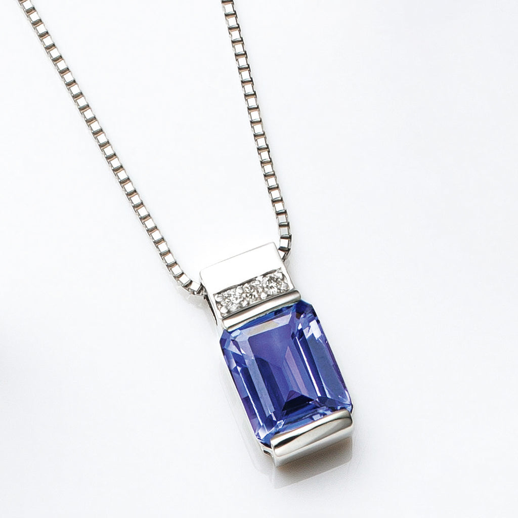 気品漂うエメラルドカットに整えられたタンザナイトを人気デザインのネックレスにセットしました。タンザナイトの美しい青紫色によく合うプラチナ製です。