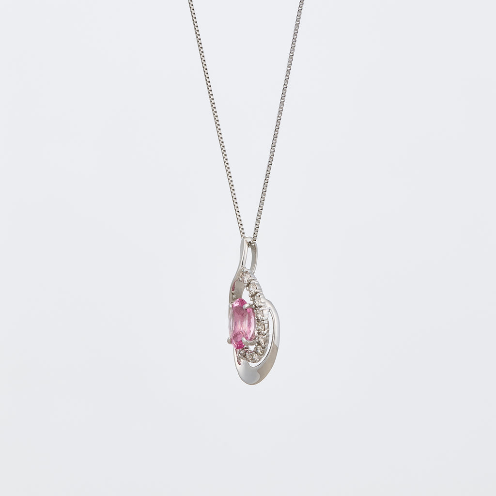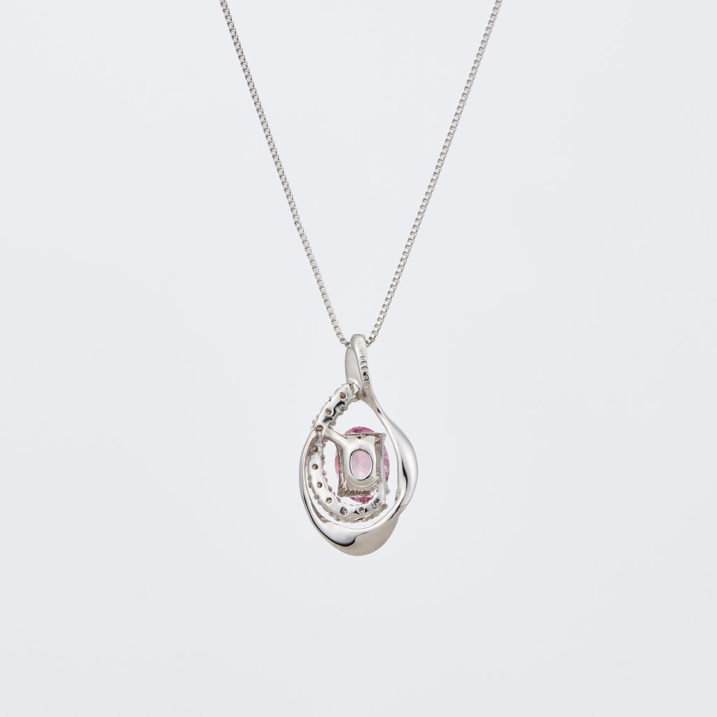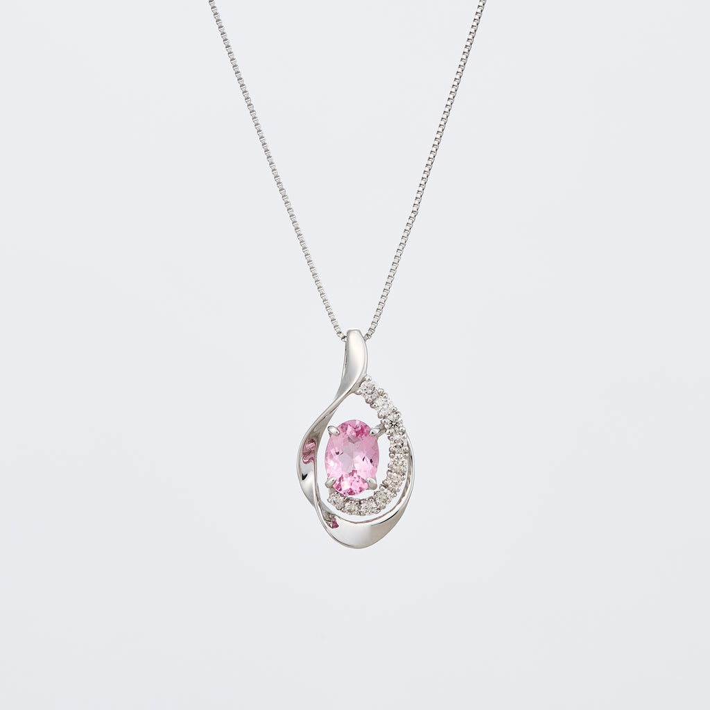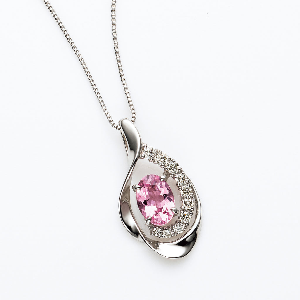 ひねりを加えてボリューム感を出した人気デザインのペンダントトップです。片側にだけ留めたメレダイヤがキラッと輝いてモルガナイトを引き立たせます。