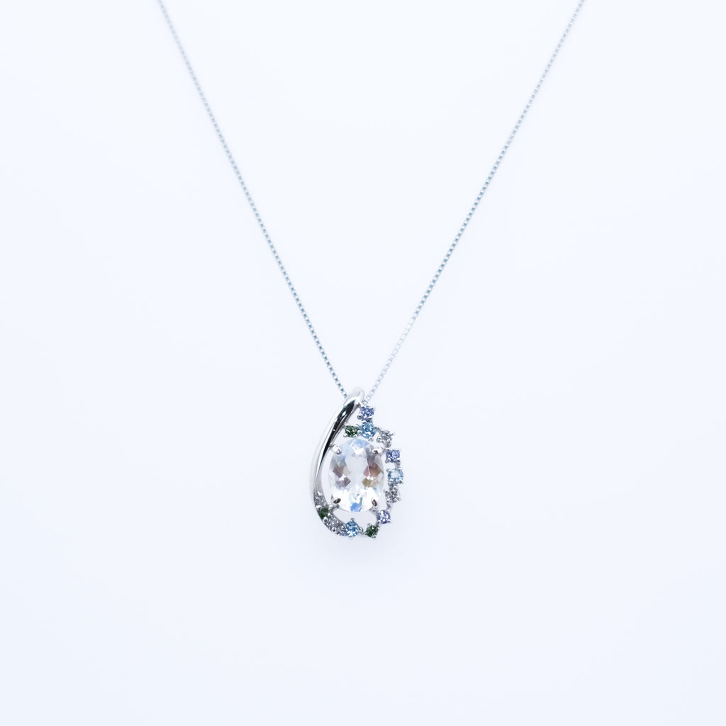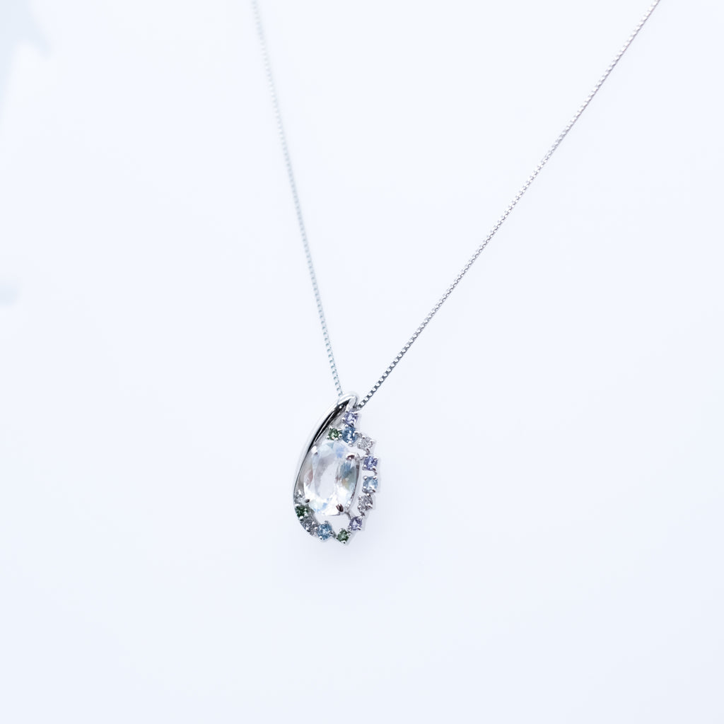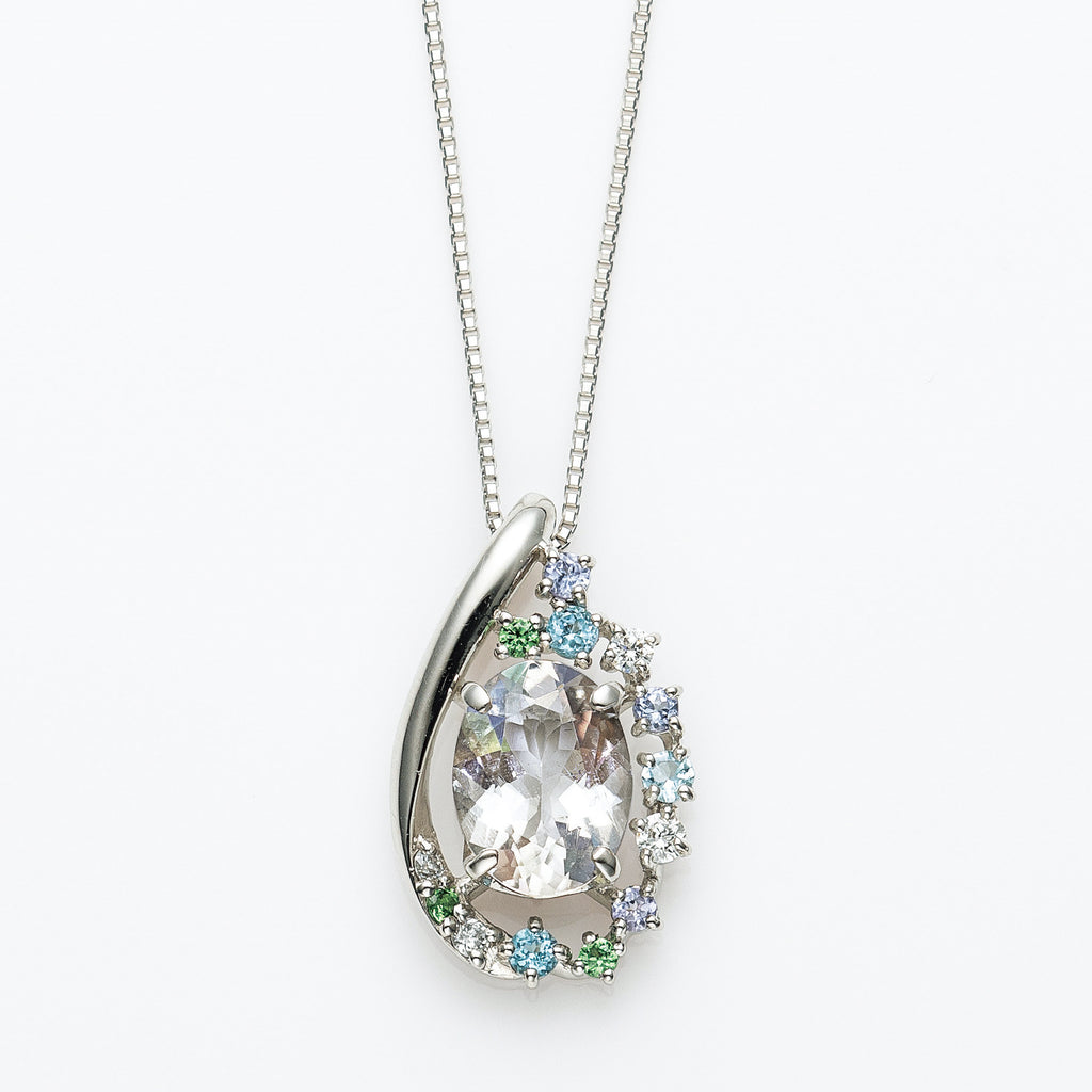ムーンストーンやサンストーンなどが含まれるフェルスパーグループに属して、アンデシンとラブラドライトの中間に位置する成分からできているアンデシンラブラドライト。大粒0.8ctのアンデシンラブラドライトを中央にセットして、周りにメレダイヤとパステルカラーの宝石を散りばめた、幻想的な美しさを楽しめるネックレスです。