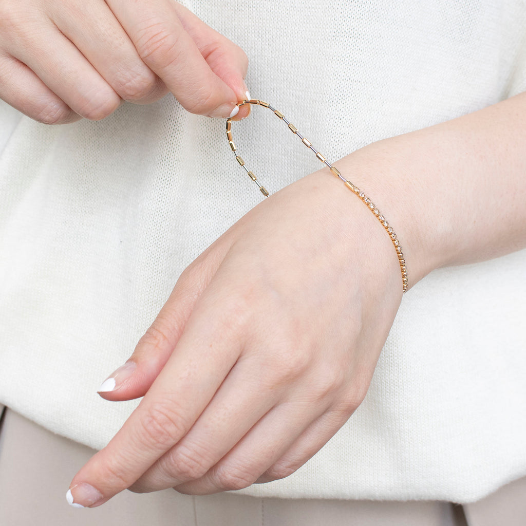 ストレッチタイプのパーツを使用した部分にはカットが施された筒状のパーツを使用していて、着け心地が良く、控えめながらもキラッと輝きを放ちます。