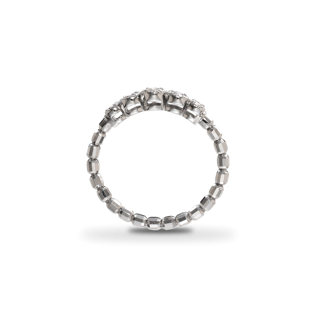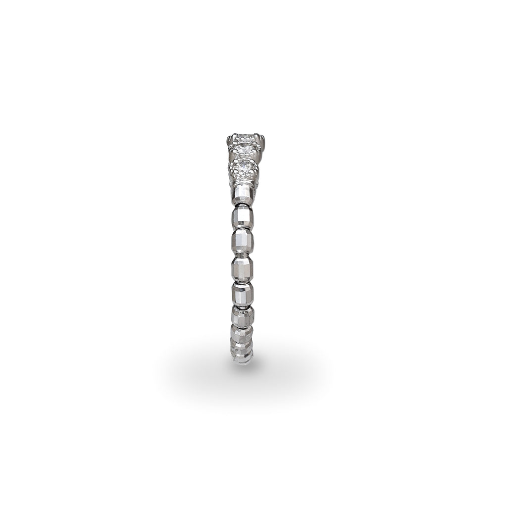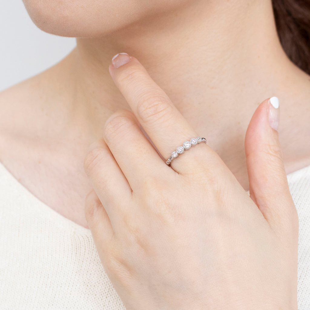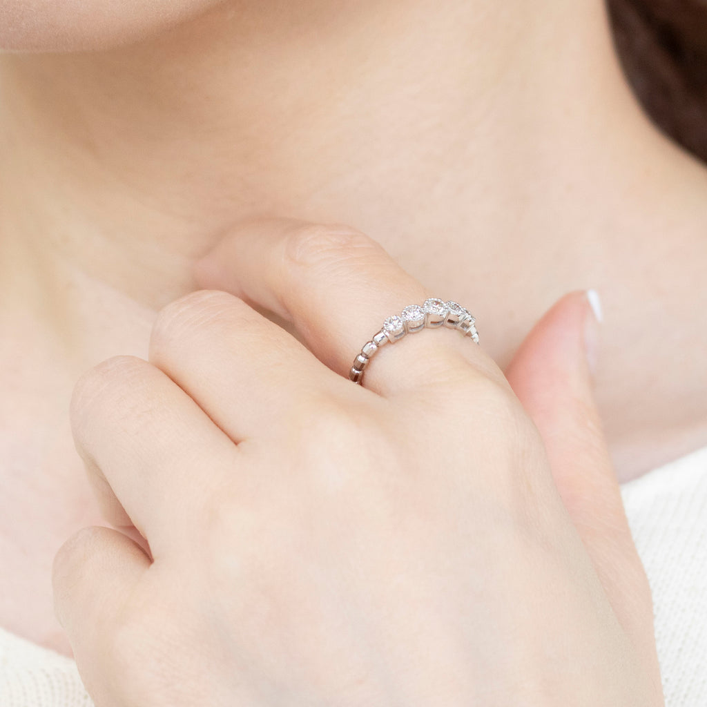 キラキラと輝くプラチナ製のカットボールを連ねたリングの中央にメレダイヤを5石並べて留めました。メレダイヤは繊細なミル打ち風のテクスチャーでぐるりと取り巻いてあり、クラシカルな雰囲気です。