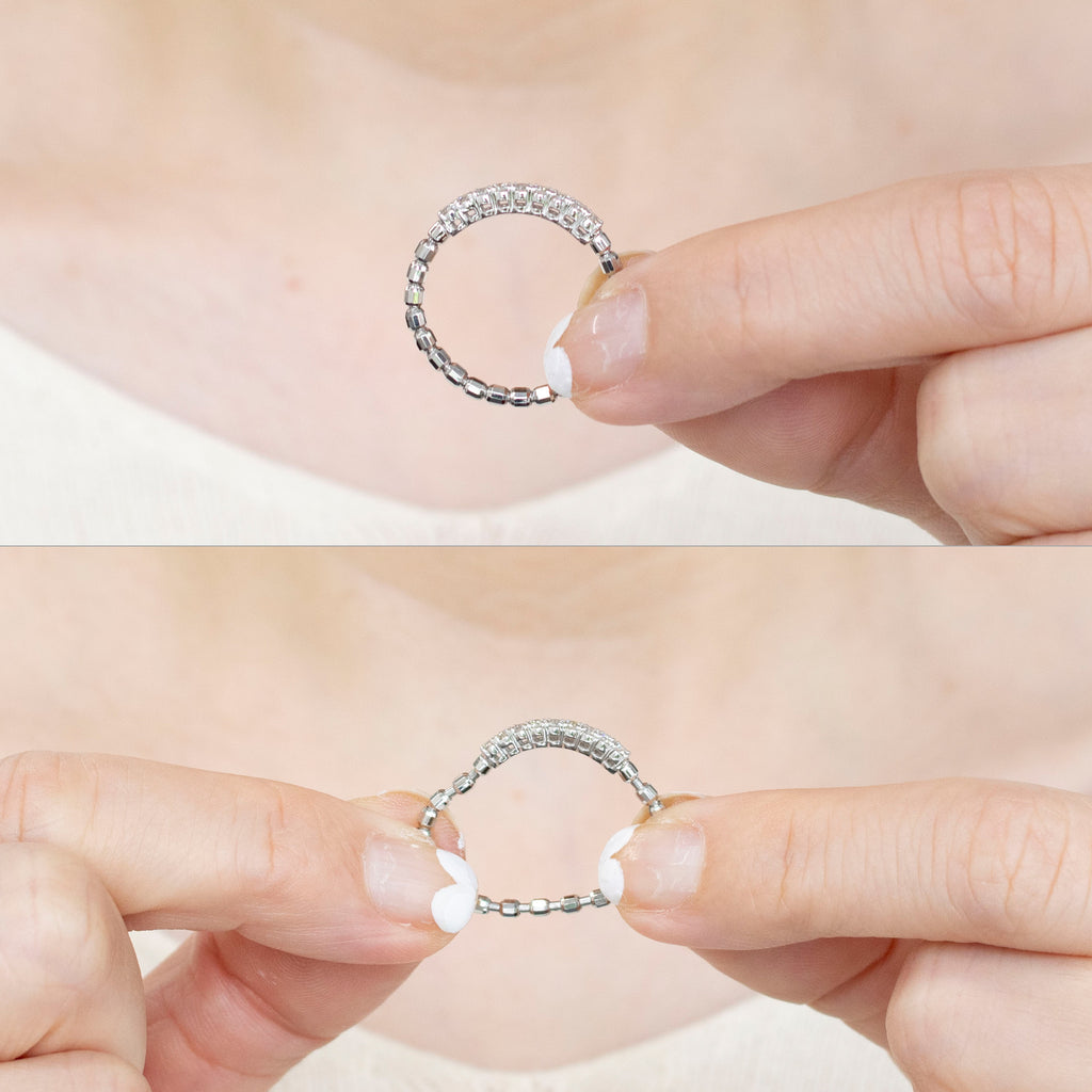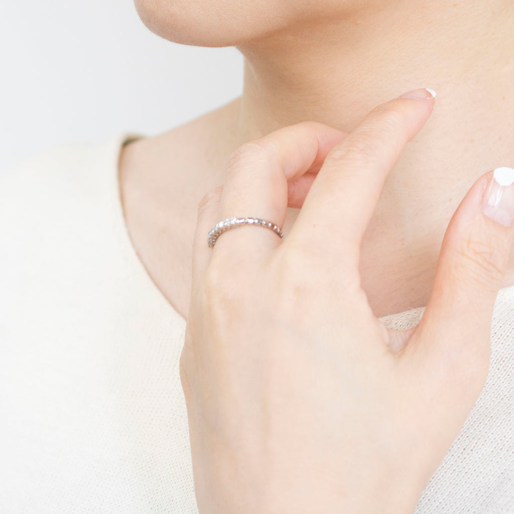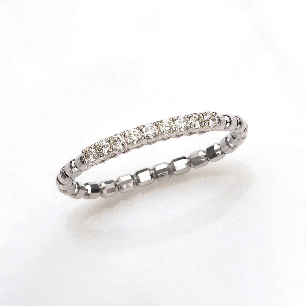 一見すると普通のハーフエタニティリングのようなデザインですが、軽くて伸縮するのでラクな着け心地でリングをお楽しみいただけます。