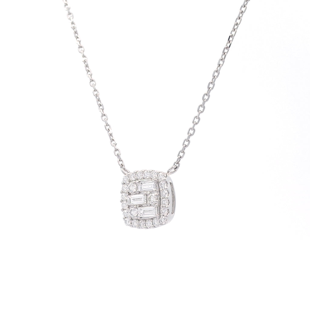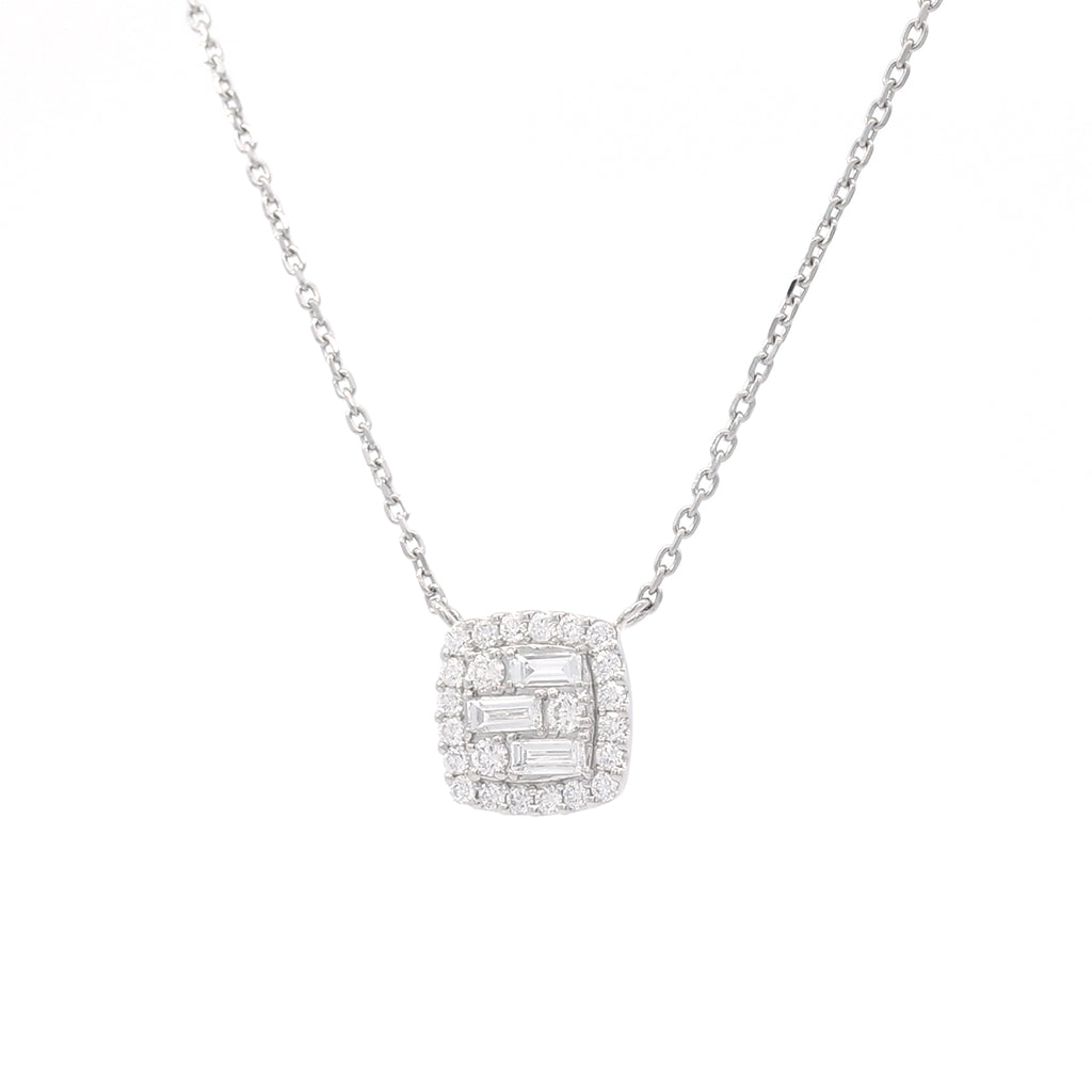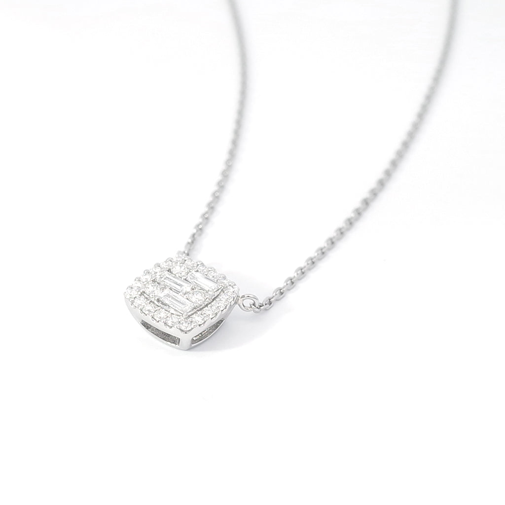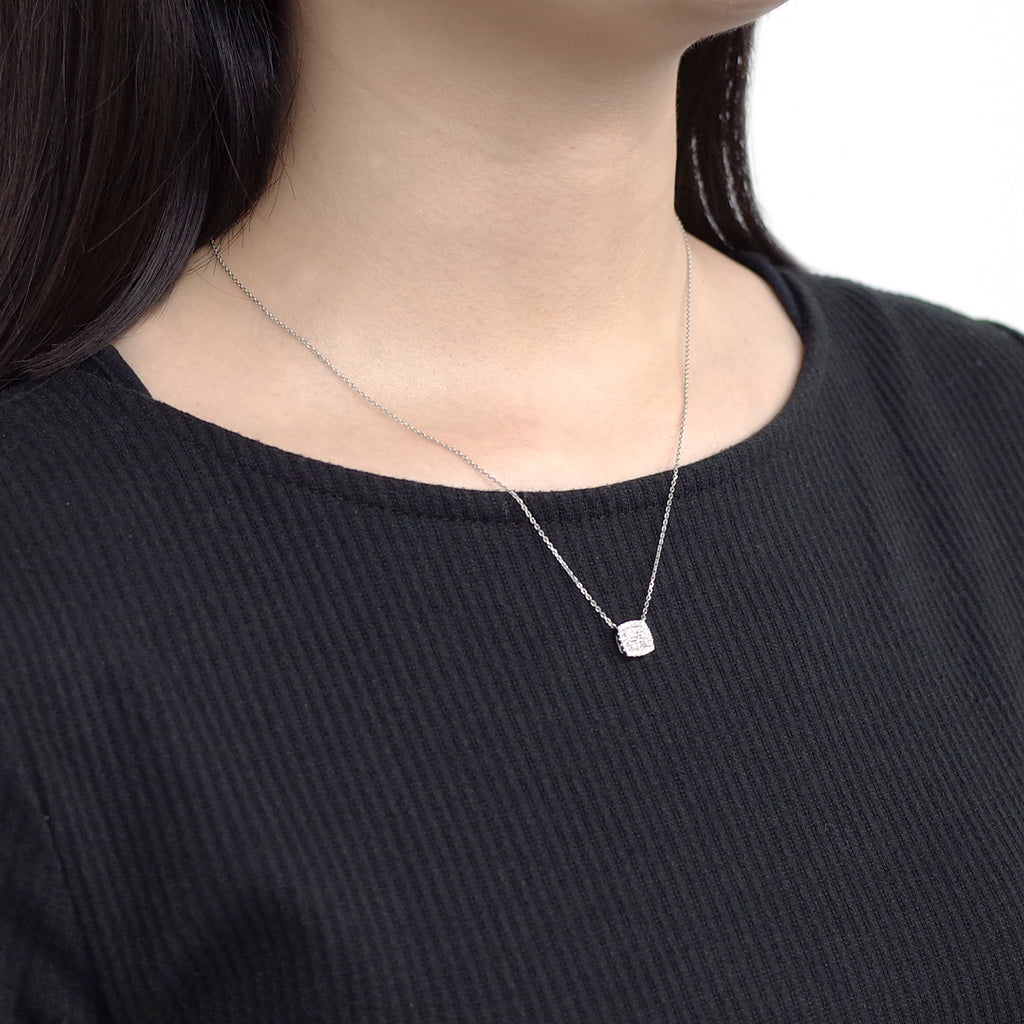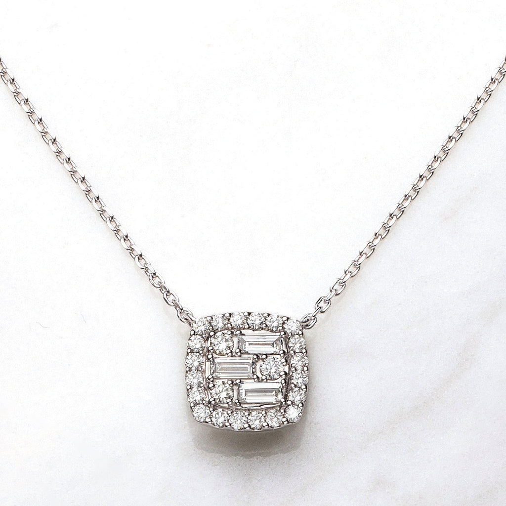 正方形の形にメレダイヤで取り巻いて、キラキラとしたダイヤの眩い輝きが胸元を飾るラグジュアリーなネックレスです。