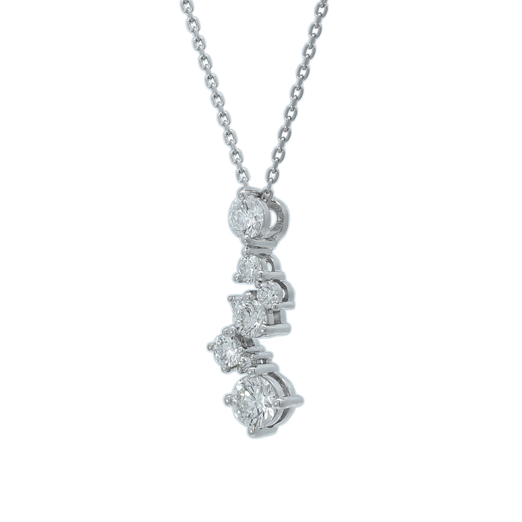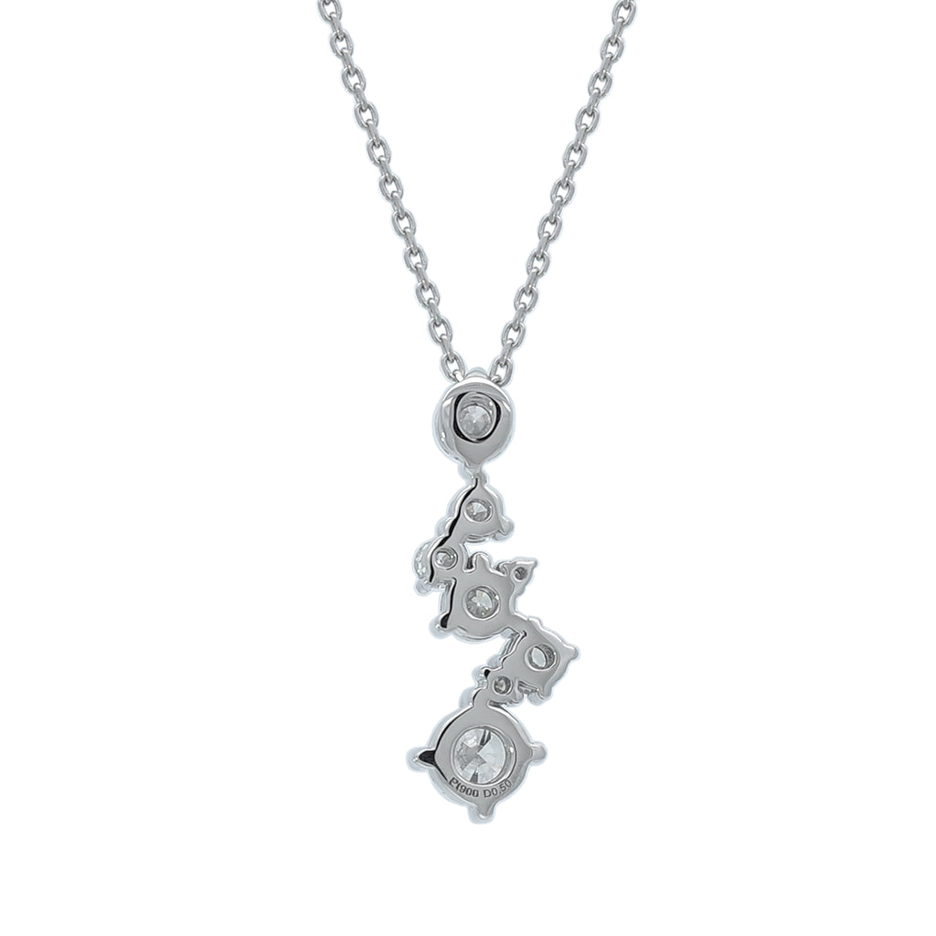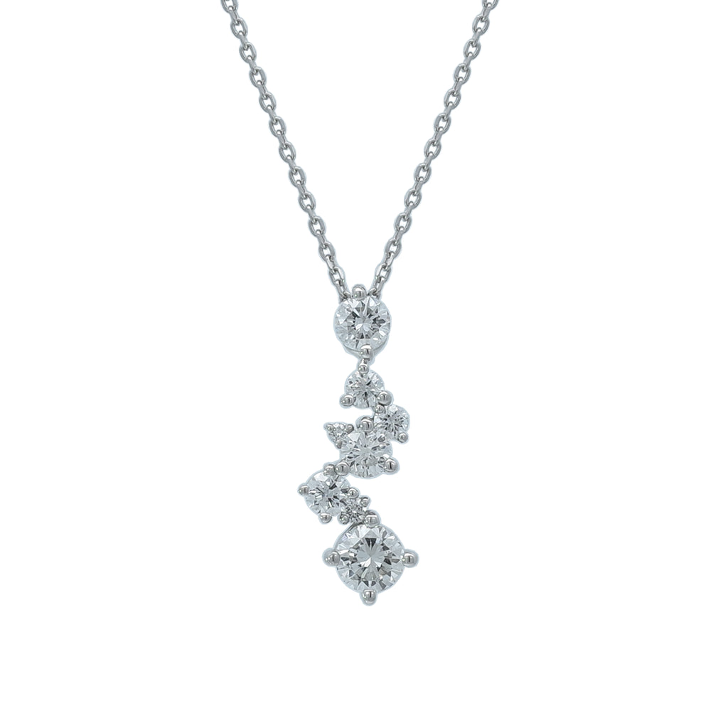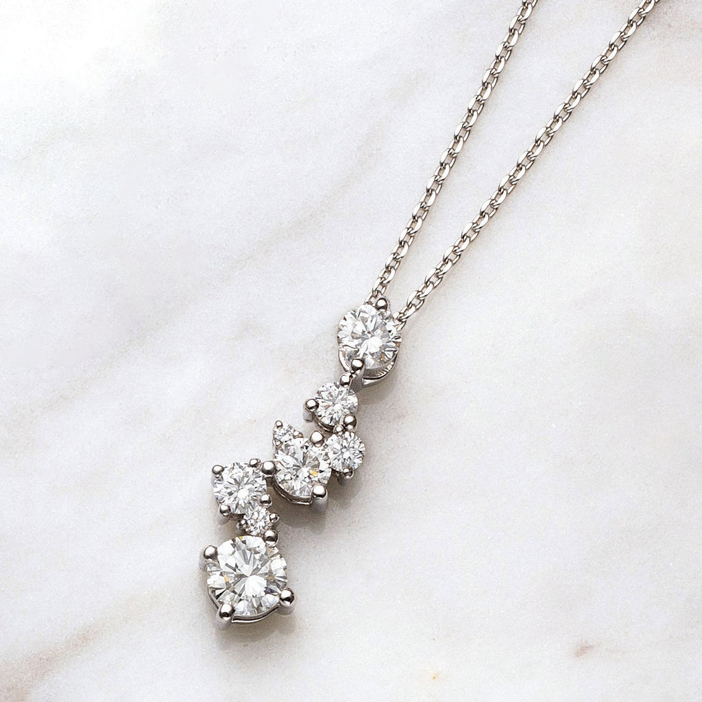 大きさの異なるメレダイヤから放たれる強弱のある輝きが楽しそうな雰囲気をつくり出します。胸元がパッと華やかになるネックレスです。