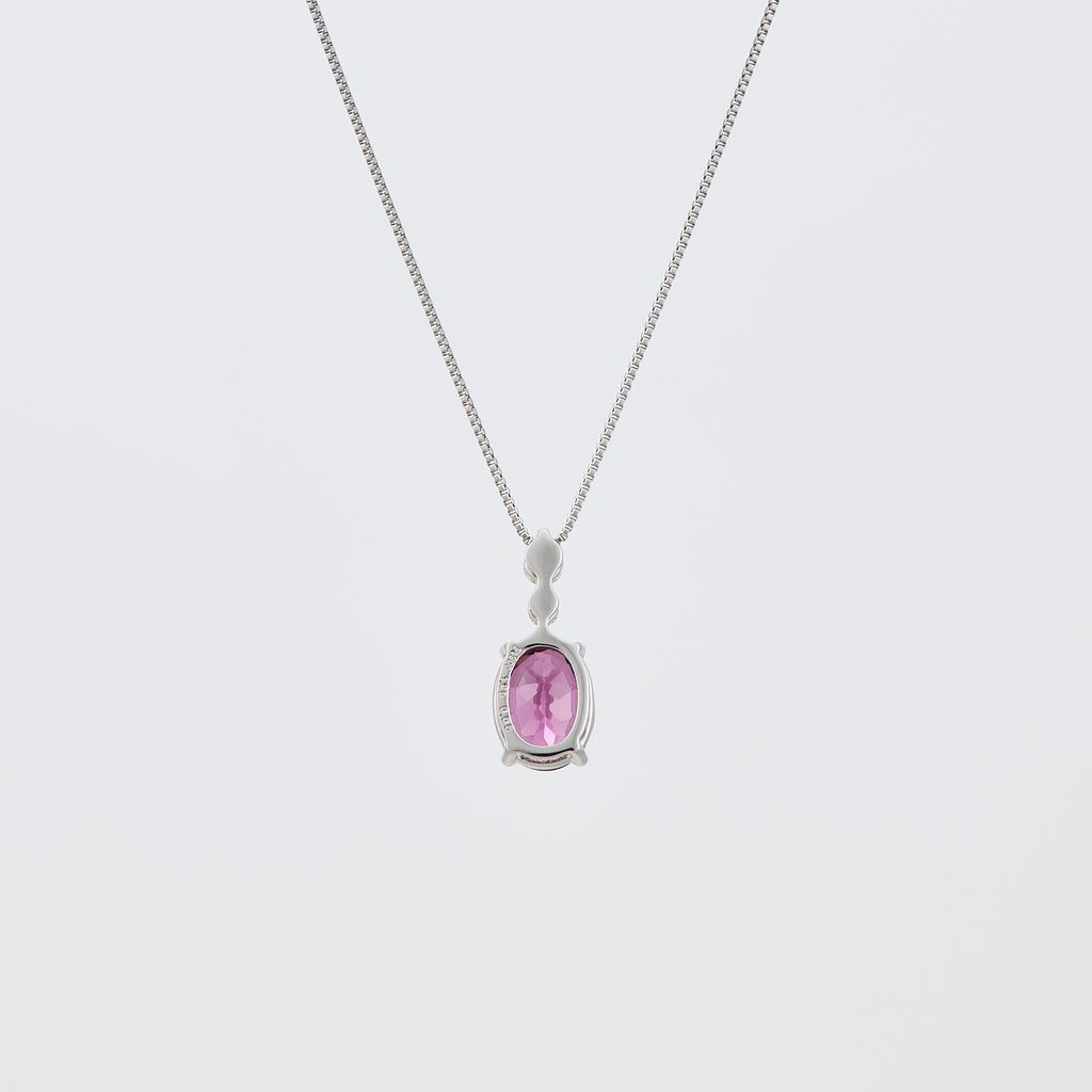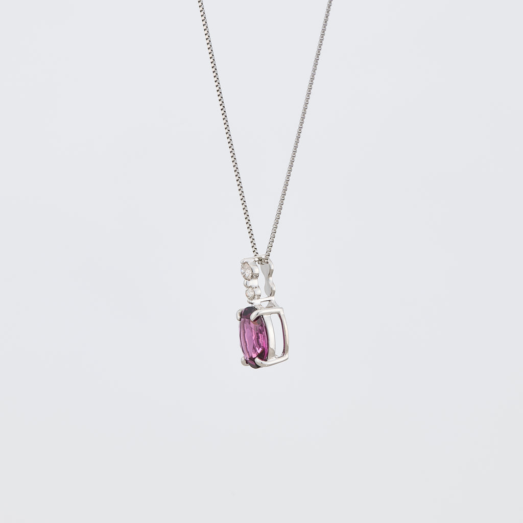 しっかりとした存在感を楽しめる大粒1.2ctのガーネットを使用。チェーンを通すバチカン部分に、縦に2石メレダイヤを留めたベーシックなデザインです。